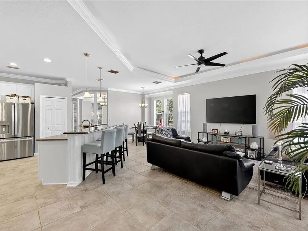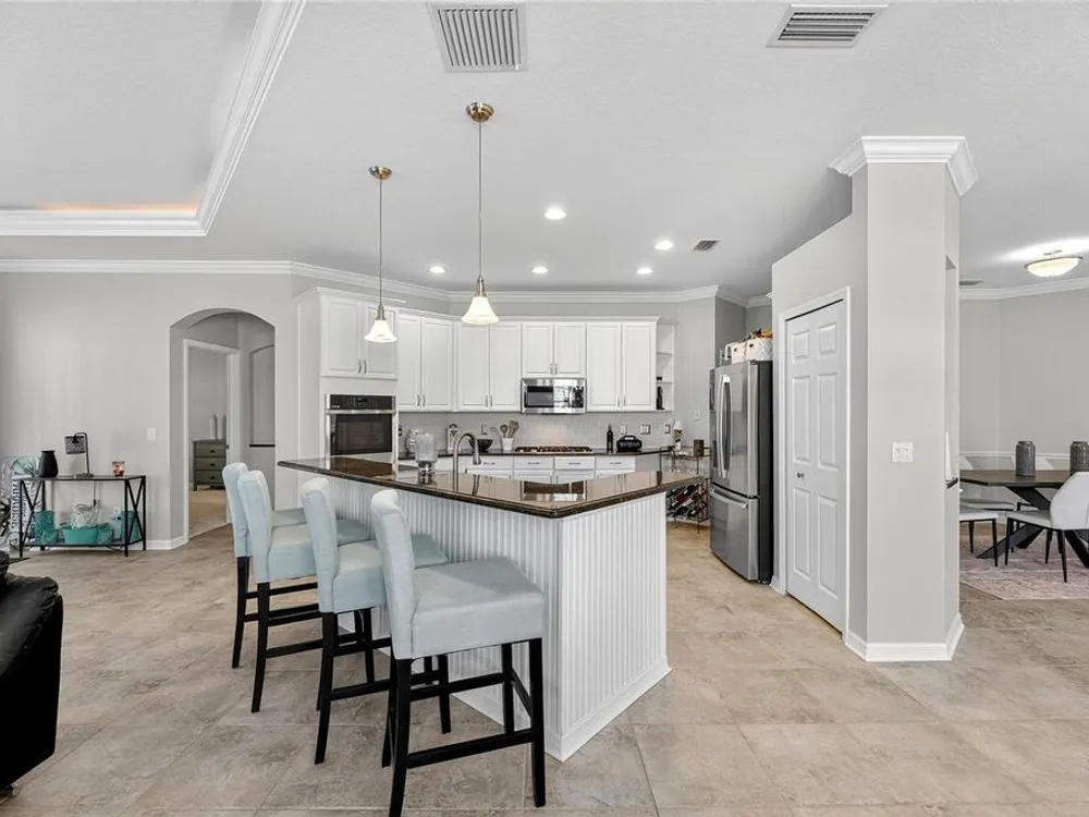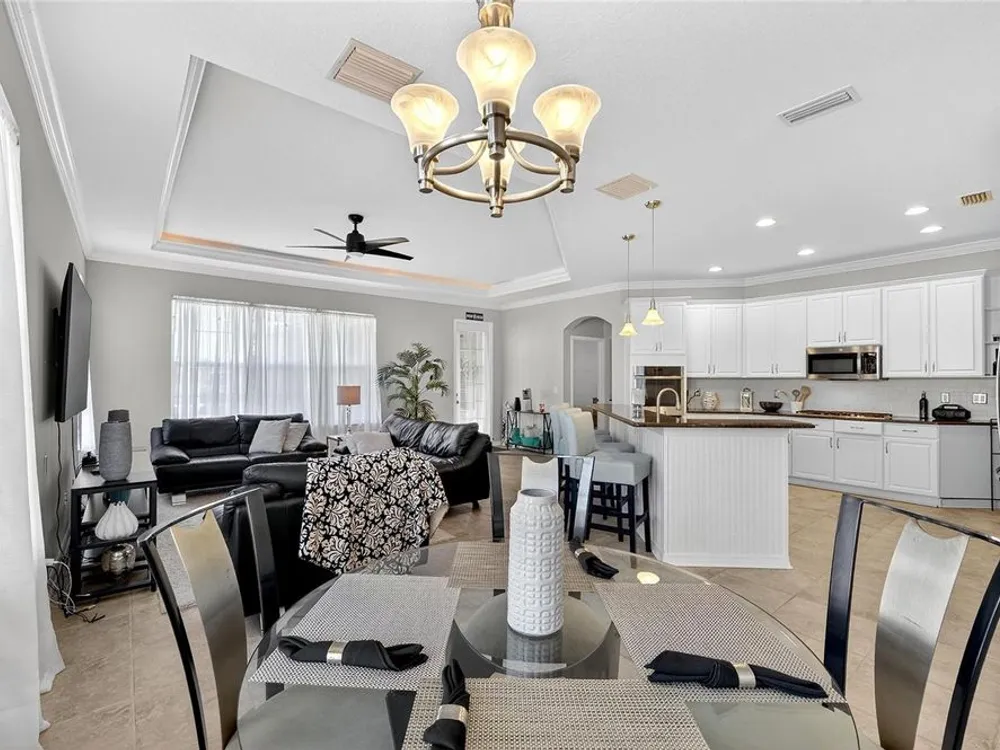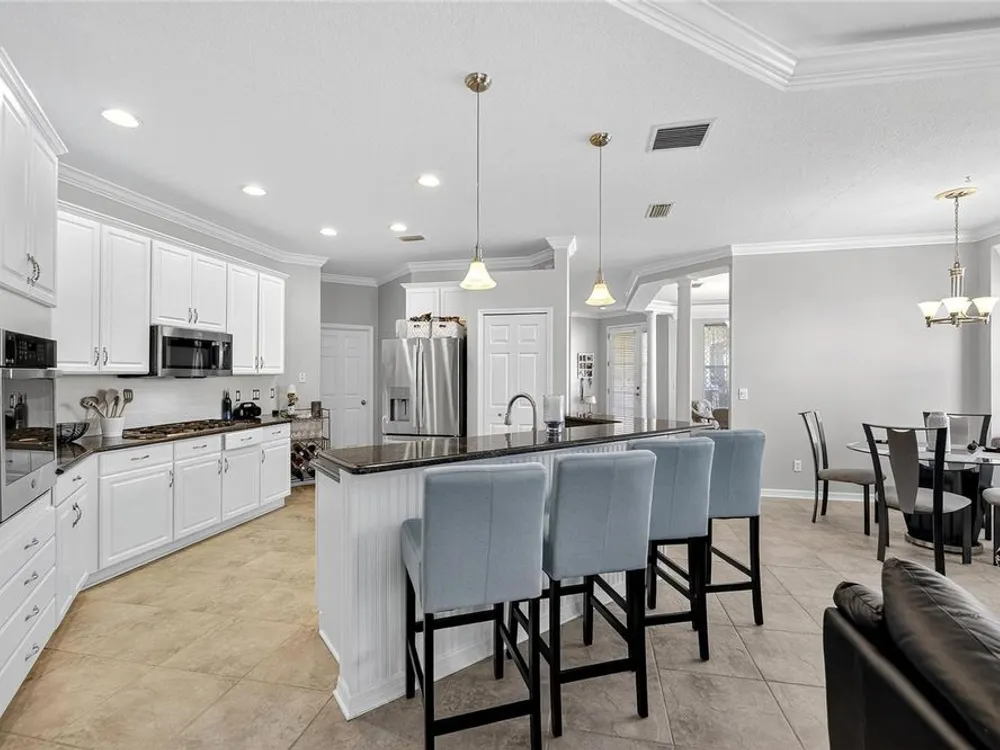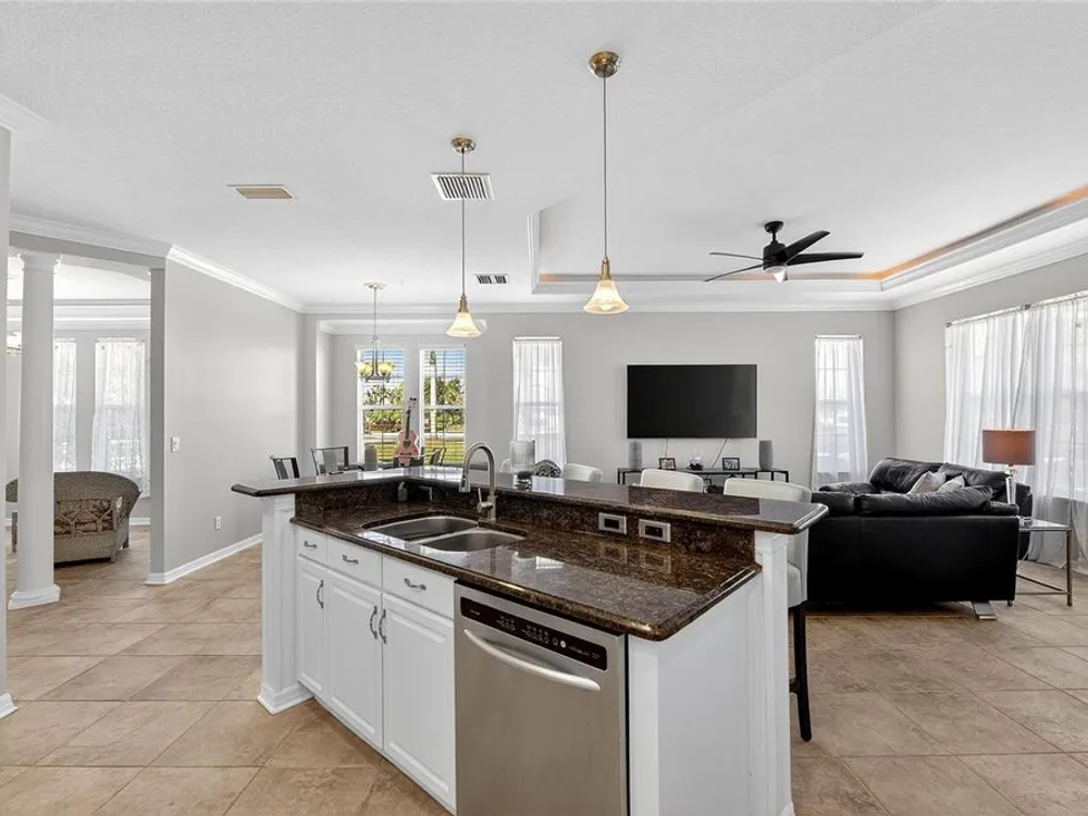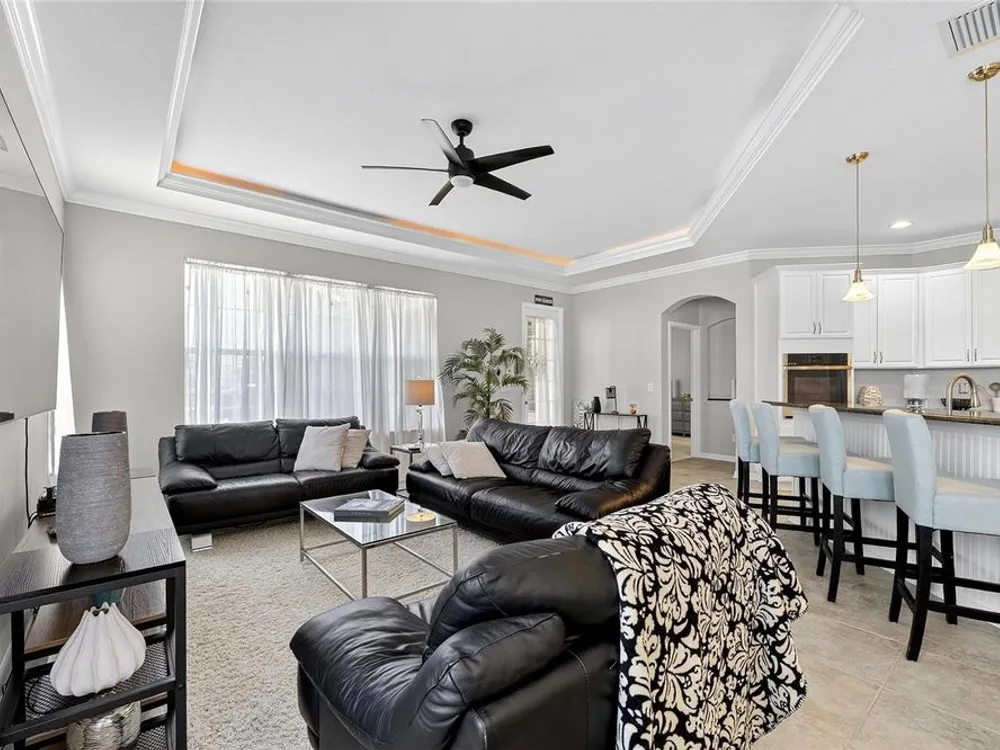 Welcome to MiraBay, where luxury and coastal tranquility meet! This beautifully maintained 3-bedroom, 2-bath villa in the coveted Sea Crest subdivision offers stunning pond views and resort-style living at its finest. Inside the Meridian floorplan, you’ll be greeted by elegant tray ceilings, stylish tile flooring, and an inviting open layout. The dining area overlooks the pond—perfect for intimate dinners or lively game nights—while the versatile living room can double as a home office or flex space. At the heart of the home, the kitchen and family room flow seamlessly together. The kitchen features a large island with breakfast bar, granite countertops, white cabinetry, and a chic tile backsplash—ideal for cooking and entertaining. Expansive windows in the family room bathe the space in natural light and open to a covered, screened lanai where you can relax and enjoy peaceful water views. The spacious primary suite is a true retreat, complete with pond views, a spa-like bath with soaking tub, dual vanities, and a walk-in closet. Two additional bedrooms and a full hall bath provide privacy and comfort for family or guests. Recent upgrades include: new roof (2022), new carpet & ceiling fans (2023), new AC & tankless water heater (Oct 2024), fresh interior paint (2024), new exterior paint (Spring 2025). Additional highlights: indoor laundry room with mud sink and storage, plus a private screened lanai perfect for enjoying Florida’s year-round sunshine. MiraBay offers unmatched amenities—sparkling pool with café, fitness center, splash pad, racquetball courts, and more—making this gated community one of the most desirable in the area. Villas here are rarely available, so don’t miss your chance—schedule a showing today!