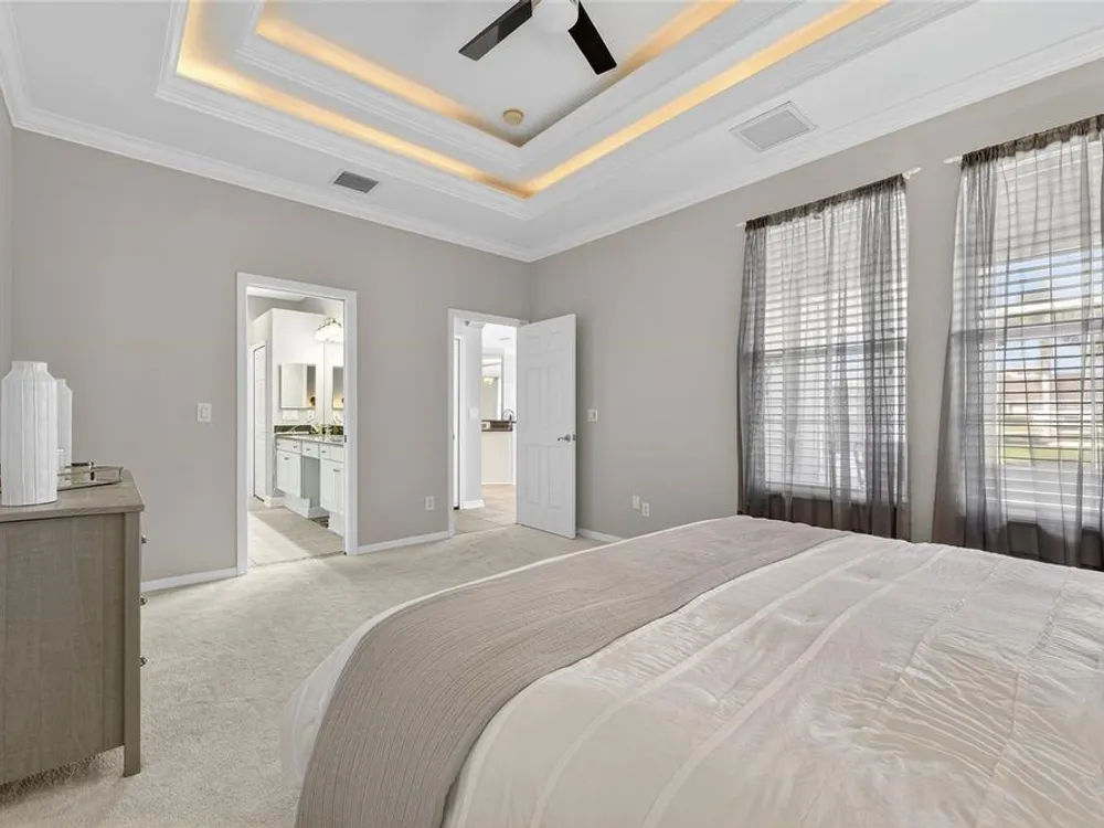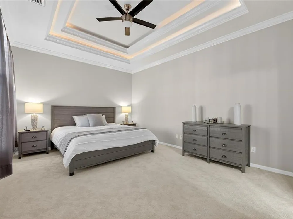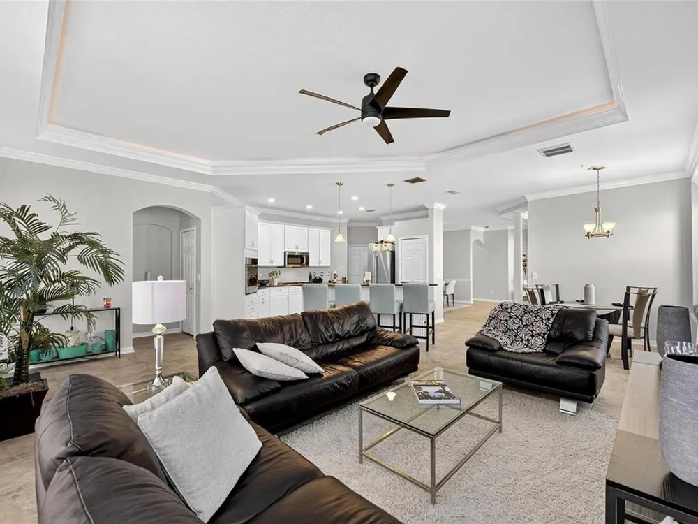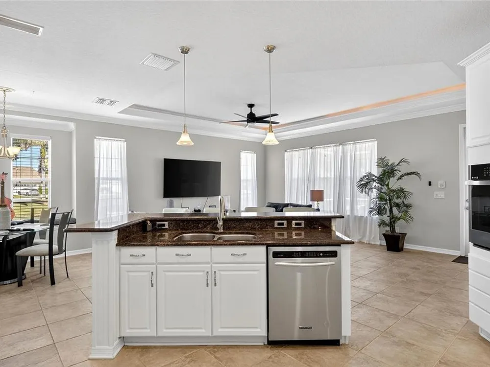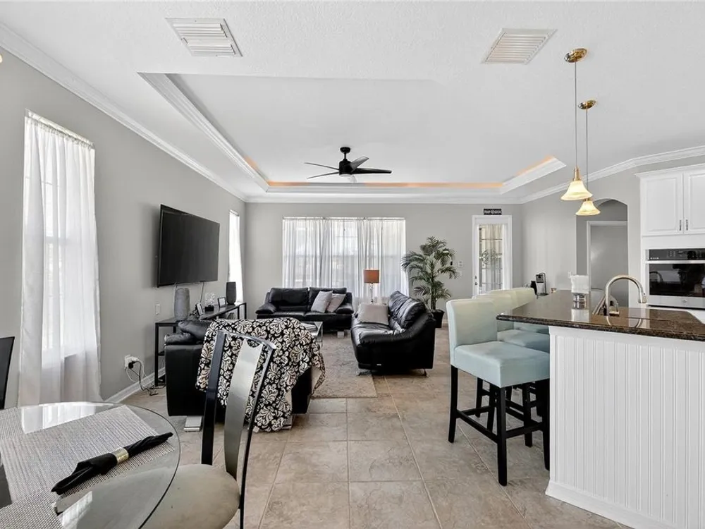 - Ceiling Fan(s), Eat-in Kitchen, High Ceilings, Kitchen/Family Room Combo, Living/Dining Room, Open Floorplan, Main Level Primary, Solid Surface Counters, Split Bedrooms, Tray Ceiling(s)