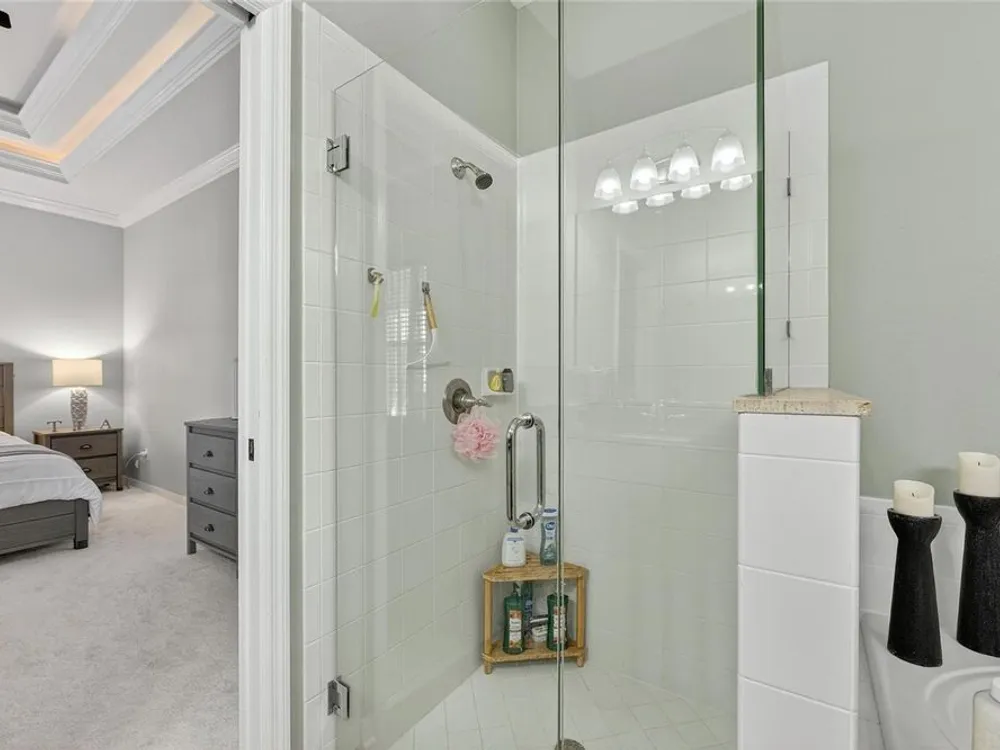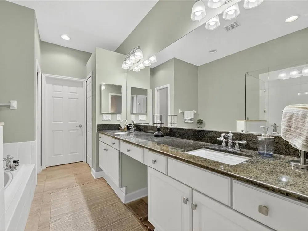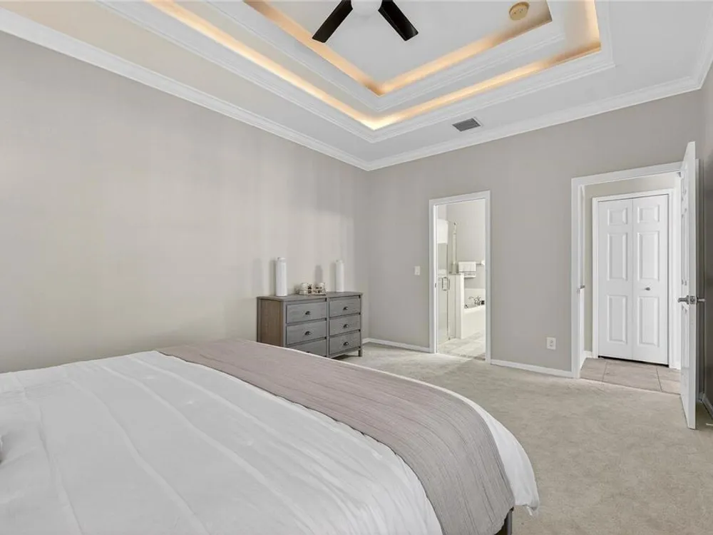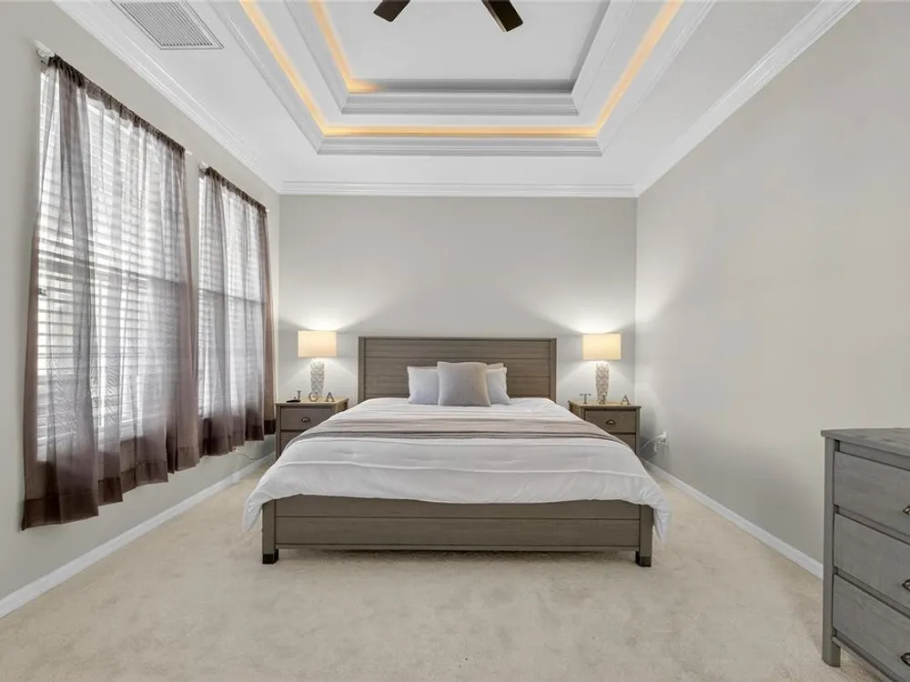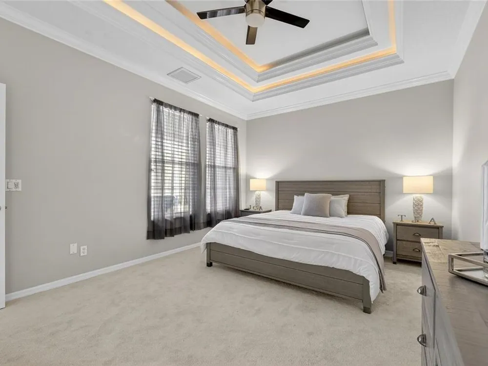 - Ceiling Fan(s), Eat-in Kitchen, High Ceilings, Kitchen/Family Room Combo, Living/Dining Room, Open Floorplan, Main Level Primary, Solid Surface Counters, Split Bedrooms, Tray Ceiling(s)