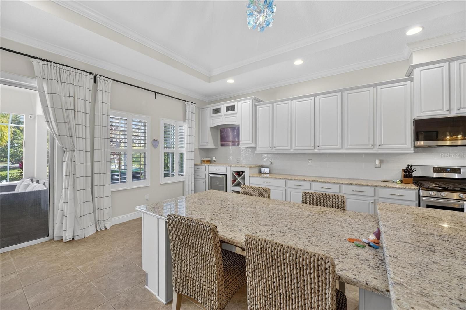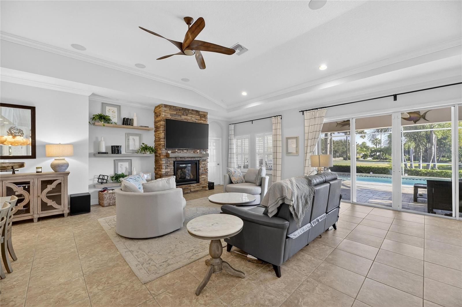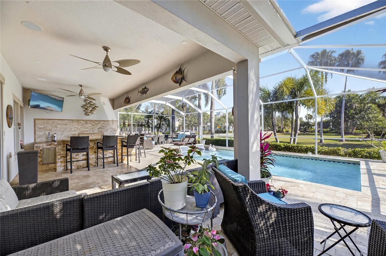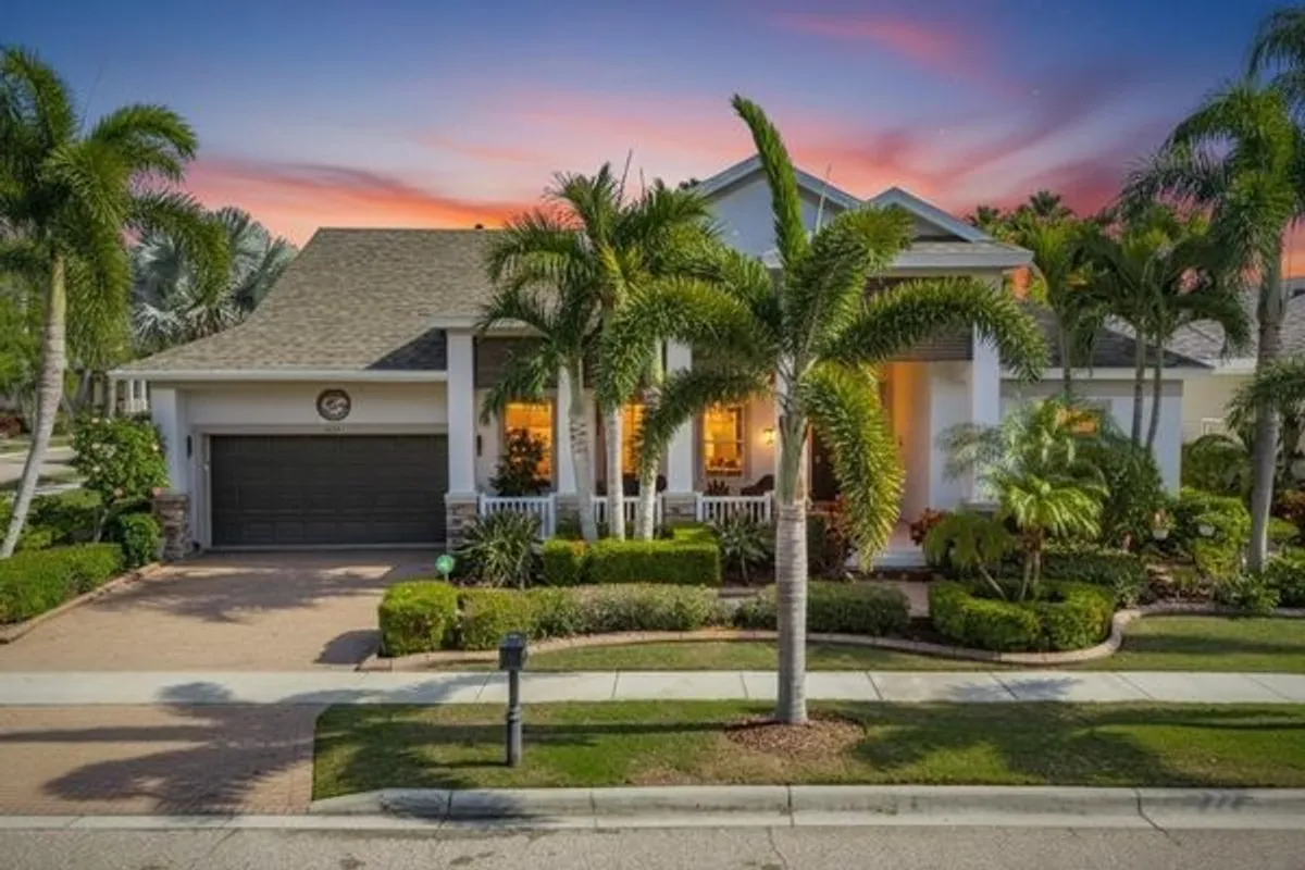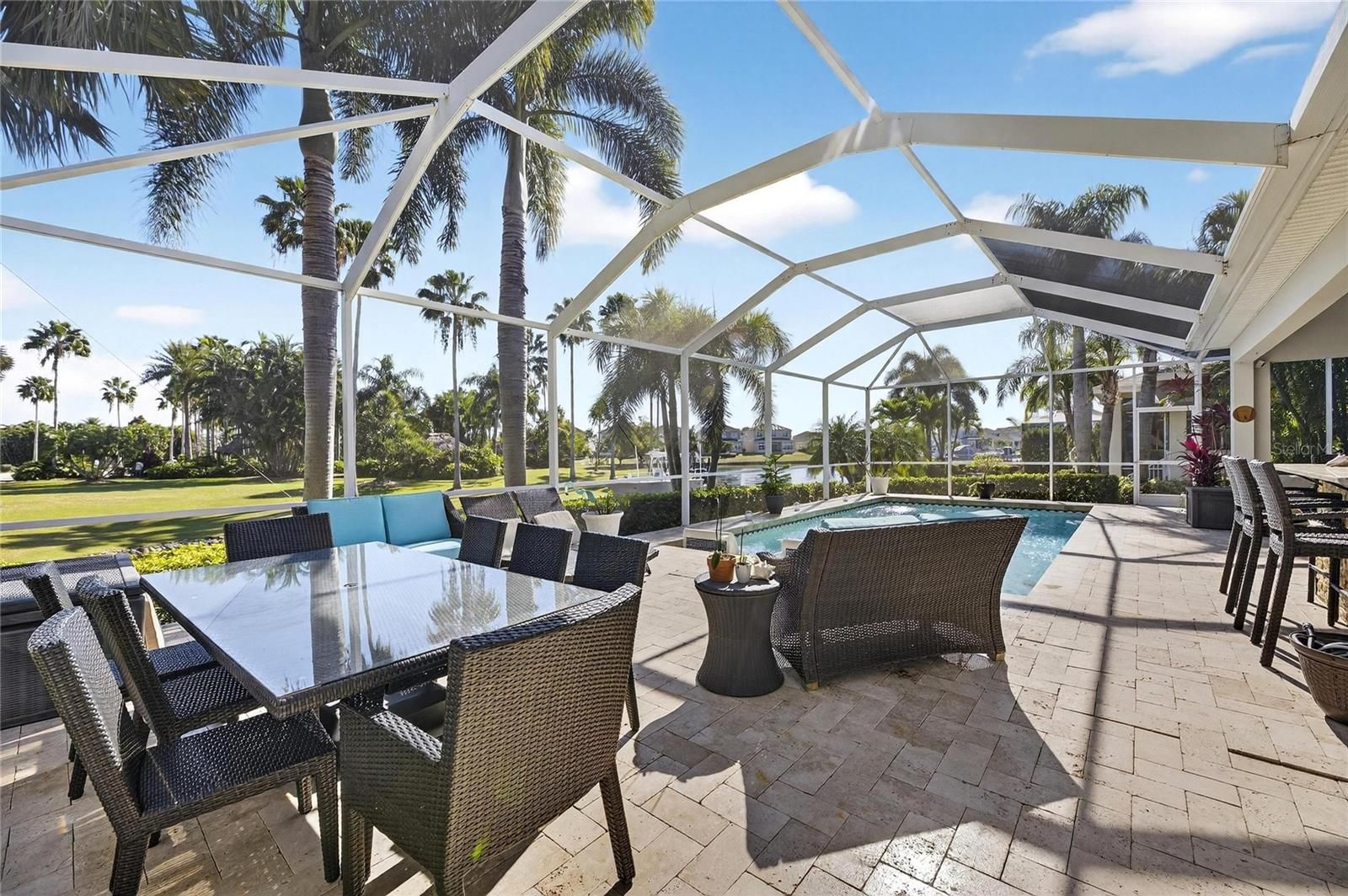 Venture into the elite, coastal community of MiraBay and discover your own piece of paradise, perfectly positioned on an over-sized corner lot with both water and park views. Beautifully landscaped with more than 24 palm trees, this impressive single-story home offers privacy, serenity, and stunning surroundings and set across the water from a lushly landscaped park on a quiet cul-de-sac. From the moment you step inside, the home makes a statement. A custom tile inlay in the foyer, elegant arched entryways, and thoughtfully curated finishes create an immediate sense of warmth and sophistication that will “wow” you and your guests every time. The heart of the home is the expansive gourmet kitchen, designed for both everyday living and unforgettable gatherings. Featuring updated cabinetry, granite countertops, a designer backsplash, all-new stainless steel appliances, a wine bar, and a massive island with a custom granite table extension, this space was made for entertaining. Hosting holiday celebrations will never be the same, while friends and family cozy up by the gas fireplace with remote, others gather in the kitchen baking cookies, sipping hot chocolate, and creating memories that last a lifetime. The primary suite is a true retreat, offering tranquil water views, a fully remodeled spa-inspired bathroom, a custom-designed walk-in closet, and a bifolding glass door with screen that opens directly to the outdoor living space that’s perfect for embracing Florida’s indoor-outdoor lifestyle. This thoughtfully designed home includes five bedrooms, all with ceiling fans, providing comfort and flexibility for family, guests, or home offices. Two additional bathrooms feature updated vanities, and specialty light fixtures throughout the home add a refined, designer touch. Outdoor living truly steals the show. Step through the sliders onto the expansive lanai featuring travertine flooring, a fully remodeled outdoor kitchen and grill area with refrigerator, sink, and separate ice machine, and a sparkling chlorine-based pool. While the property sits on a non-dockable lot, it delivers exceptional water views and peaceful park-front living—ideal for those who want the beauty of the waterfront without the need for boat access. Additional upgrades include: * Brand-new roof (January 2025) * Plantation shutters throughout the entire home (excluding garage window and lanai slider) * Updated laundry room cabinetry and countertops * New resin garage floor * Built-in garage storage racks * Finished attic space with drop-down steel ladder * Exterior garage keypad entry * Ring cameras on the front porch and rear lanai * Sprinkler system for the lawn and landscaping Select furnishings are negotiable, offering a rare opportunity to move in with ease and enjoy this exceptional home from day one. This home is designed for those who desire water views, space, and elegance without the need for water access. If that sounds like you… welcome home.