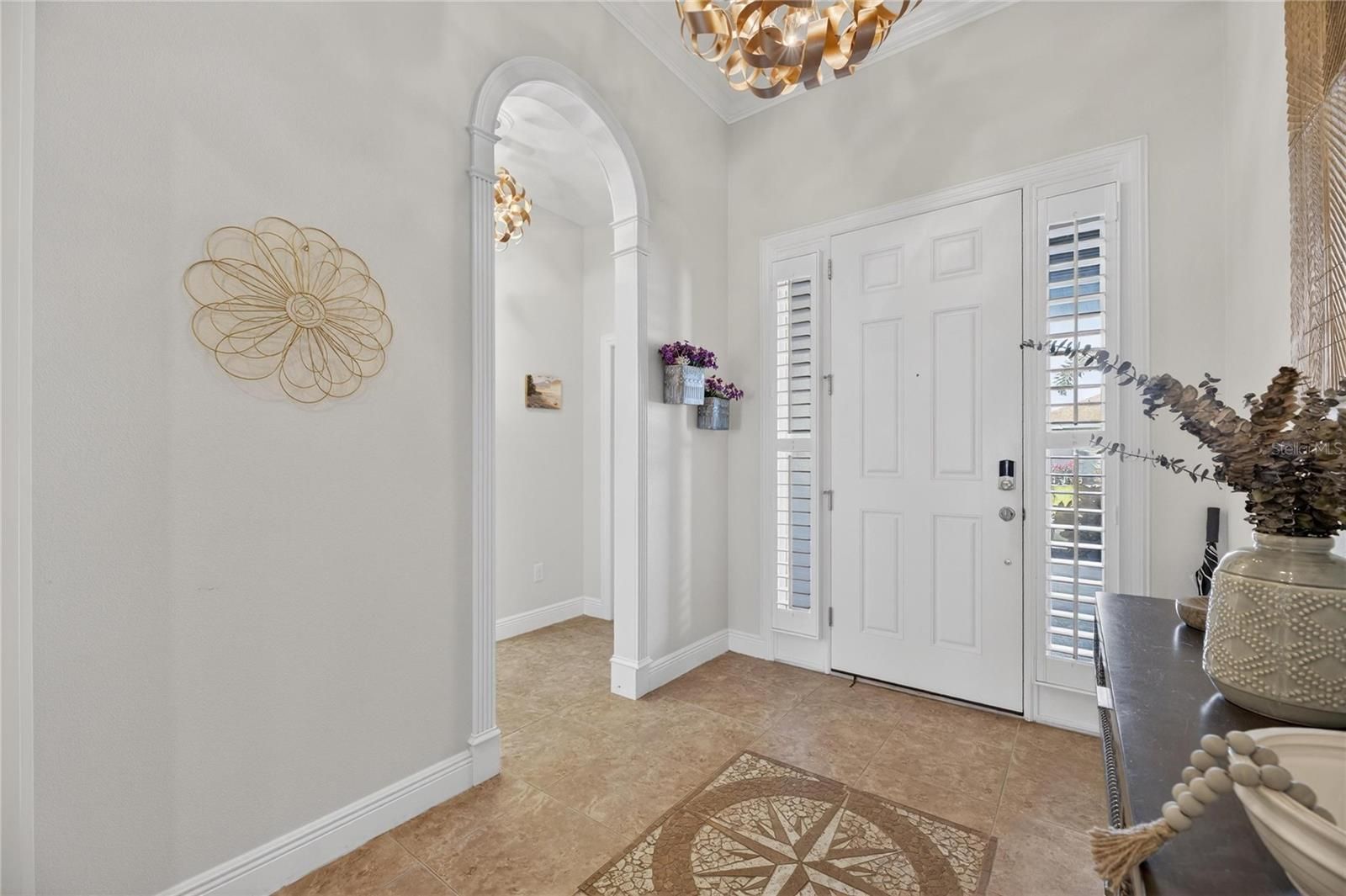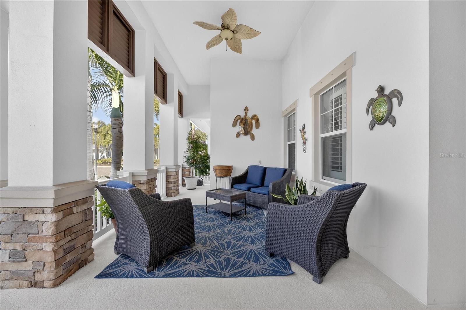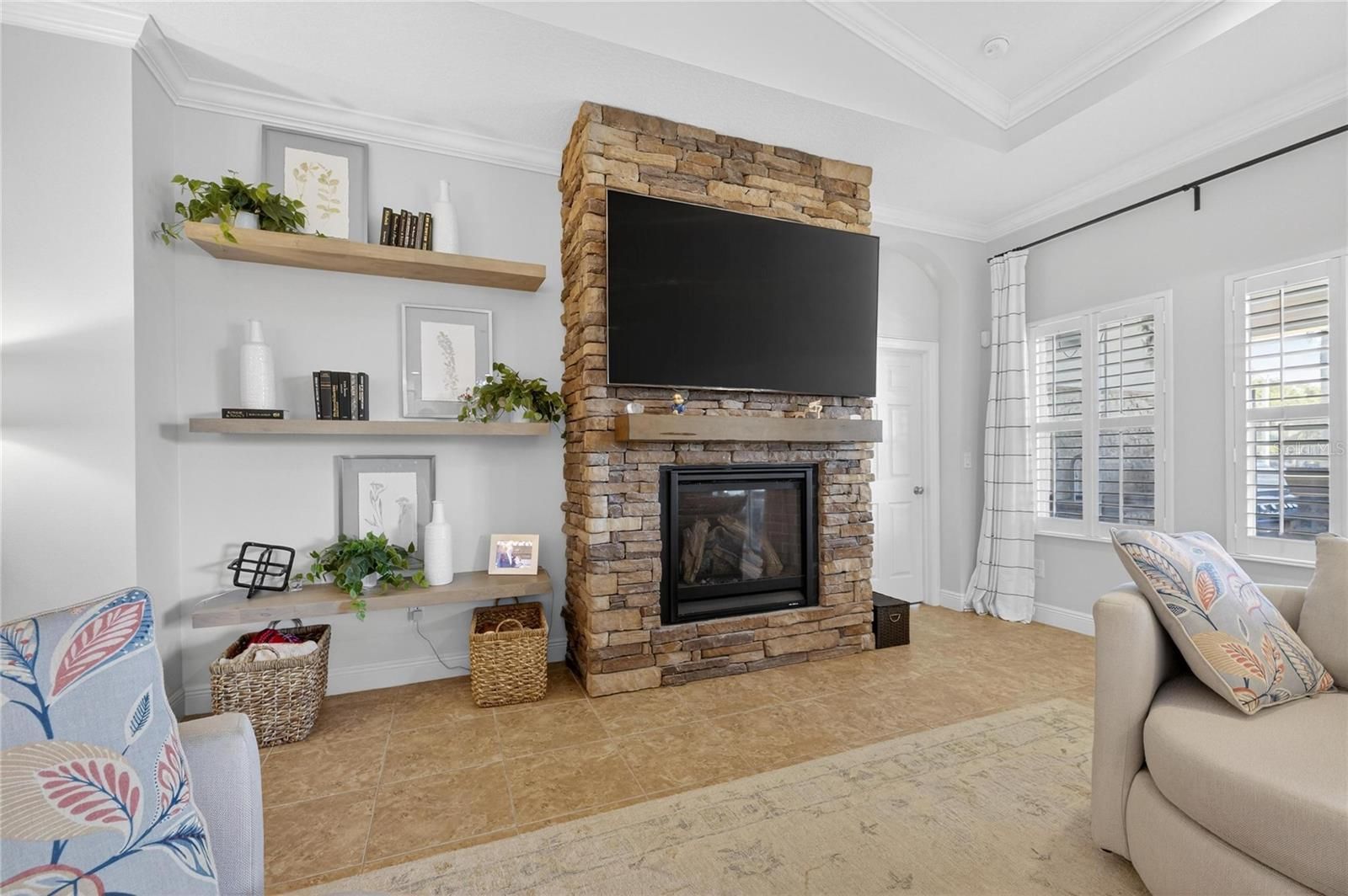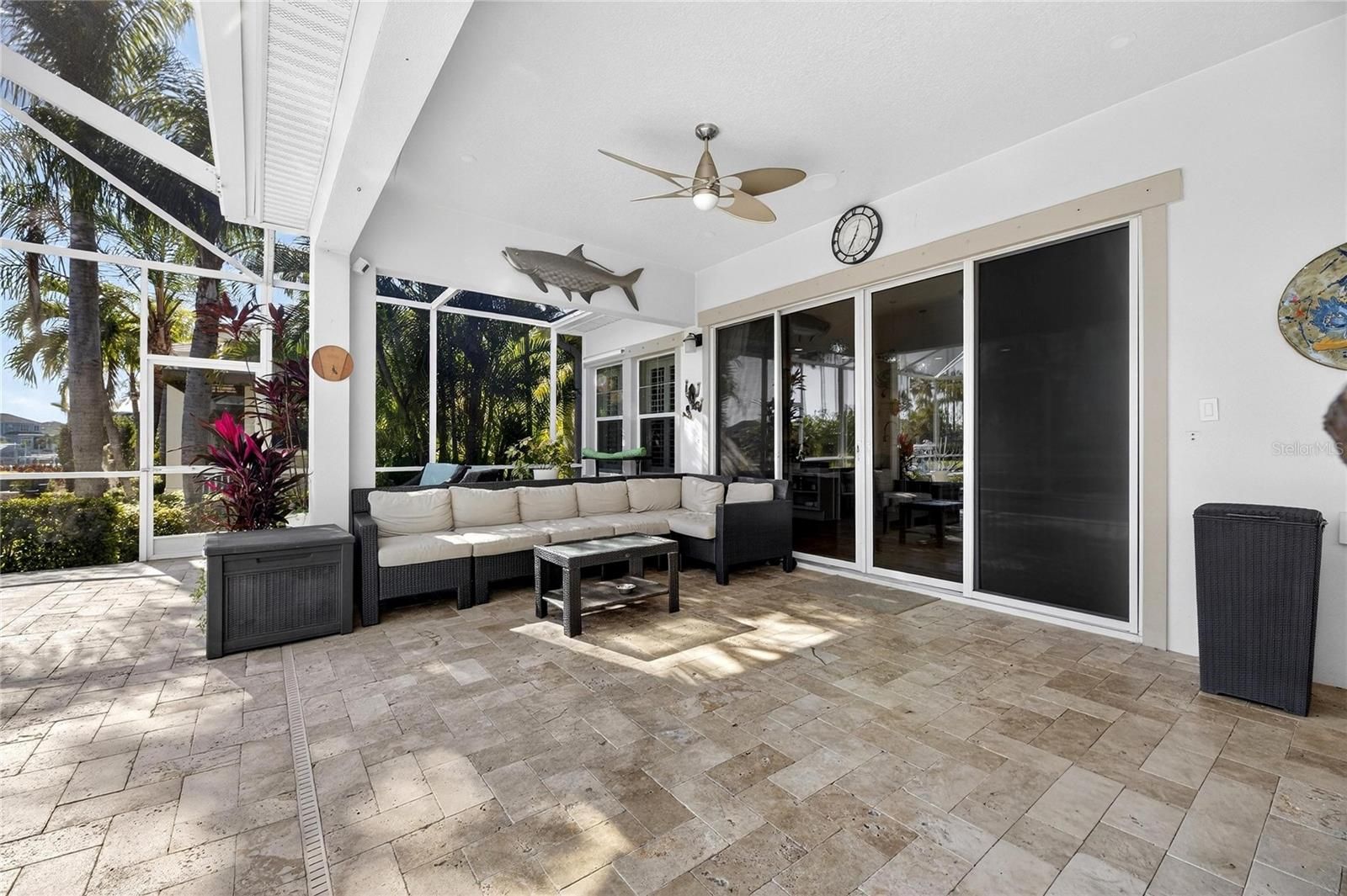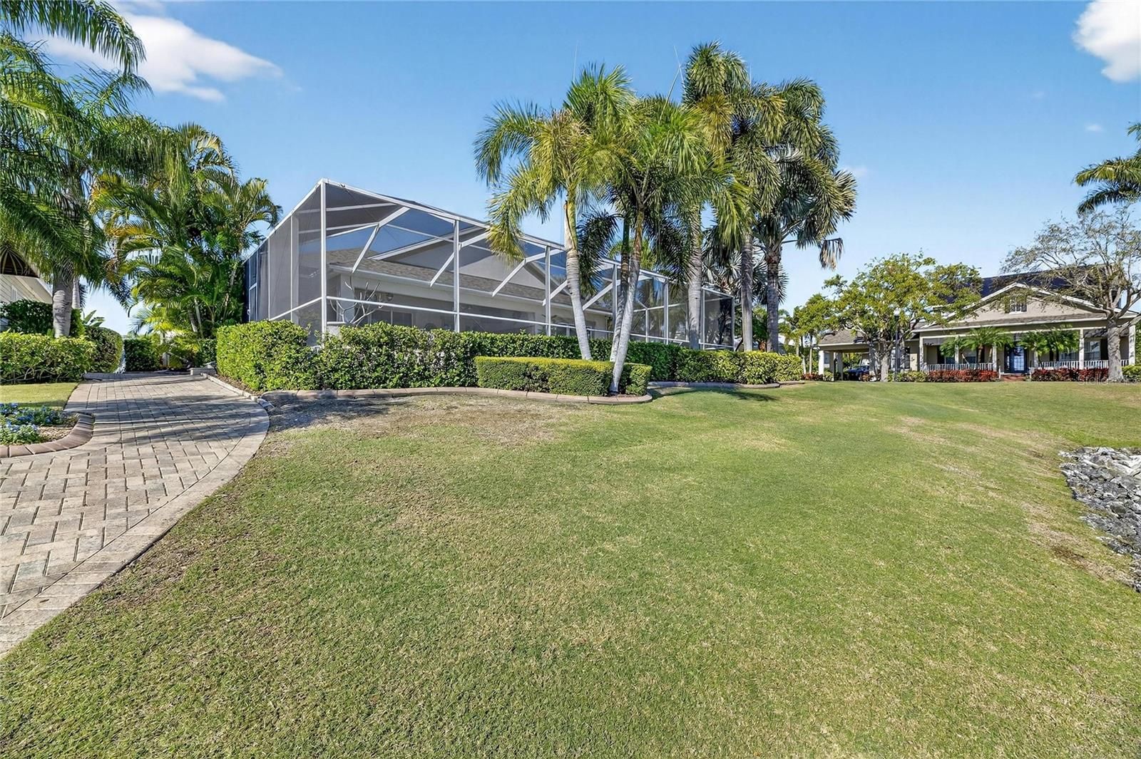 Venture into the elite, coastal community of MiraBay and discover your own piece of paradise, perfectly positioned on an over-sized corner lot with both water and park views. Beautifully landscaped with more than 24 palm trees, this impressive single-story home offers privacy, serenity, and stunning surroundings and set across the water from a lushly landscaped park on a quiet cul-de-sac. From the moment you step inside, the home makes a statement. A custom tile inlay in the foyer, elegant arched entryways, and thoughtfully curated finishes create an immediate sense of warmth and sophistication that will “wow” you and your guests every time. The heart of the home is the expansive gourmet kitchen, designed for both everyday living and unforgettable gatherings. Featuring updated cabinetry, granite countertops, a designer backsplash, all-new stainless steel appliances, a wine bar, and a massive island with a custom granite table extension, this space was made for entertaining. Hosting holiday celebrations will never be the same, while friends and family cozy up by the gas fireplace with remote, others gather in the kitchen baking cookies, sipping hot chocolate, and creating memories that last a lifetime. The primary suite is a true retreat, offering tranquil water views, a fully remodeled spa-inspired bathroom, a custom-designed walk-in closet, and a bifolding glass door with screen that opens directly to the outdoor living space that’s perfect for embracing Florida’s indoor-outdoor lifestyle. This thoughtfully designed home includes five bedrooms, all with ceiling fans, providing comfort and flexibility for family, guests, or home offices. Two additional bathrooms feature updated vanities, and specialty light fixtures throughout the home add a refined, designer touch. Outdoor living truly steals the show. Step through the sliders onto the expansive lanai featuring travertine flooring, a fully remodeled outdoor kitchen and grill area with refrigerator, sink, and separate ice machine, and a sparkling chlorine-based pool. While the property sits on a non-dockable lot, it delivers exceptional water views and peaceful park-front living—ideal for those who want the beauty of the waterfront without the need for boat access. Additional upgrades include: * Brand-new roof (January 2025) * Plantation shutters throughout the entire home (excluding garage window and lanai slider) * Updated laundry room cabinetry and countertops * New resin garage floor * Built-in garage storage racks * Finished attic space with drop-down steel ladder * Exterior garage keypad entry * Ring cameras on the front porch and rear lanai * Sprinkler system for the lawn and landscaping Select furnishings are negotiable, offering a rare opportunity to move in with ease and enjoy this exceptional home from day one. This home is designed for those who desire water views, space, and elegance without the need for water access. If that sounds like you… welcome home.