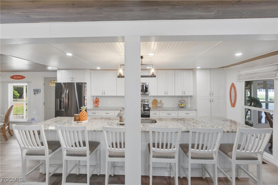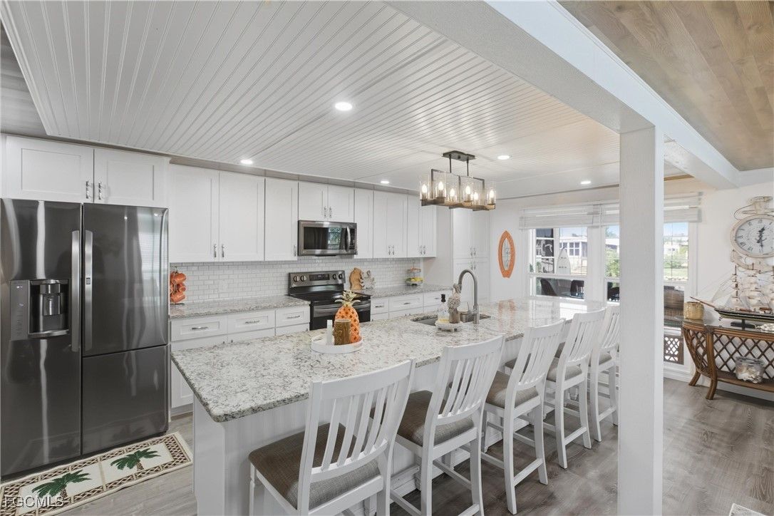 Affordable Coastal Living at it Finest! Welcome to 5517 Sir Walter Way located in Old Bridge Village. Prepare to be captivated by breathtaking views from your two beautiful lanais. This remarkable home is perfectly situated on a wide canal, providing the ultimate waterfront living experience. The home has had a renovation, featuring new windows, insulated walls, 3/4 plywood, and luxury vinyl floors. The kitchen is the cook's dream for entertaining and conversations as it showcases a huge island with new countertops and appliances. A spacious master bedroom and bath, complete with dual sinks, ensure you have all the space you desire. This fantastic home includes a trek dock for your boat giving you easy access to the Gulf of Mexico. Enjoy resort-style 55 + gated community nestled along Caloosahatchee River. Embrace the vibrant lifestyle of fitness center, tennis, Pickleball, and shuffleboard just to name a few. Brand new pool and hot tub to unwind and relax. The 81-slip marina, complete with boat and kayak launch. Don't miss this chance to experience the beauty of waterfront living in a vibrant community. See yourself and embrace the ultimate waterfront dream! This home would make a great vacation rental for your income-producing property.