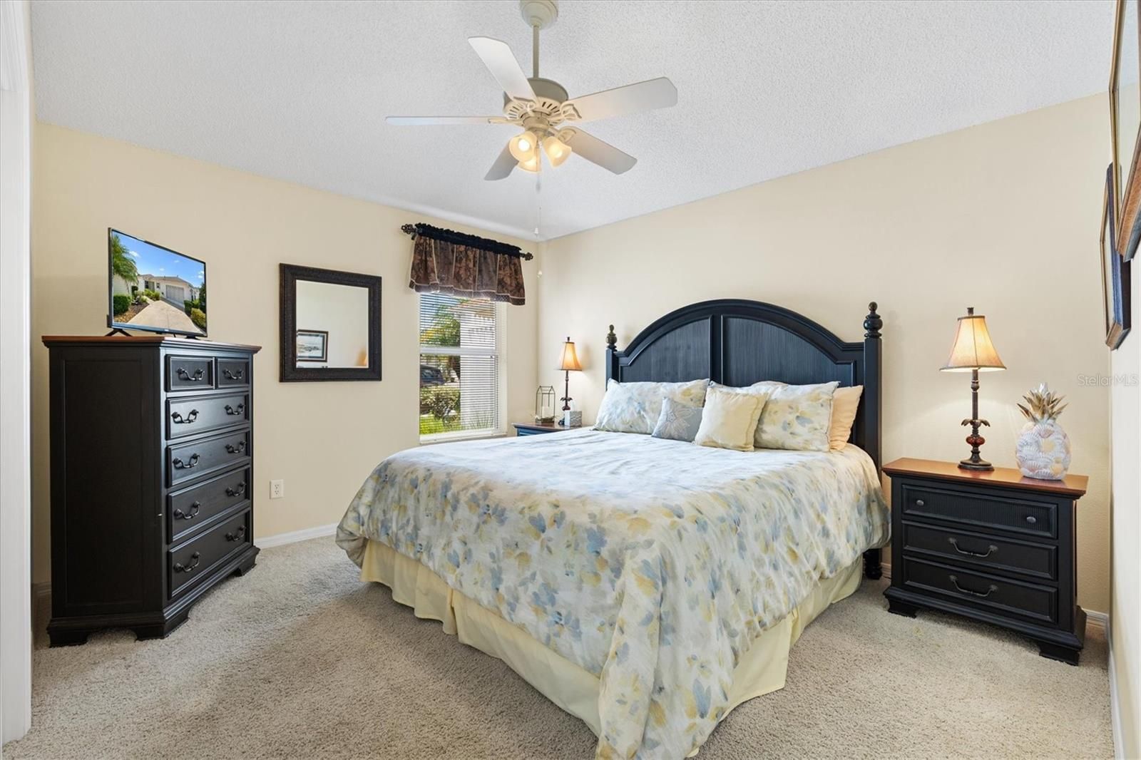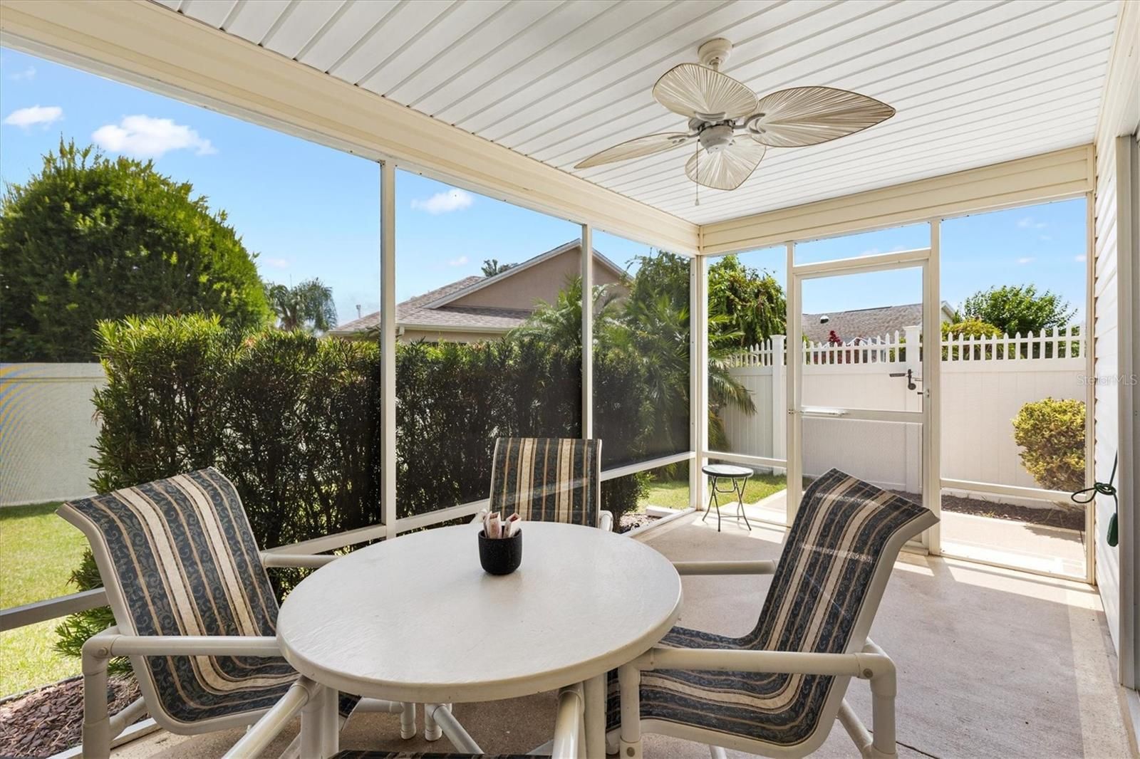 Under contract-accepting backup offers. NEW ROOF NEGOTIABLE! Turnkey 3-bedroom, 2-bathroom Bonita Courtyard Villa in the Village of Amelia. Built with modern living in mind, this home features a 2007 HVAC system and a brand-new 2023 gas water heater. Step outside to enjoy a lush grass backyard or relax in the screened lanai and use the patio right off the dining room for grilling and entertaining. The interior boasts elegant plantation shutters in public areas, a phantom screen front door for added ventilation, and sliding screen doors on the garage for convenience. With luxury vinyl plank flooring, cozy carpet in two bedrooms, and durable linoleum in wet areas, this home is designed for both style and practicality. High ceilings and ceiling fans with light kits add to the airy ambiance, while the open floor plan and split bedroom layout ensure privacy and convenience. The thoughtfully designed split bedroom layout includes a pocket door for the guest bedroom and bath, ensuring privacy for you and your guests. Both bathrooms feature beautiful granite countertops. The master bedroom offers direct access to the lanai, complemented by an ensuite bath featuring dual sinks and a spacious shower. The third guest bedroom, which can double as an office, features LVP floors and a comfortable sofa bed. An interior laundry room adds to the convenience of this home. Located just a short walk from the Odell Recreation Center and Pool, and less than a mile from the Mallory Hill Country Club, golf, and Amelia Pool, this villa is perfectly situated for an active lifestyle. golf cart is available separately! Don’t miss the opportunity to make this beautiful villa your new home and start living the Villages dream.