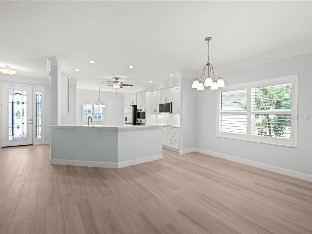 - Ceiling Fan(s), Crown Molding, Eat-in Kitchen, Living/Dining Room, Open Floorplan, Solid Surface Counters, Split Bedrooms, Walk-In Closet(s), Window Treatments