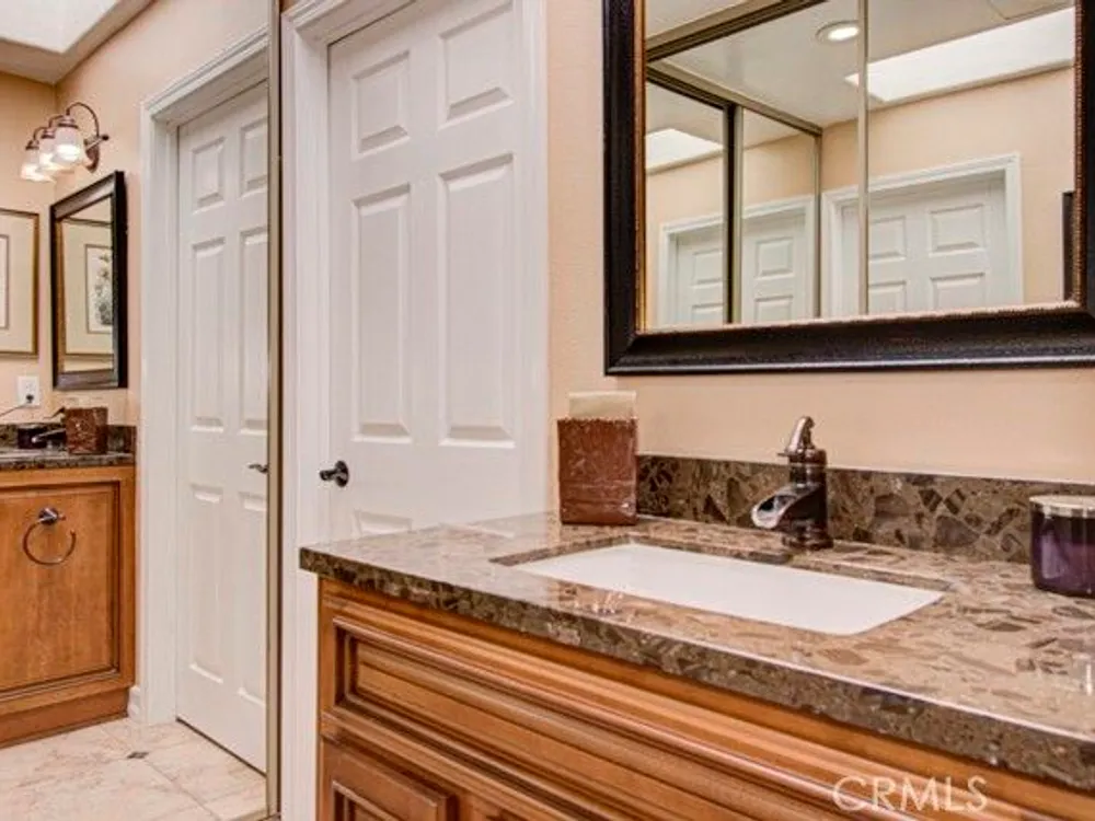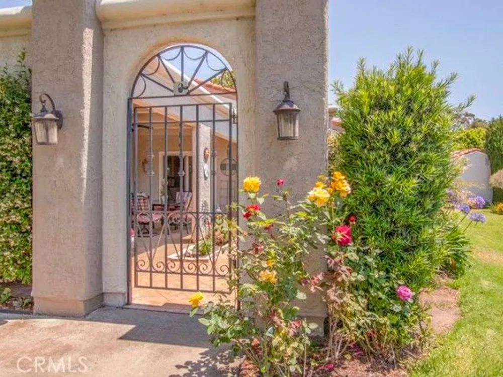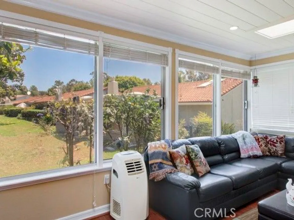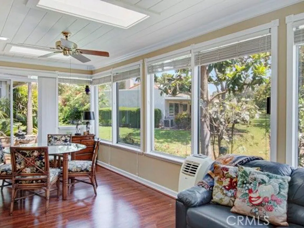 Welcome to 5521-C Via La Mesa – a beautiful remodeled two-bedroom, two-bath, single-level, end-unit VILLA FRANCESCA residence in an idyllic setting in the Laguna Woods senior community. The enormous enclosed rear sunroom adds approximately 250 square feet of additional living space. The sunroom gets the early morning sun and has multiple skylights and boasts a gorgeous outlook with a view of endless greenbelt and trees stretching into the distance. With excellent curb appeal, the entry to this residence will surely impress visitors with its immaculate tasteful landscaping. Visitors are greeted by a lovely custom front door with attractive etched glass inserts. This popular floorplan offers twin primary suites with a large central living room. The spacious living room features a high ceiling, solar tube and direct access to the enclosed rear sunroom. (Both of the bedrooms also have direct access). The remodeled kitchen is simply stunning, featuring attractive wood cabinetry with soft-close drawers, separate trash/recycling drawer, pots and pans drawer, granite countertops with gorgeous tile backsplash, stainless steel appliances and large skylights. Custom closets in both bedrooms provide ample storage. Both baths have skylights as well as marble countertops and oversized showers with seats, grab bars and convenient accessory shelves. Upgrades throughout the residence include smooth ceilings, crown molding and baseboards, recessed lighting, dual-pane windows and beautiful walnut flooring. Ceiling fans can be found in the living room, both bedrooms and the front and rear patios. The large covered front courtyard provides the perfect space for year-round all-weather entertaining, dining and relaxing. There is even room in this covered courtyard to store a golf cart A small open patio sits just off the enclosed rear sunroom. The single-car garage has washer-dryer hookups, utility sink, cabinet storage and direct access into the residence via a service door into the kitchen. The driveway can accommodate an additional vehicle and there is ample street parking for guests. Do not miss this spectacular home!
