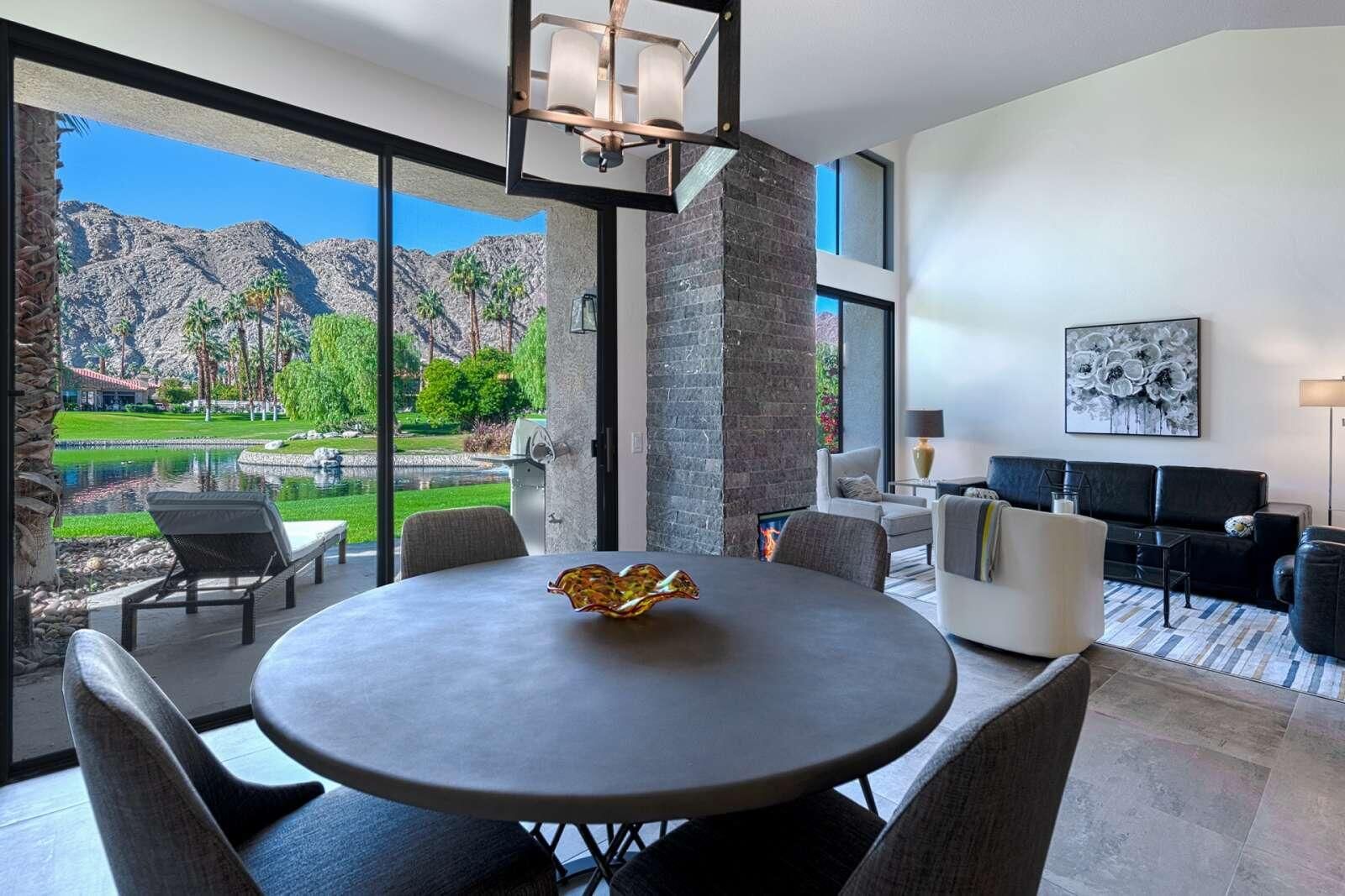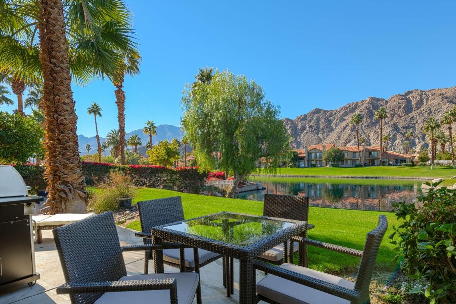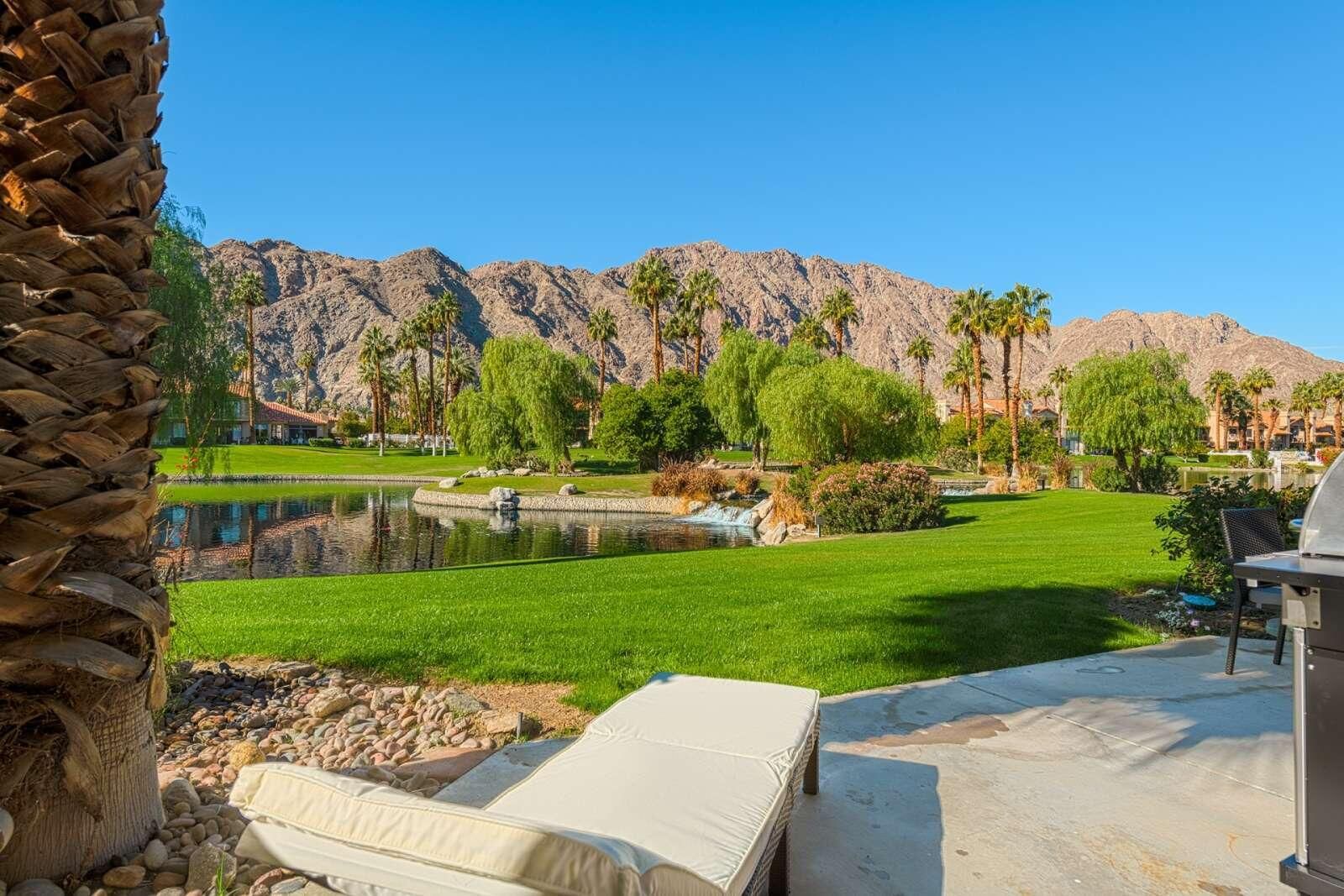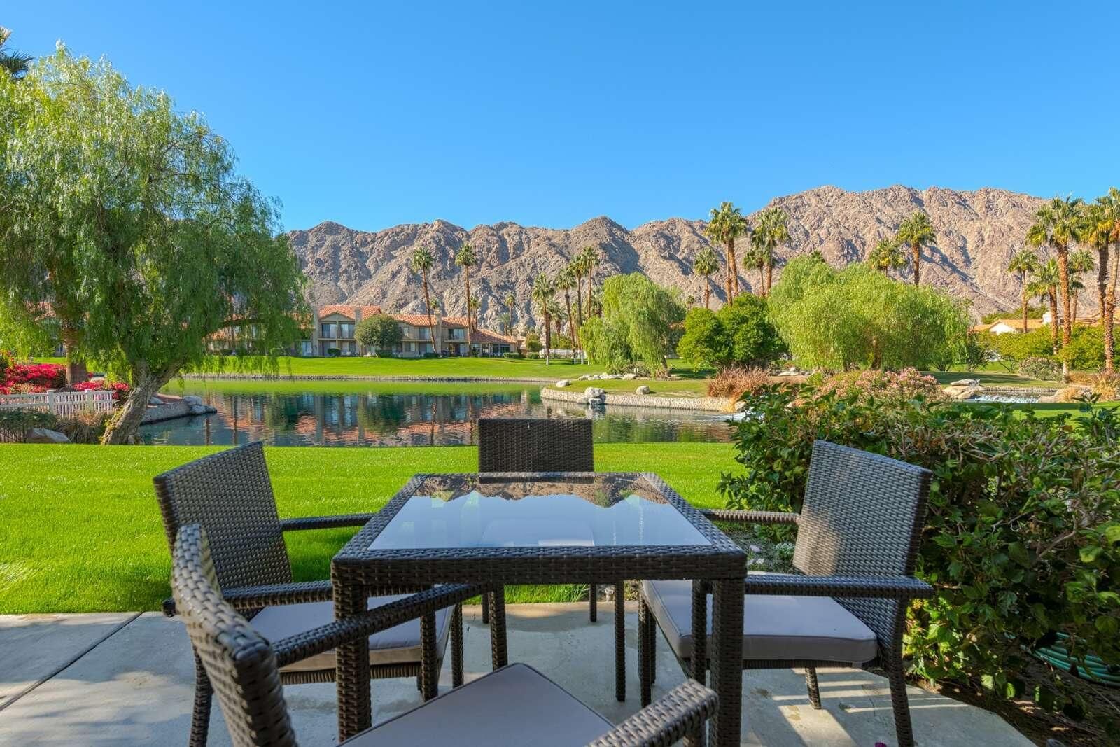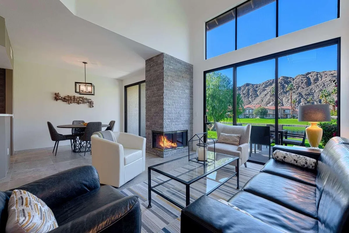 Best Views in PGA West - Palmer Private! This beautifully remodeled 3-bedroom, 2.5-bath condo offers approximately 1,621 sq. ft. of bright and airy living space with breathtaking Santa Rosa Mountain and serene private lake views. Located inside the prestigious PGA West through the exclusive Palmer Private gate, this home truly captures the essence of desert resort living. Soaring cathedral ceilings create an open and spacious atmosphere, while the thoughtful renovation brings modern comfort and style throughout. The redesigned kitchen features quartz countertops, designer tile, new cabinetry, and stainless steel appliances, complemented by recessed LED lighting, designer fixtures, and a stunning stacked stone fireplace with contemporary fire glass. Additional upgrades include 24'' x 24'' designer porcelain tile flooring on the main level, updated porcelain wood look plank tile flooring in the upstairs bathrooms, and a stylish freestanding wine and cocktail bar. Step outside to your private patio overlooking the lake, perfectly positioned to take in the spectacular Santa Rosa Mountain views and stunning desert sunsets. The home is also conveniently located just steps from the community pool and spa, making it easy to enjoy the resort lifestyle. Major systems have also been updated, including new AC and heating installed in 2019. Offered turnkey furnished and move-in ready Tenant occupied, cannot show this property until 4-1-2026