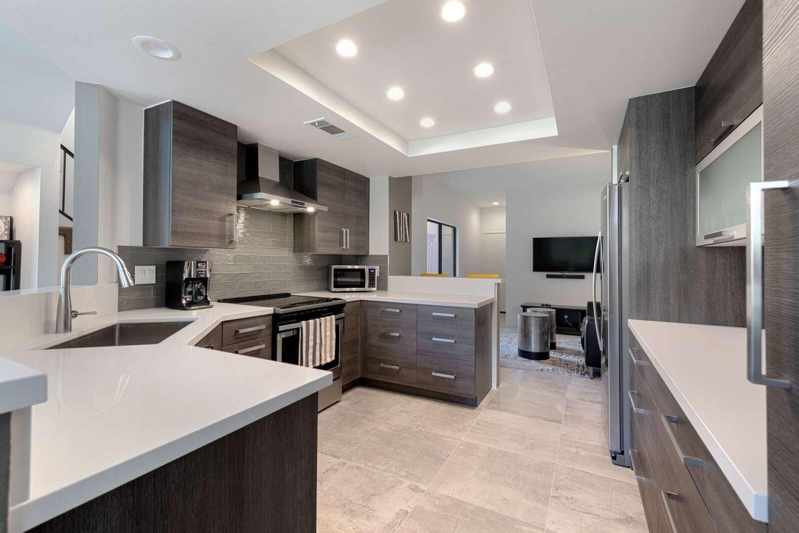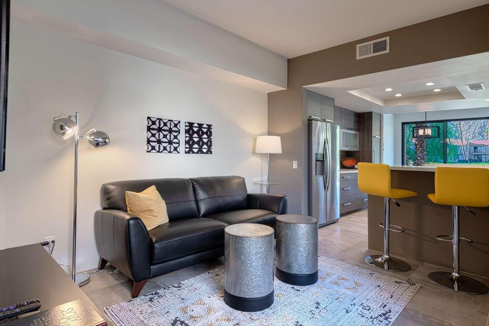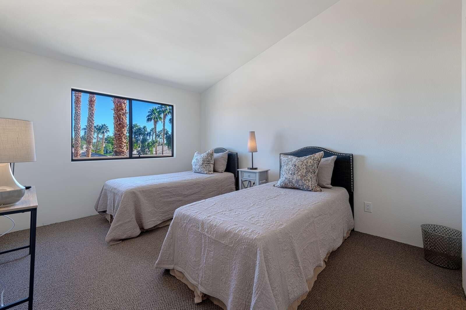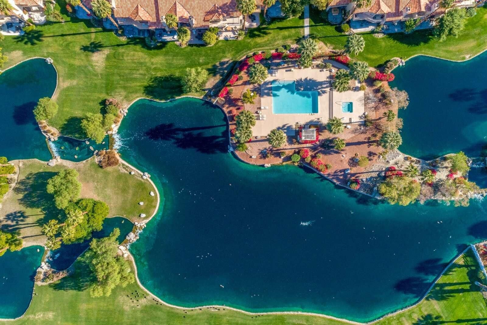 Best Views in PGA West - Palmer Private! This beautifully remodeled 3-bedroom, 2.5-bath condo offers approximately 1,621 sq. ft. of bright and airy living space with breathtaking Santa Rosa Mountain and serene private lake views. Located inside the prestigious PGA West through the exclusive Palmer Private gate, this home truly captures the essence of desert resort living. Soaring cathedral ceilings create an open and spacious atmosphere, while the thoughtful renovation brings modern comfort and style throughout. The redesigned kitchen features quartz countertops, designer tile, new cabinetry, and stainless steel appliances, complemented by recessed LED lighting, designer fixtures, and a stunning stacked stone fireplace with contemporary fire glass. Additional upgrades include 24'' x 24'' designer porcelain tile flooring on the main level, updated porcelain wood look plank tile flooring in the upstairs bathrooms, and a stylish freestanding wine and cocktail bar. Step outside to your private patio overlooking the lake, perfectly positioned to take in the spectacular Santa Rosa Mountain views and stunning desert sunsets. The home is also conveniently located just steps from the community pool and spa, making it easy to enjoy the resort lifestyle. Major systems have also been updated, including new AC and heating installed in 2019. Offered turnkey furnished and move-in ready Tenant occupied, cannot show this property until 4-1-2026