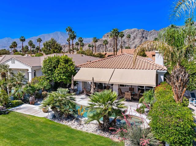Located on the 2nd hole of the Palmer Private Course at PGA WEST this beautifully appointed 2-bedroom home PLUS office or 3rd BEDROOM offers 2,026 square feet of stylish living space. Enjoy your morning coffee as the sun rises and later in the day dive into relaxation in the refreshing pebble tech pool, or unwind in the spa as your private paradise awaits! This great room style home's has a kitchen that is a chef's delight featuring all stainless steel appliances, including a sleek double oven, generous counter space and lots of cabinet space. The refurbished cabinets, self-closing doors and drawers add a touch of elegance, while the kitchen skylight, custom lighting and LED can lights create the perfect ambiance throughout the home. The HVAC system, water heater, and toilets are a few of the recent upgrades. Ceiling fans in the bedrooms and plantation shutters offer a cool retreat on warm days, complemented by custom roll-down window shades in the living areas. The private outdoor space with pool and spa plus large retractable awning is perfect for entertaining guests. The pool heater pump and salt system have been replaced, making pool maintenance a breeze. The 2 car PLUS golf cart garage has new doors and openers. This wonderful home is sold FURNISHED per inventory.