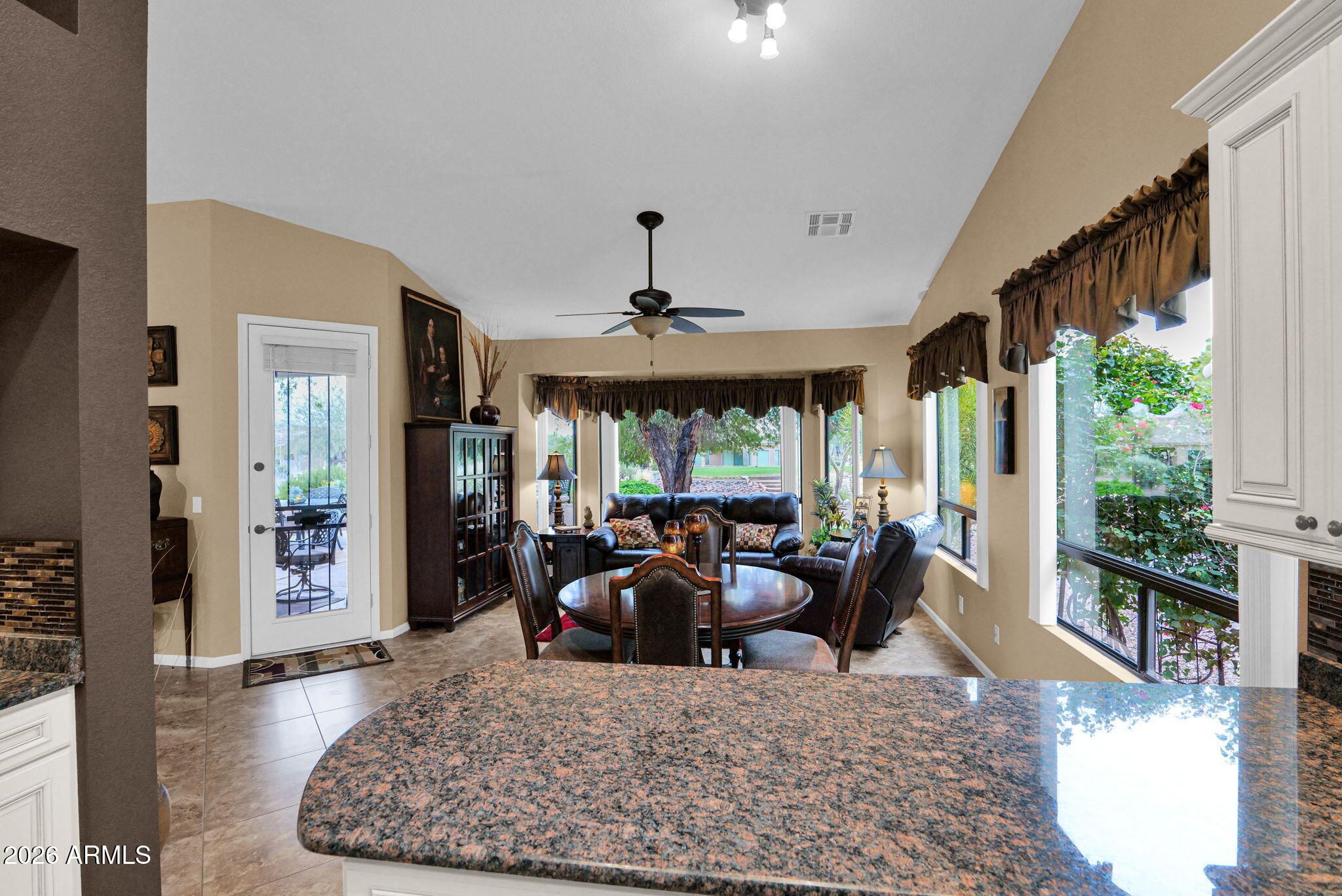 Set within the desirable Mountainbrook Village Active Adult Community, this FULLY FURNISHED, beautifully upgraded home offers resort style living on a cul-de-sac GOLF COURSE LOT, complete with tranquil mountain views from the front and back - an opportunity that rarely comes available! Inside, you'll find a thoughtfully designed layout enhanced with quality upgrades throughout. The open-concept living areas flow seamlessly, while vaulted ceilings and expansive windows capture stunning views of the golf course and desert scenery. Enjoy 18 inch tile throughout the entire home, designer paint, spacious bedrooms, and ample room for storage. The remodeled kitchen showcases stylish white cabinetry, granite countertops with a coordinating tile backsplash, stainless steel appliances, and an inviting breakfast bar ideal for entertaining. The primary suite offers a spacious retreat with a private patio exit, bay window, and a beautifully remodeled ensuite bathroom featuring dual vanities, granite countertops, upgraded white cabinetry, and an elegant walk-in shower with rain showerhead. Step outside to enjoy serene golf course views and stunning Arizona sunsets. Whether you're starting your morning with coffee or winding down in the evening, this home delivers the scenery and lifestyle that Mountainbrook Village is known for. Plus, a brand new water heater, new soft water system, newer HVAC, and a roof with many years of life left means less worry and more time to enjoy your home and community! Offered fully furnished, allowing you to move right in and start enjoying everything that this incredible 55+ community has to offer, including championship golf, clubhouse amenities, social activities, and scenic desert surroundings. This is a rare opportunity that you will not want to miss!
