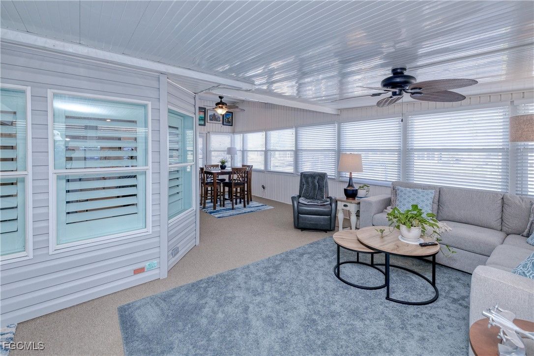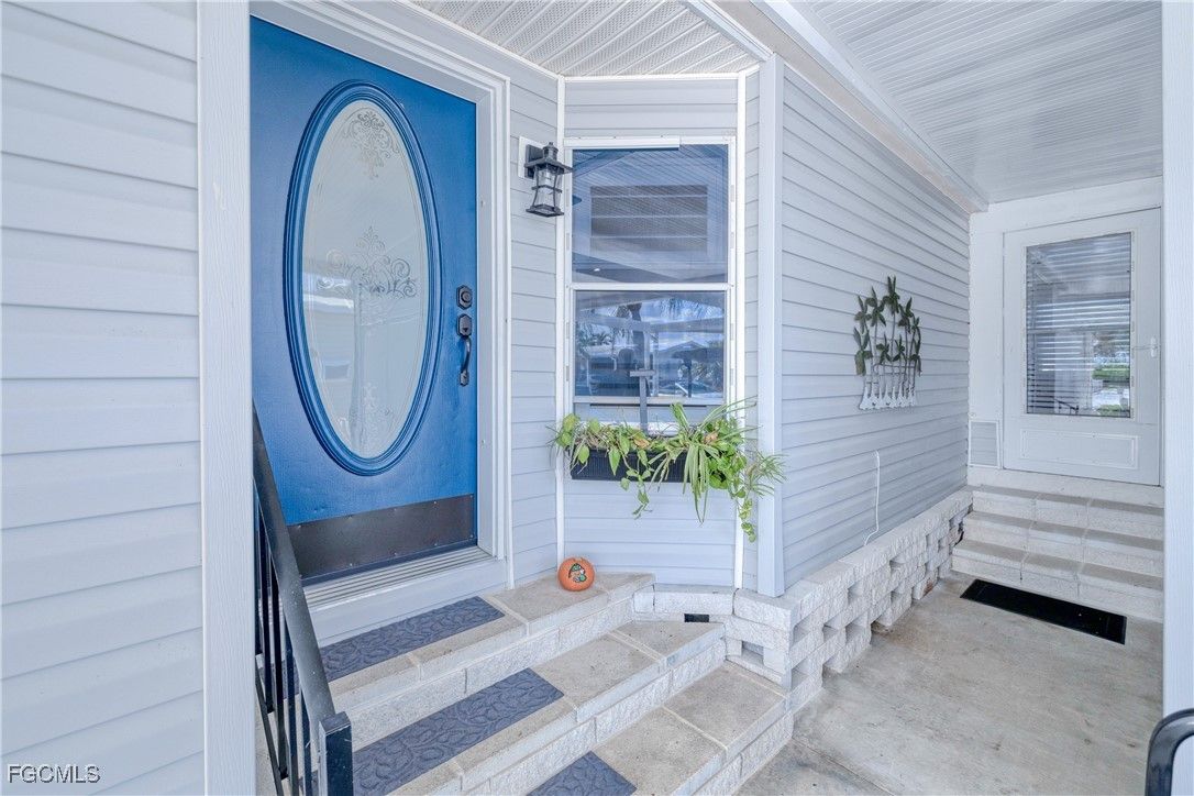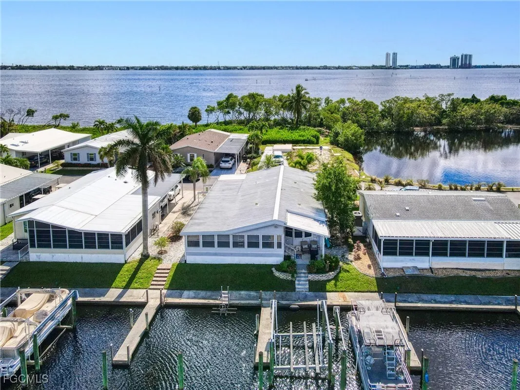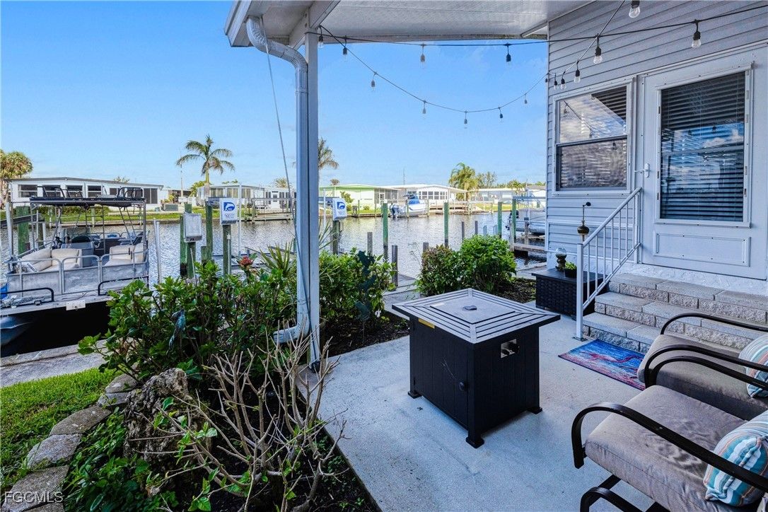 One of the BEST lots just around the bend from the river in the highly sought-after 55+ community of Old Bridge Village! This well maintained 2BR waterfront, Gulf-access home features impact windows, a spacious air-conditioned Florida room, plantation shutters, beautifully updated kitchen and baths, and professionally designed furnishings that are all included. Step outside and enjoy true Florida living—watch manatees and dolphins play from your backyard, cast a line from your private dock, or store your boat on the lift and be in the river within minutes. This hidden-gem, gated community offers a relaxed coastal vibe and an impressive array of amenities including pickleball, tennis, and basketball courts, two community pools, a fitness center, and an active clubhouse with a full calendar of social events and activities. Ideally located just minutes from Downtown Fort Myers River District, shopping, dining, airports, and everything you need to enjoy your retirement years in comfort and style.