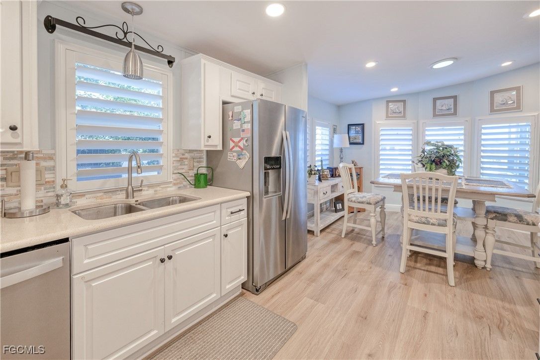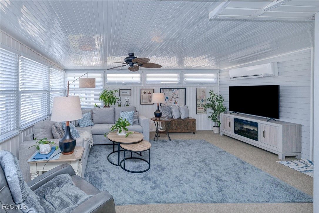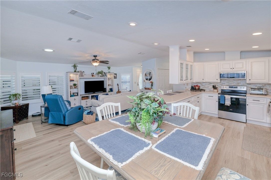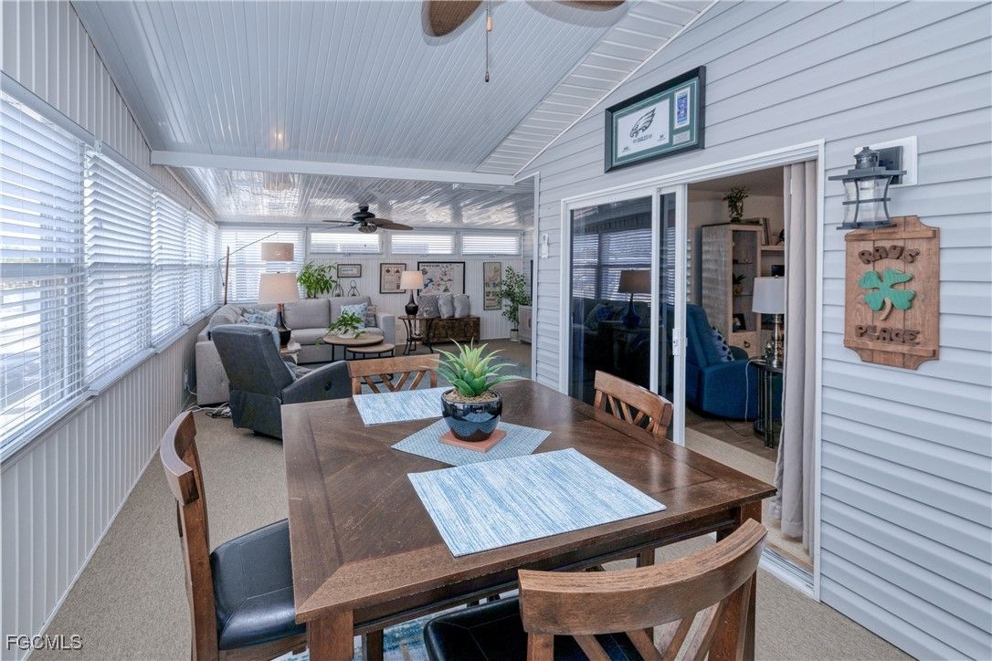 One of the BEST lots just around the bend from the river in the highly sought-after 55+ community of Old Bridge Village! This well maintained 2BR waterfront, Gulf-access home features impact windows, a spacious air-conditioned Florida room, plantation shutters, beautifully updated kitchen and baths, and professionally designed furnishings that are all included. Step outside and enjoy true Florida living—watch manatees and dolphins play from your backyard, cast a line from your private dock, or store your boat on the lift and be in the river within minutes. This hidden-gem, gated community offers a relaxed coastal vibe and an impressive array of amenities including pickleball, tennis, and basketball courts, two community pools, a fitness center, and an active clubhouse with a full calendar of social events and activities. Ideally located just minutes from Downtown Fort Myers River District, shopping, dining, airports, and everything you need to enjoy your retirement years in comfort and style.