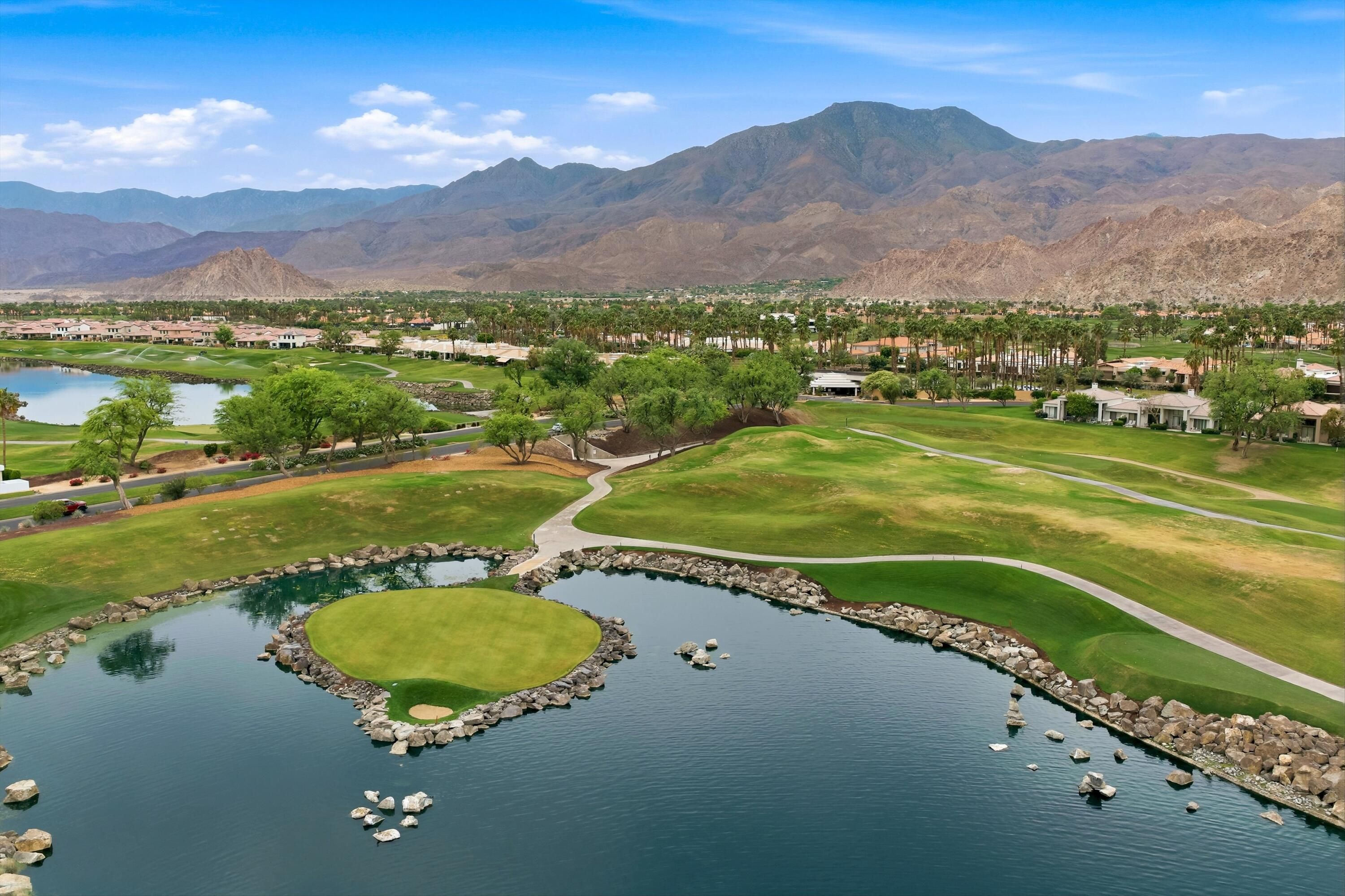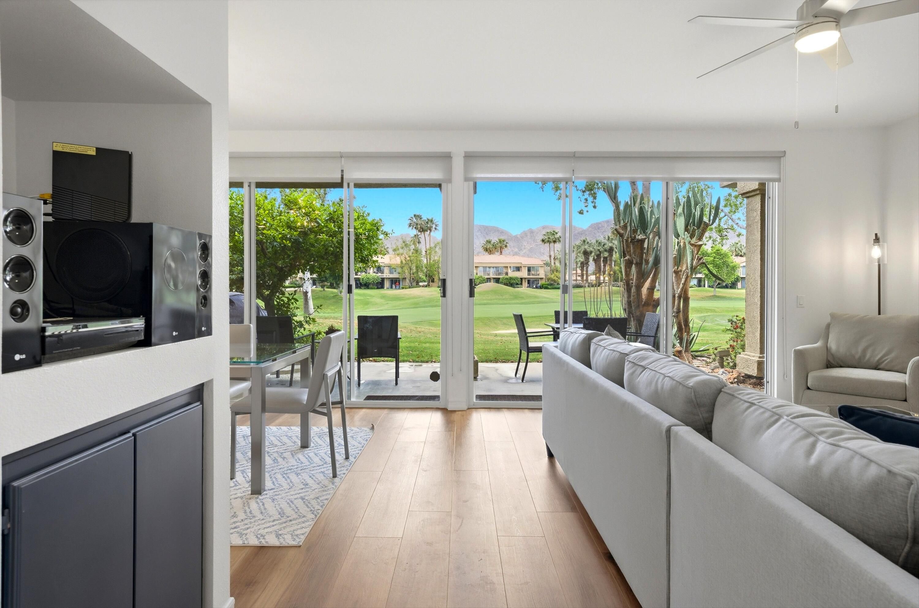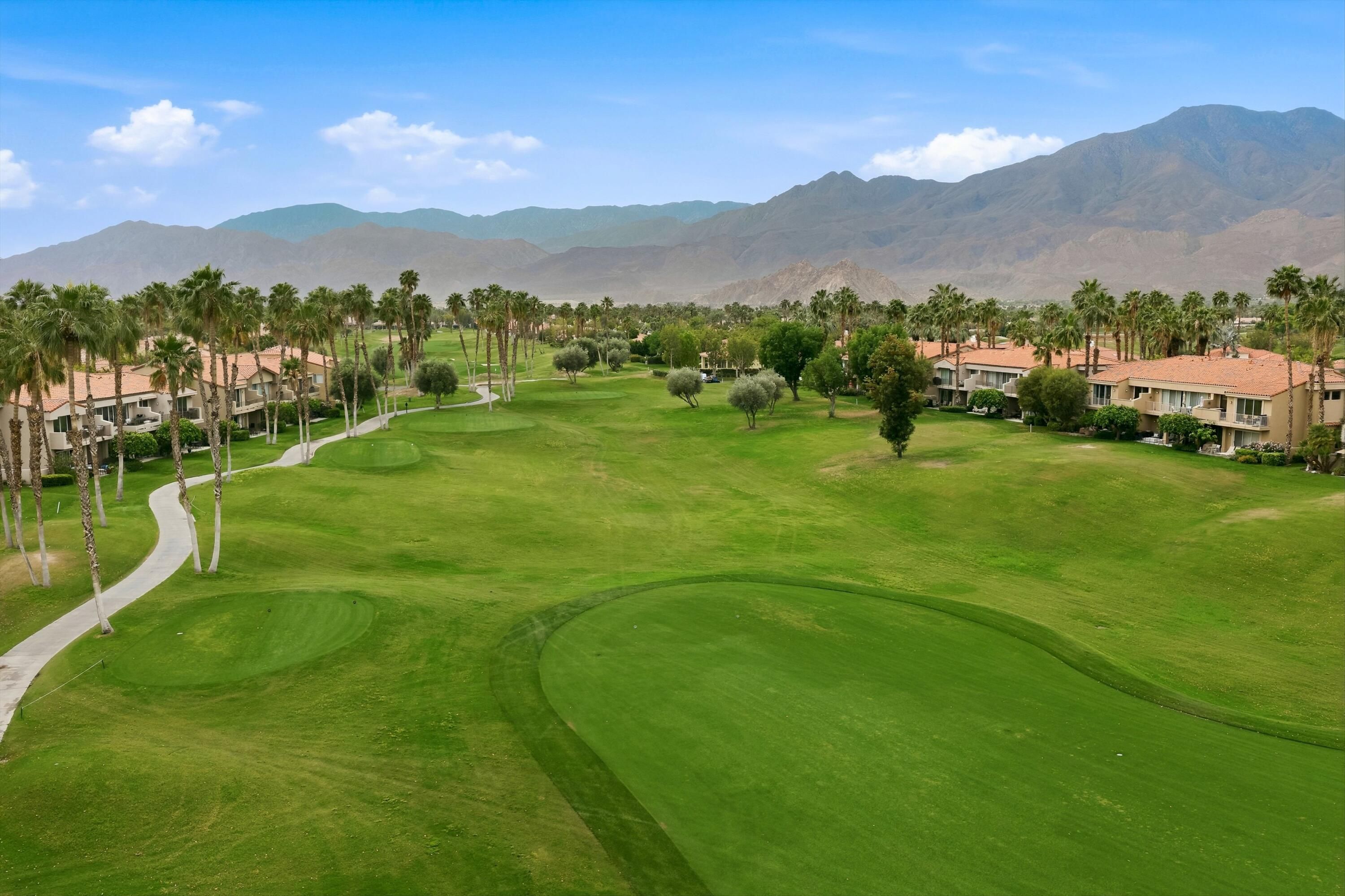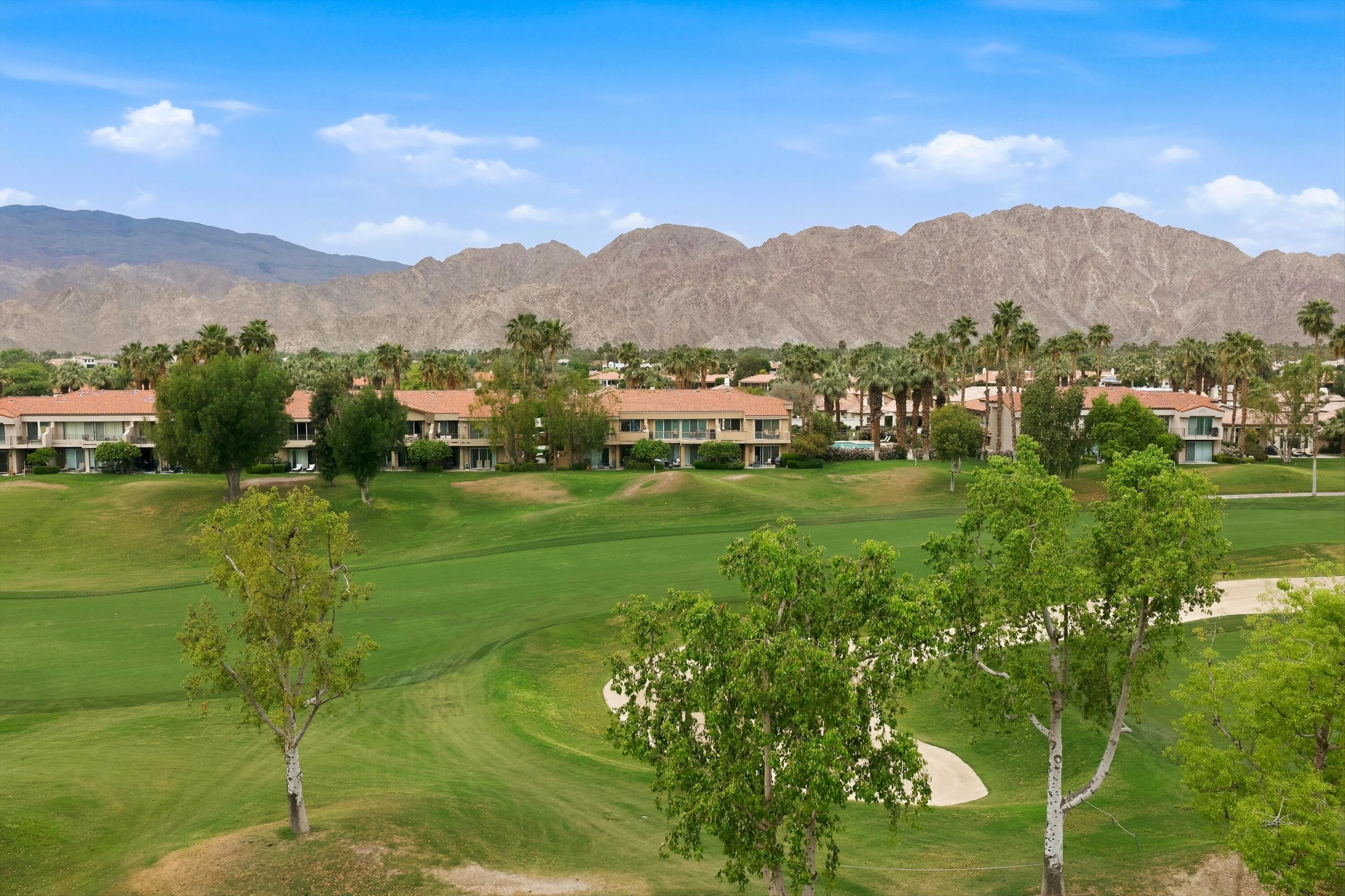 Welcome to the prestigious PGA West Nicklaus Tournament community, where luxury living meets breathtaking scenery. This beautifully appointed condo is perfectly situated on the 5th hole of the world-renowned Jack Nicklaus Tournament Course, offering sweeping panoramic views of double fairways and the surrounding mountains. The home features two spacious primary suites, each with its own private en-suite bathroom, providing comfort and privacy for residents and guests alike. The updated kitchen boasts elegant quartz countertops, stainless steel appliances, and ample space for entertaining. A cozy living room, private laundry room, and turnkey furnishings make this home truly move-in ready. Step outside to the west-facing patio and take in unforgettable sunsets over the fairways and mountains--an ideal setting for relaxing or hosting guests.