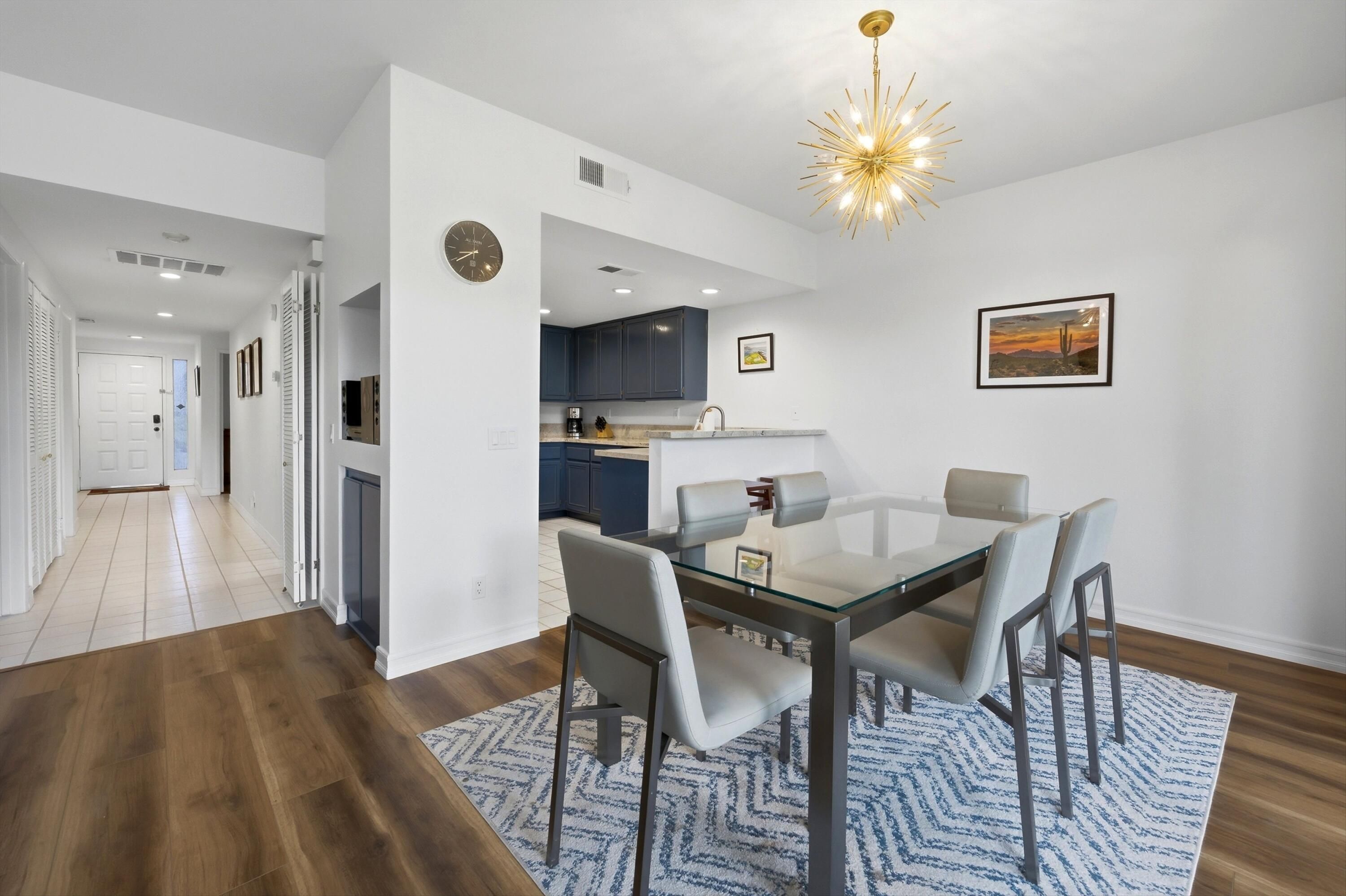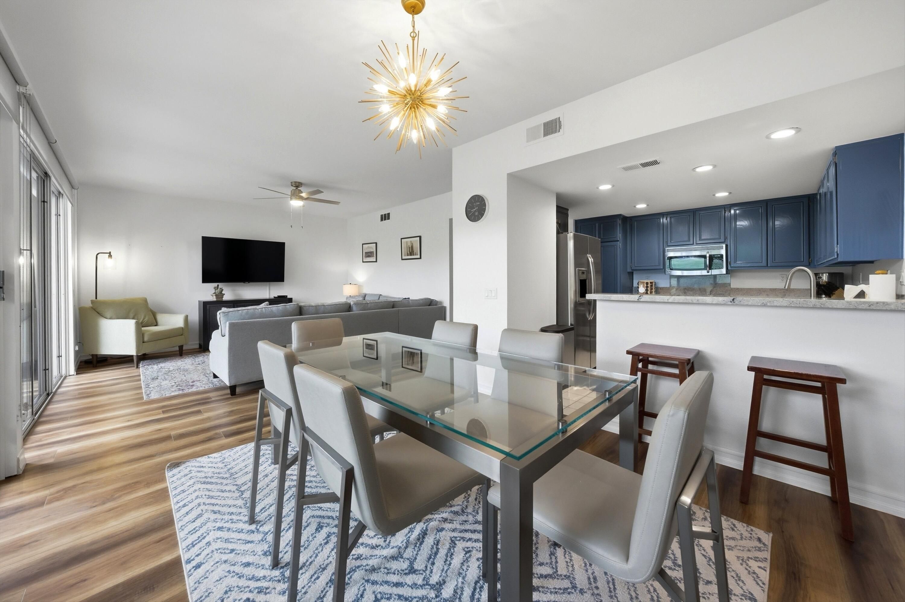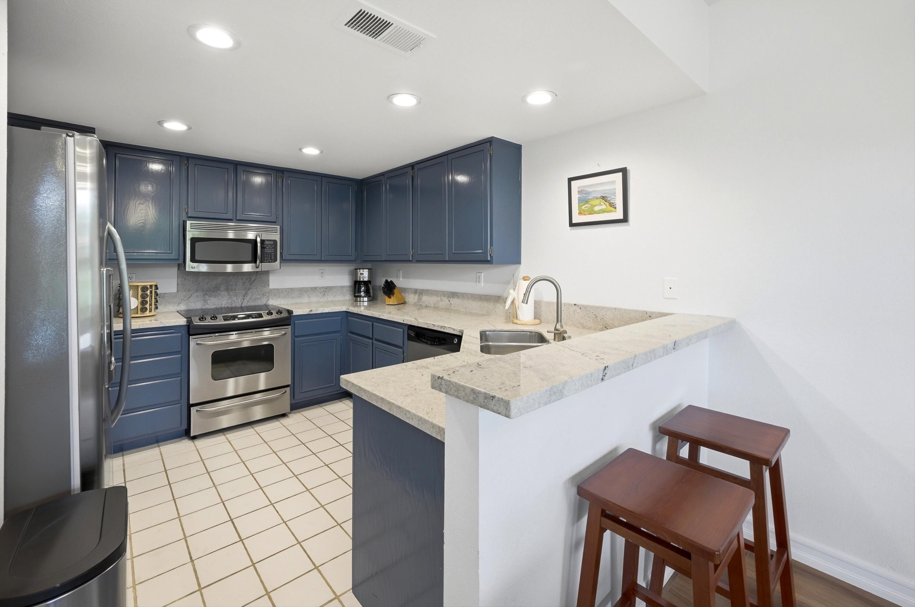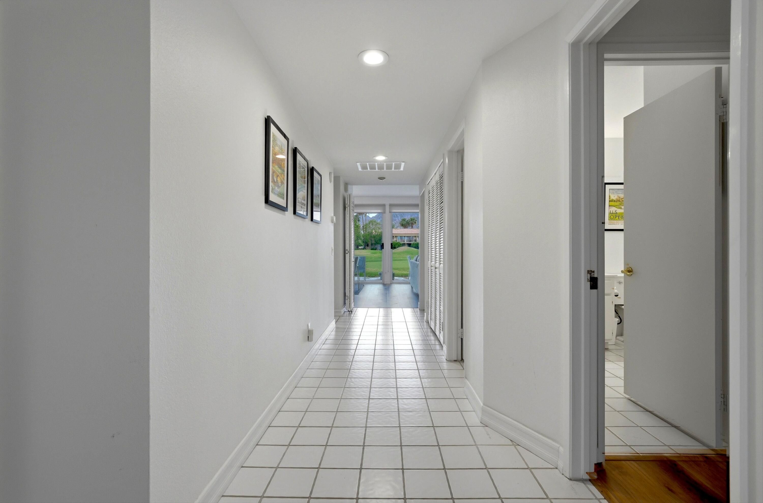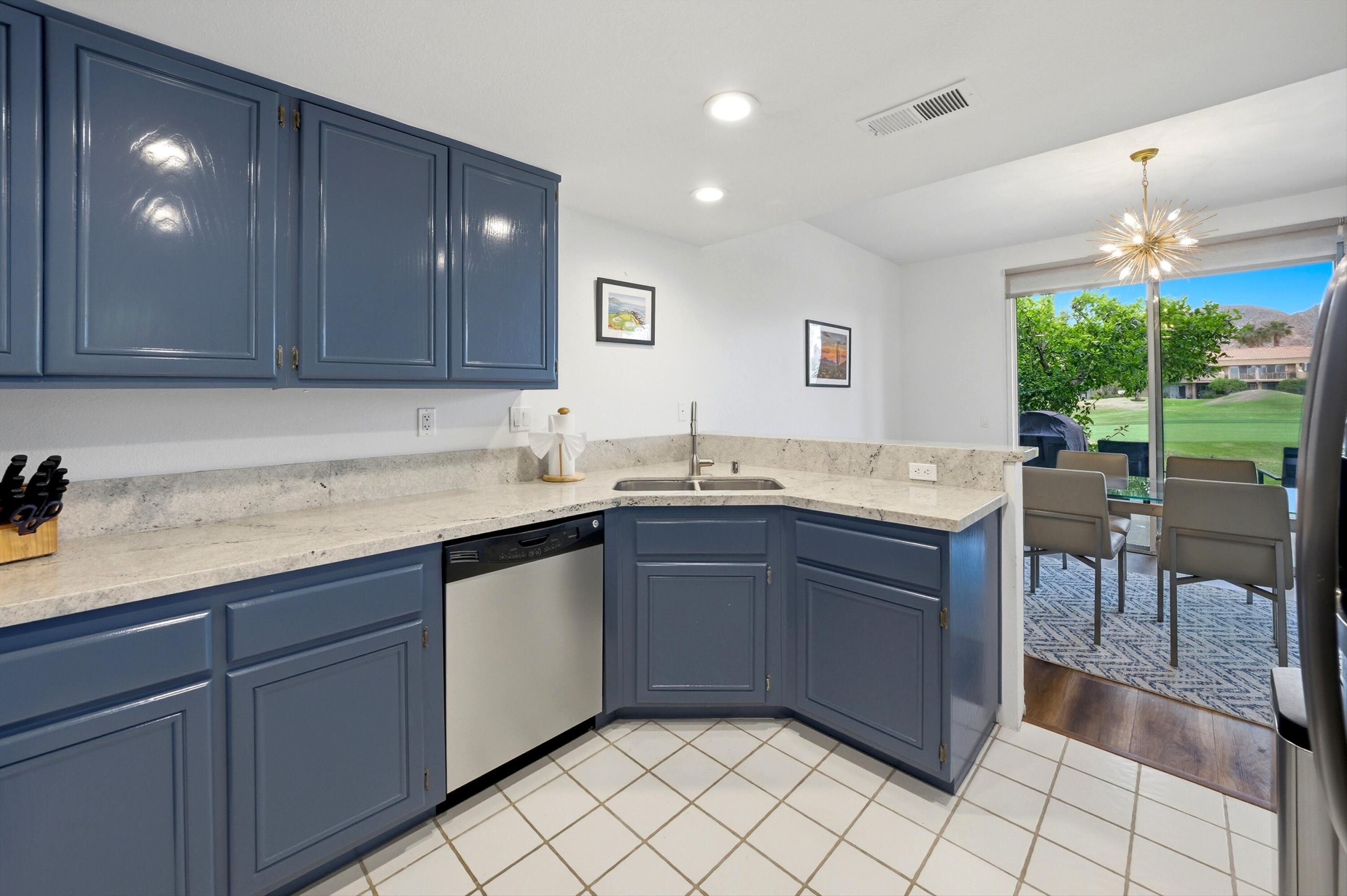 Welcome to the prestigious PGA West Nicklaus Tournament community, where luxury living meets breathtaking scenery. This beautifully appointed condo is perfectly situated on the 5th hole of the world-renowned Jack Nicklaus Tournament Course, offering sweeping panoramic views of double fairways and the surrounding mountains. The home features two spacious primary suites, each with its own private en-suite bathroom, providing comfort and privacy for residents and guests alike. The updated kitchen boasts elegant quartz countertops, stainless steel appliances, and ample space for entertaining. A cozy living room, private laundry room, and turnkey furnishings make this home truly move-in ready. Step outside to the west-facing patio and take in unforgettable sunsets over the fairways and mountains--an ideal setting for relaxing or hosting guests.