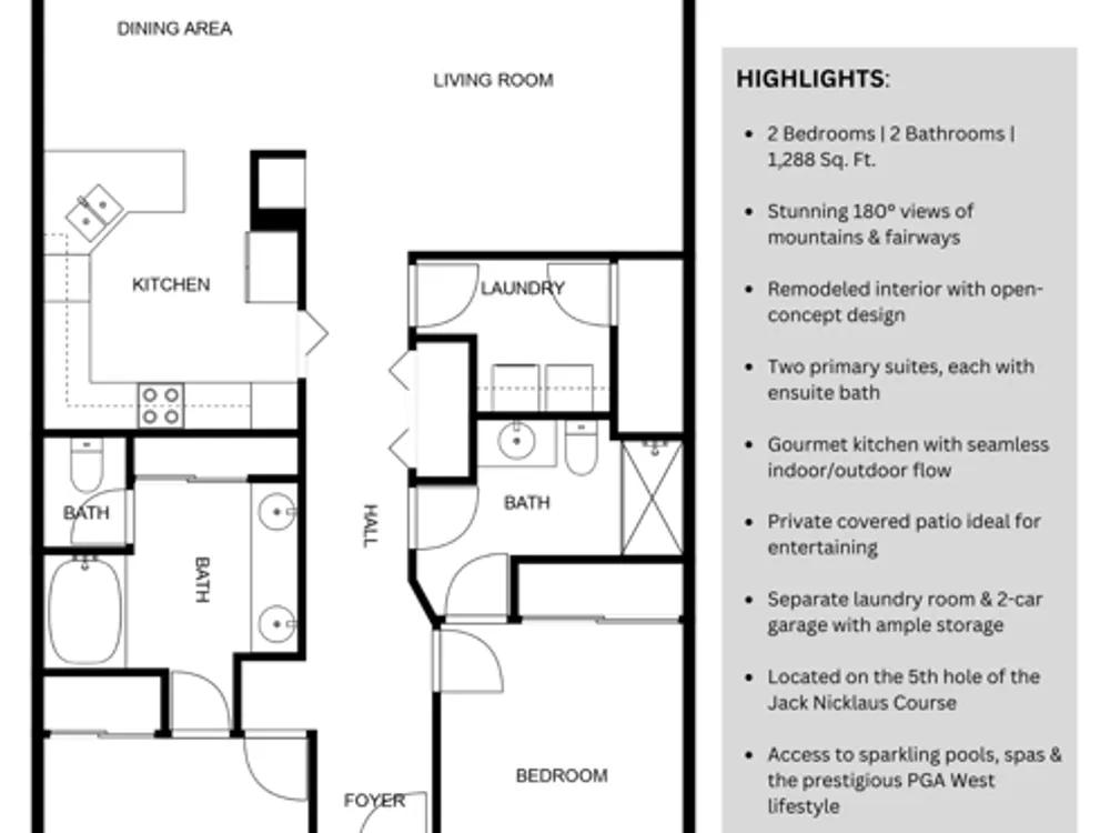 Step into this beautifully remodeled residence, perfectly situated on the 5th hole of the world-famous Jack Nicklaus course.. With panoramic views of double fairways, dramatic mountain backdrops, and lush rolling greens, this home delivers an unrivaled resort experience from every vantage point.Designed with luxury and comfort in mind, the home offers two primary suites, each with its own full ensuite. The gourmet kitchen seamlessly flows to the outdoor covered patio area--ideal for al fresco dining and entertaining beneath the desert skies. The open-concept living and dining areas showcase the full wall of sliders, providing abundant natural light, creating an atmosphere of elegance and ease.Additional features include a private laundry room and a two-car garage with generous storage, blending practicality with sophistication.As part of the prestigious PGA West community, residents enjoy access to sparkling pools and spas just steps from the home. Golf enthusiasts will appreciate the option to play three semi-public courses or elevate their membership to enjoy all six legendary PGA West courses, each designed by the game's greatest architects.This is more than a home--it is a luxury lifestyle, offering the perfect balance of refinement, relaxation, and recreation.