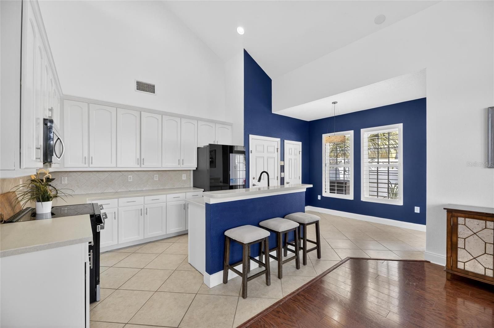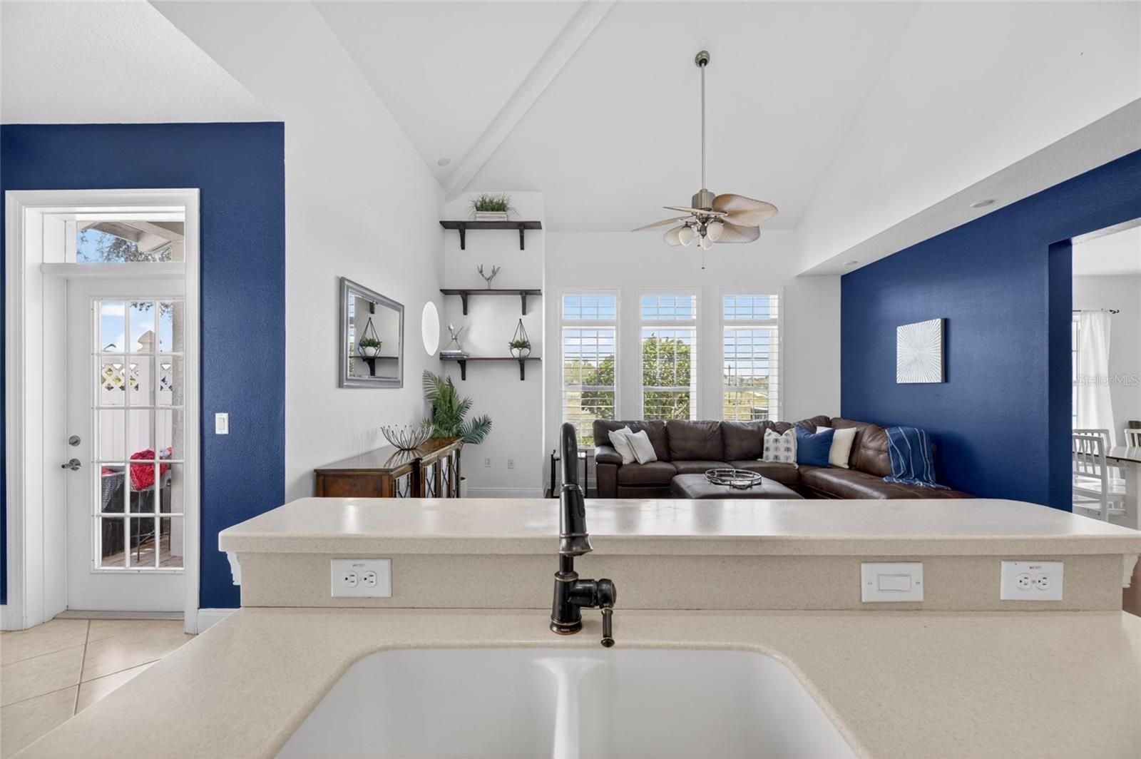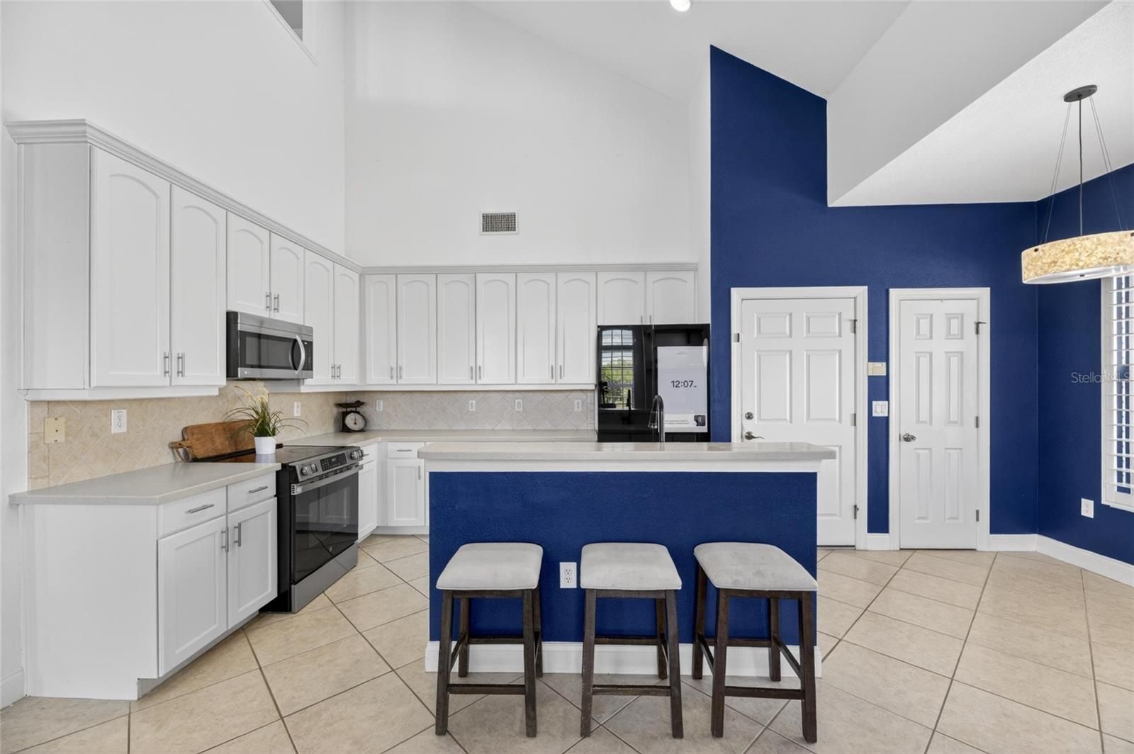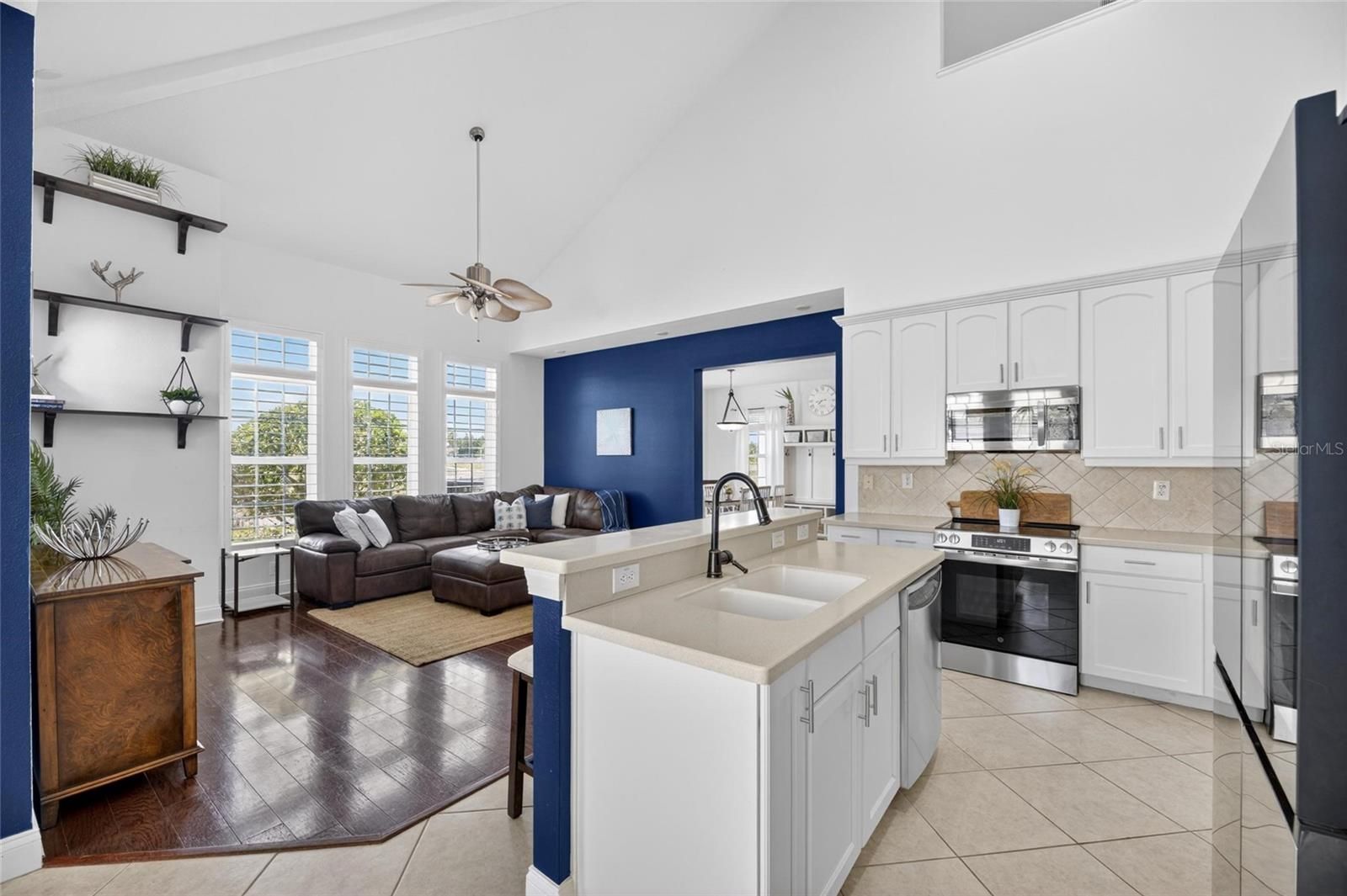 - Cathedral Ceiling(s), Ceiling Fan(s), Eat-in Kitchen, High Ceilings, Kitchen/Family Room Combo, Open Floorplan, Main Level Primary, Solid Surface Counters, Solid-Wood Cabinets, Split Bedrooms, Vaulted Ceiling(s), Walk-In Closet(s), Window Treatments