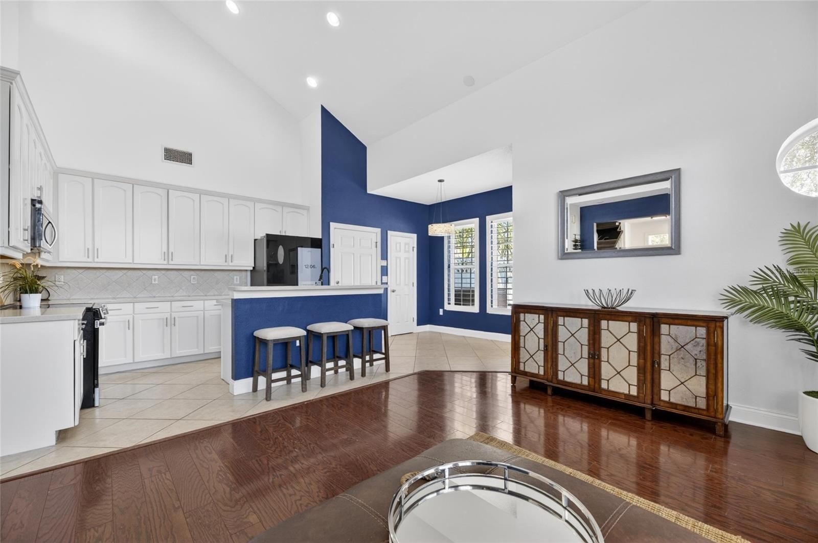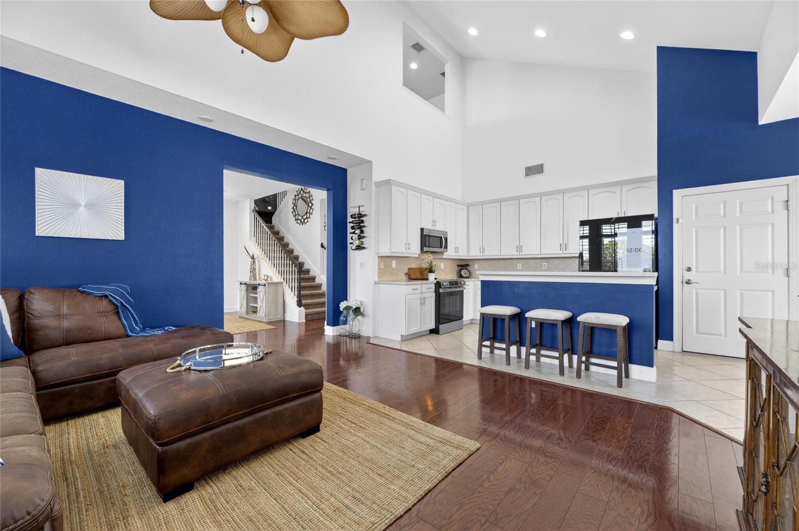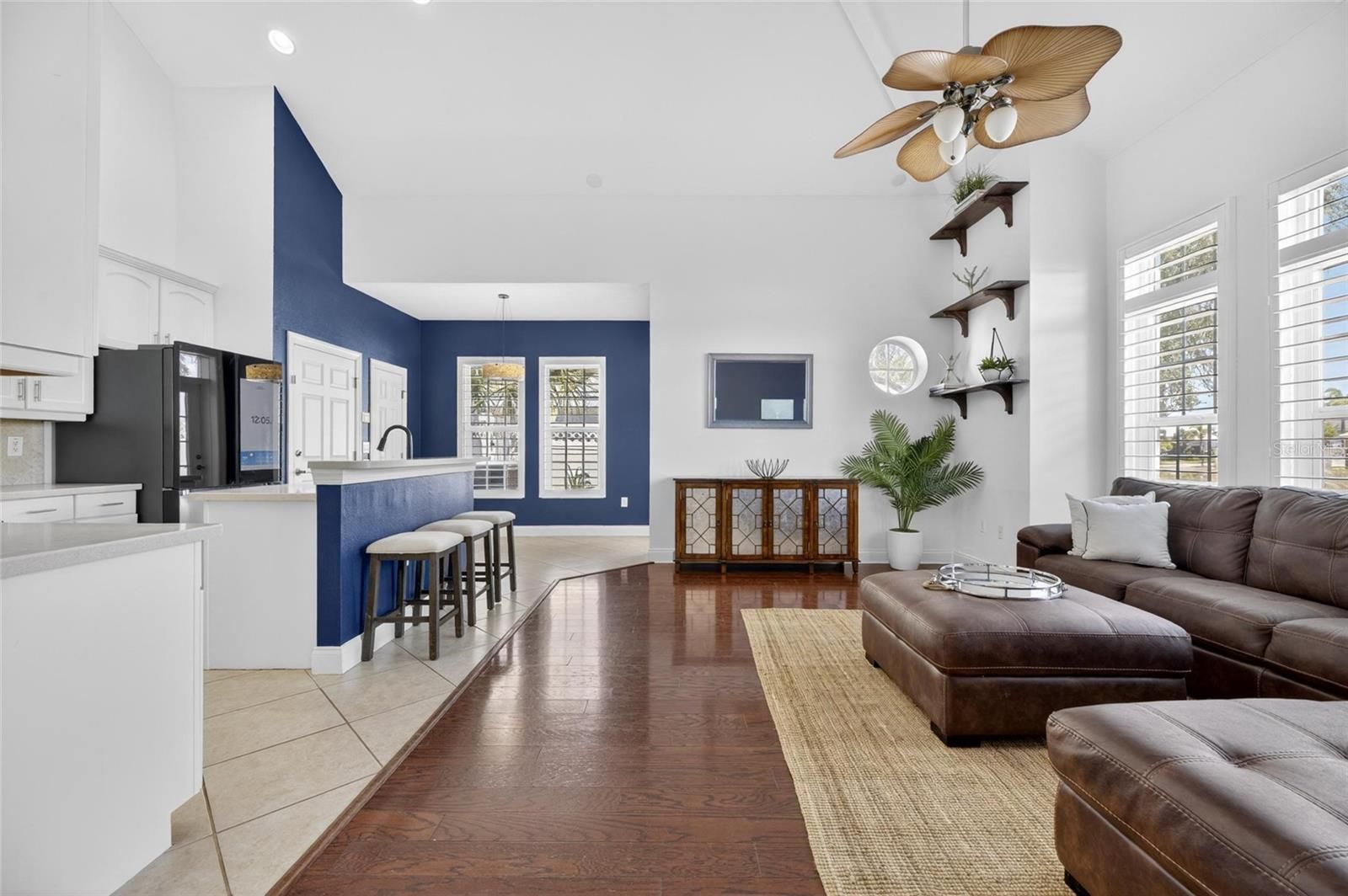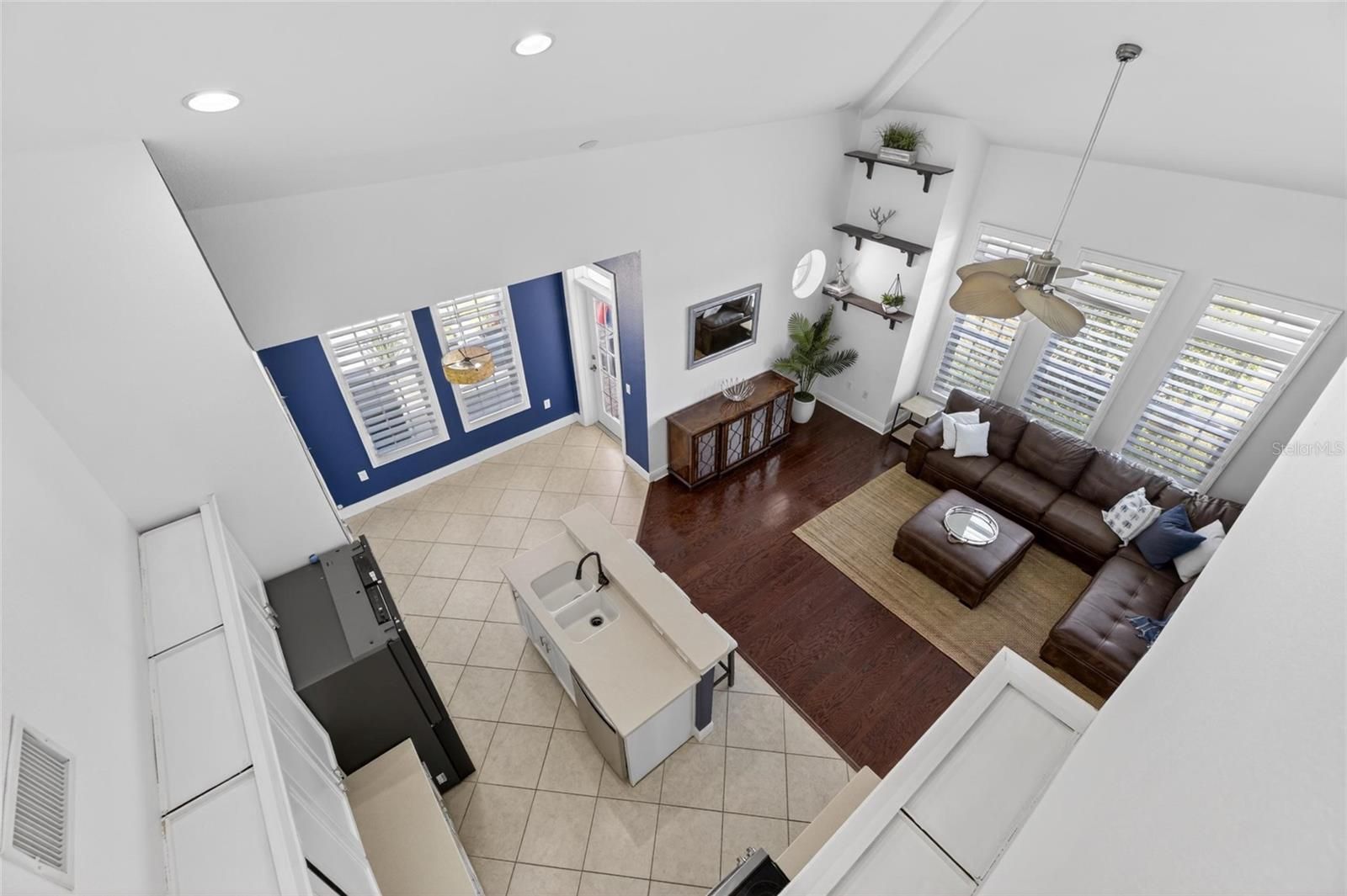 - Cathedral Ceiling(s), Ceiling Fan(s), Eat-in Kitchen, High Ceilings, Kitchen/Family Room Combo, Open Floorplan, Main Level Primary, Solid Surface Counters, Solid-Wood Cabinets, Split Bedrooms, Vaulted Ceiling(s), Walk-In Closet(s), Window Treatments
