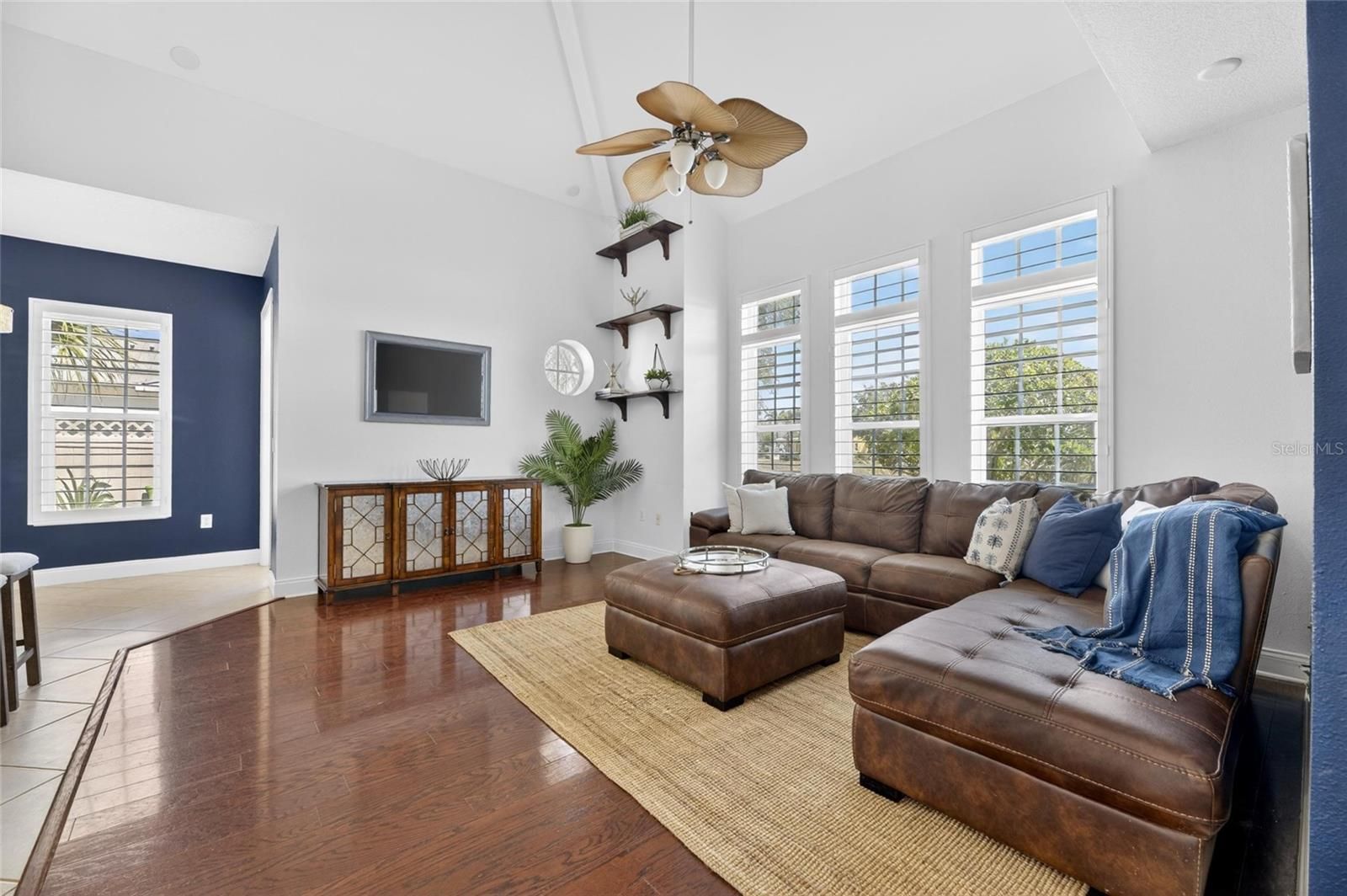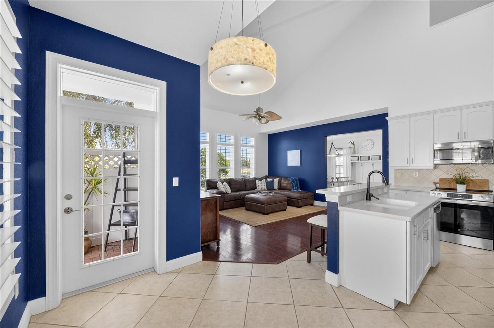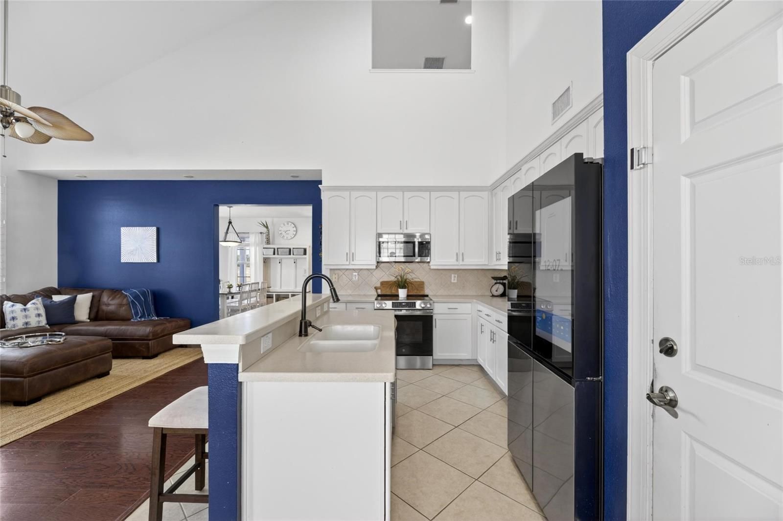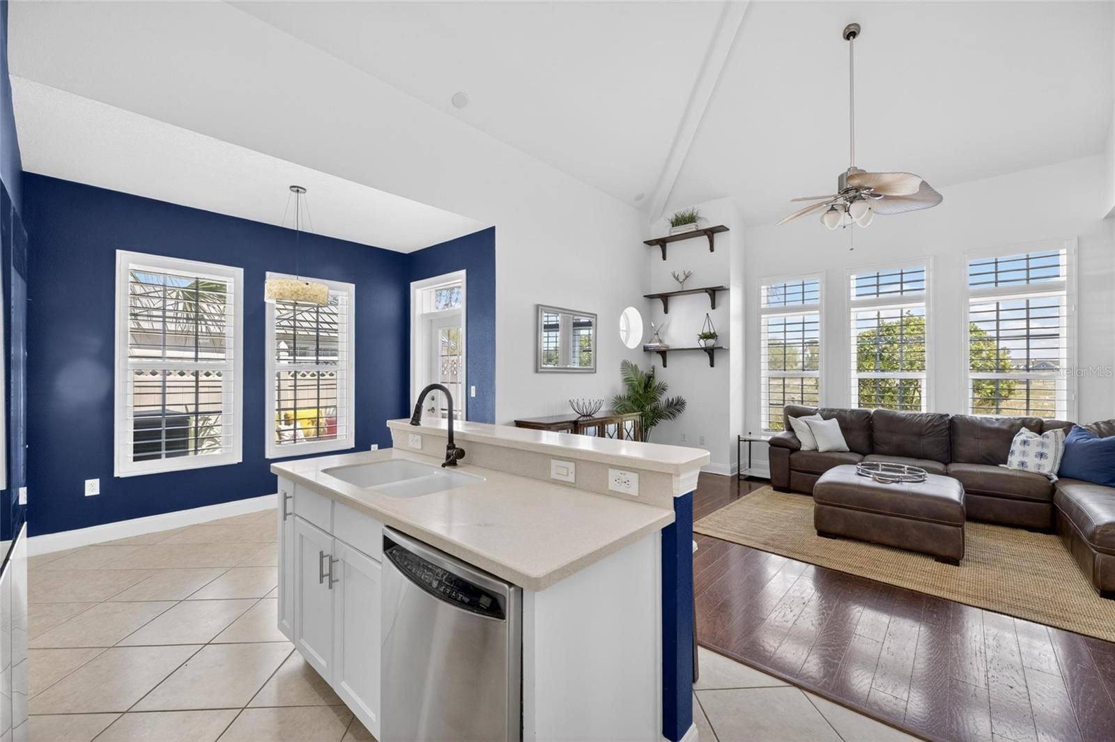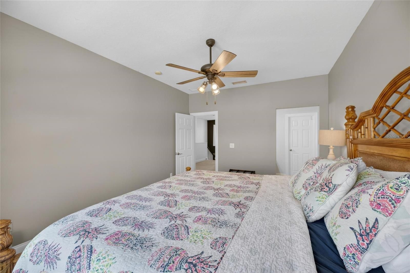 - Cathedral Ceiling(s), Ceiling Fan(s), Eat-in Kitchen, High Ceilings, Kitchen/Family Room Combo, Open Floorplan, Main Level Primary, Solid Surface Counters, Solid-Wood Cabinets, Split Bedrooms, Vaulted Ceiling(s), Walk-In Closet(s), Window Treatments