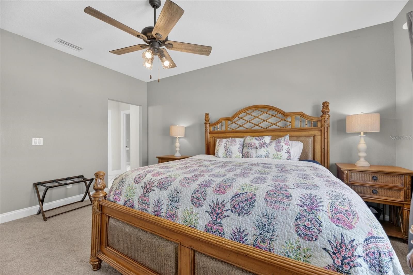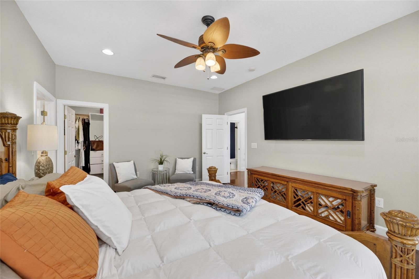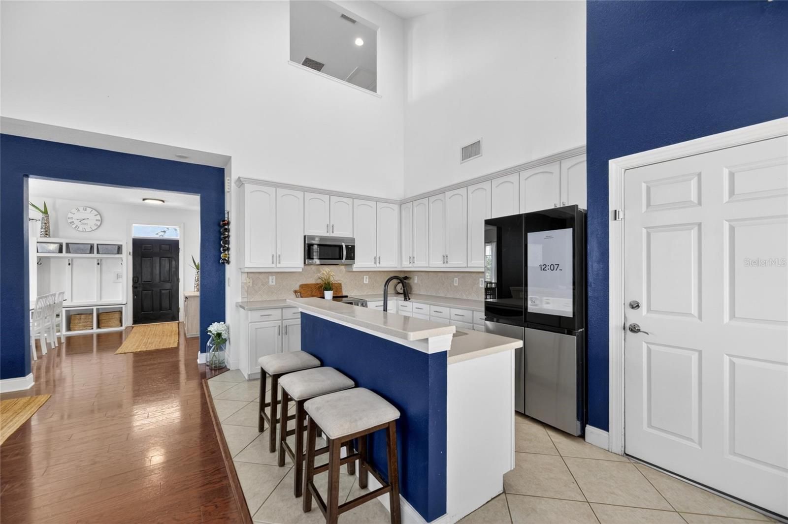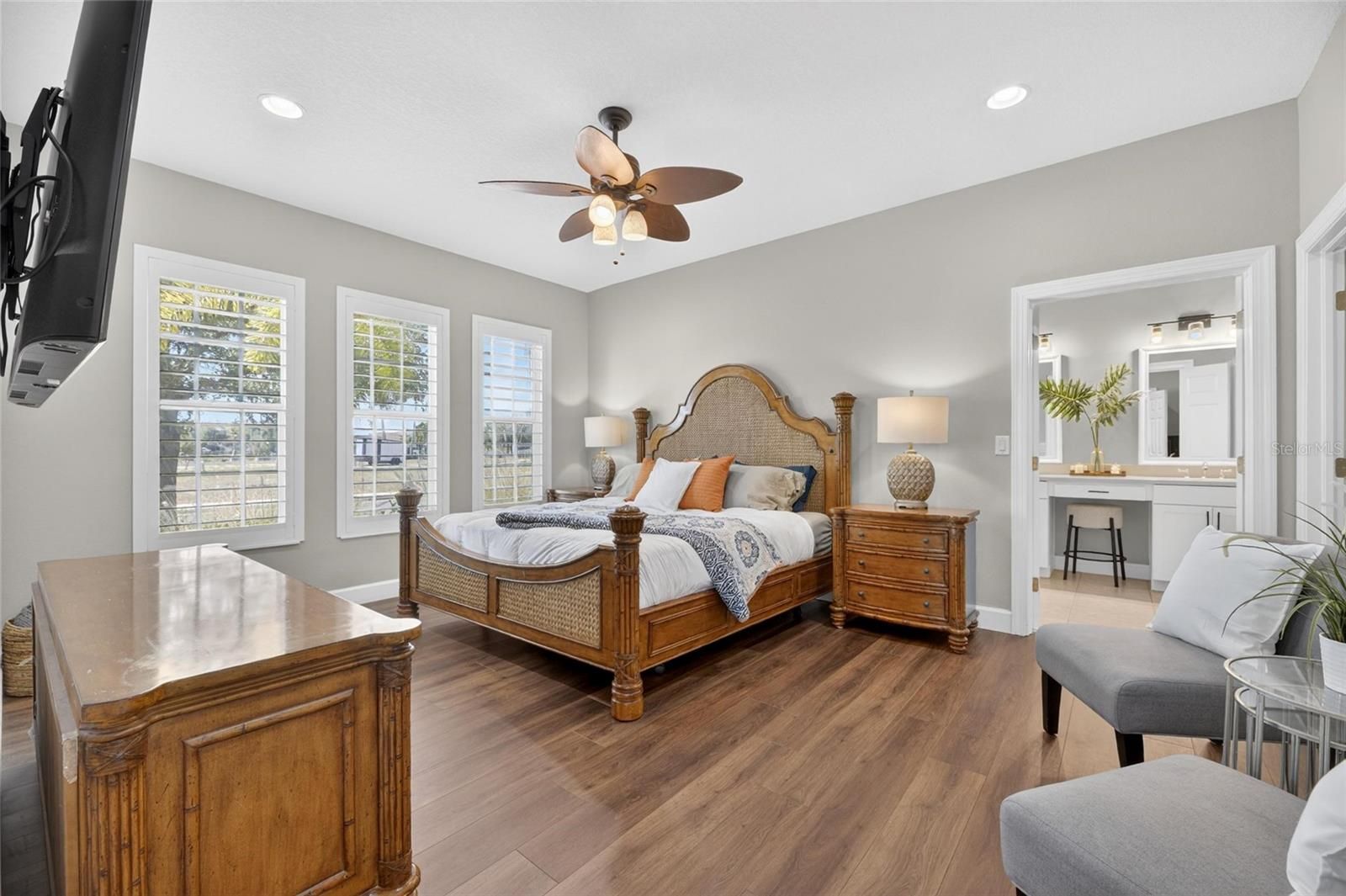 - Cathedral Ceiling(s), Ceiling Fan(s), Eat-in Kitchen, High Ceilings, Kitchen/Family Room Combo, Open Floorplan, Main Level Primary, Solid Surface Counters, Solid-Wood Cabinets, Split Bedrooms, Vaulted Ceiling(s), Walk-In Closet(s), Window Treatments
