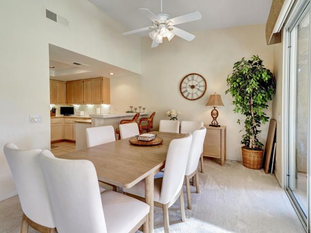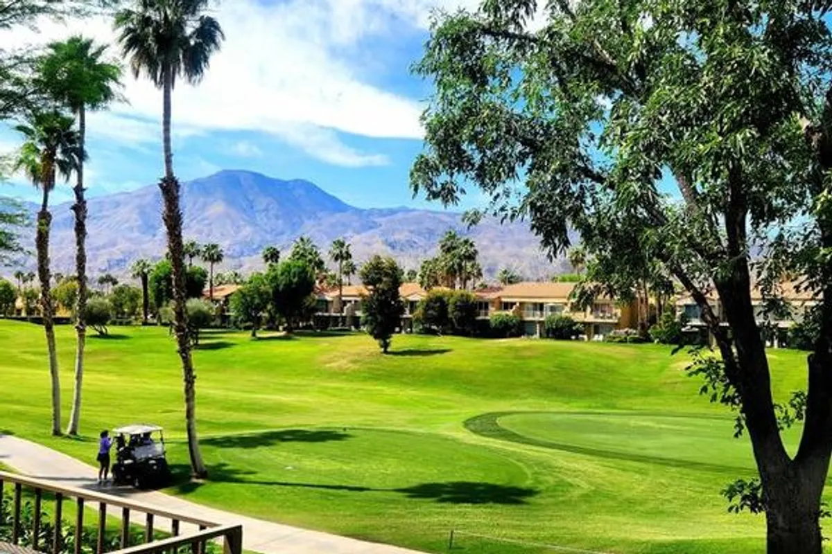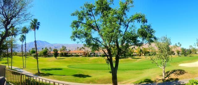 Great buy in PGA West that offers spectacular panoramic golf course and mountain views! Located on the 5th fairway and the ladies tee of the Jack Nicklaus Tournament course, you can enjoy beautiful desert sunsets from your living room or the balcony! Cute, comfy and move in ready with a new AC in 2025 and upgraded carpet. Two bedrooms and two bathrooms with remote control sun shades in the living room that allow the perfect amount of lighting! Also comes with an electric awning for that covers the patio balcony. There is a 2 car garage with lots of storage space and upgraded electrical access for charging your golf cart. Partially furnished excluding living room furniture, this condo is only a short distance from the community pool and with these views would make a great weekend getaway or seasonal rental!