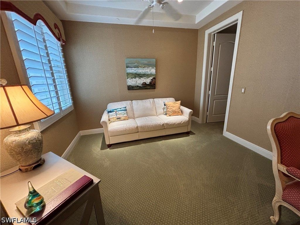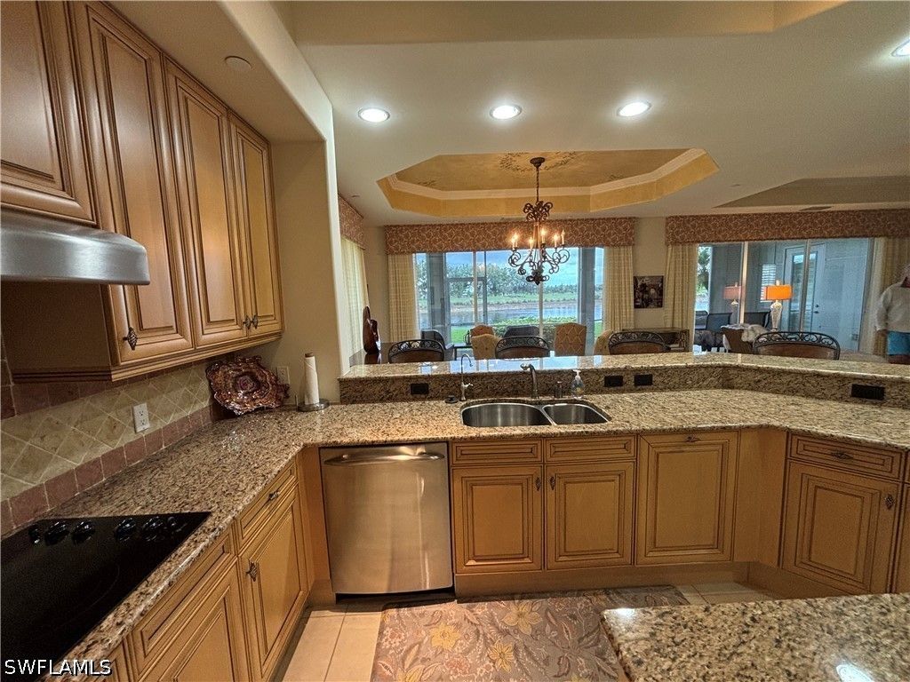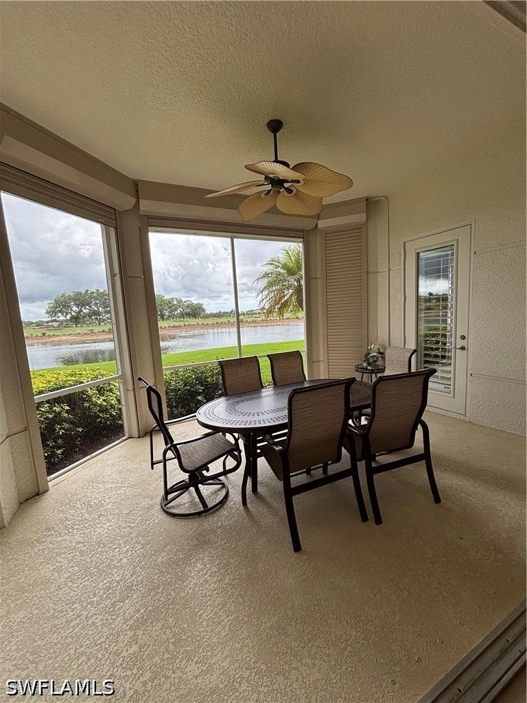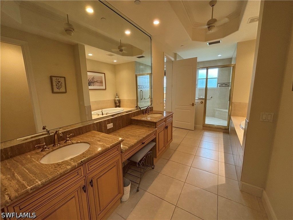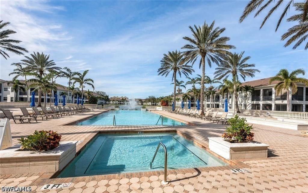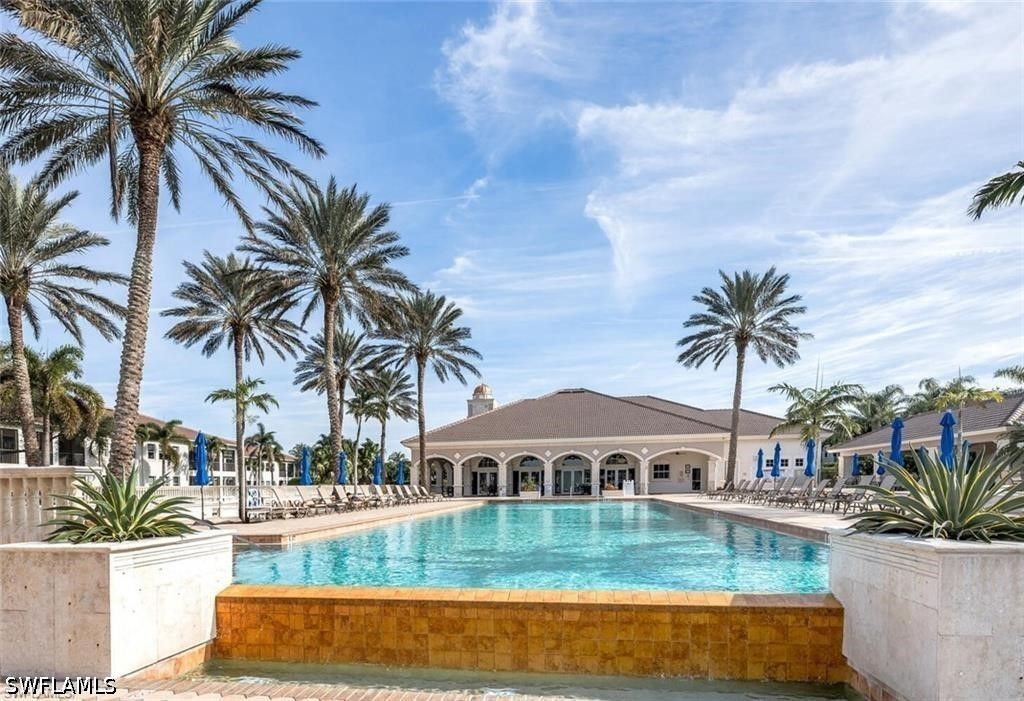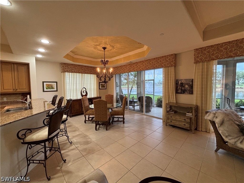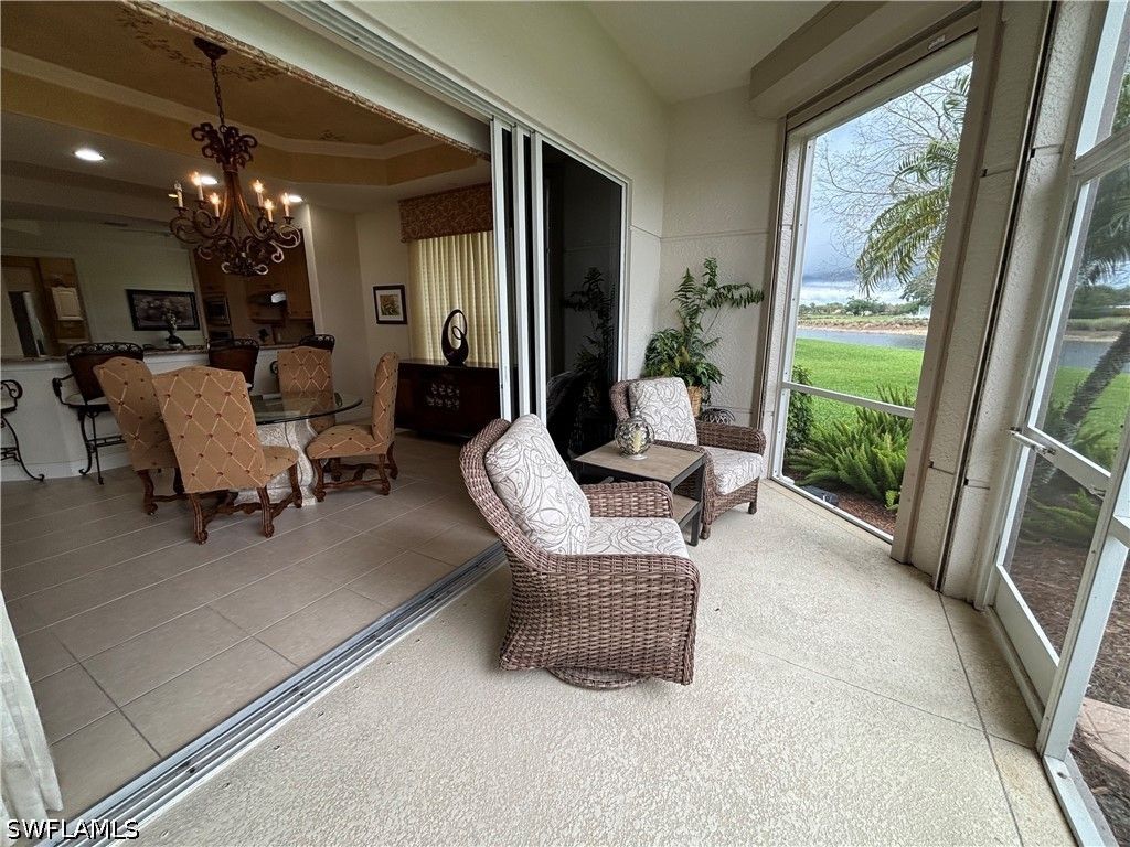 Experience breathtaking, expansive golf course and lake views from this stunning, turnkey 3 bedroom, 2.5 bath first floor end-unit in the prestigious Avellino Isles of the Vineyards. This 2,196 sq ft, southern exposure Botticelli floor plan unit provides ample natural light, plantation shutters, and is designed for entertaining, relaxing and enjoying spectacular views. The kitchen is a chef's delight with granite counters, stainless steel appliances, breakfast nook and coffee bar. The primary suite, highlighted by an eye-catching coffered ceiling, offers an ensuite bath with dual sinks with a vanity area, a large walk-in shower with new shower heads, and a separate soaking tub, along with custom closet storage. New $4500 blackout blinds for the bedrooms. Even the laundry room is generously sized, adding everyday functionality. Transition from this cozy and elegant floor plan to enjoy the serene water feature, golf course and lake views from your oversized screened-in lanai with solar tinted windows. With impact doors and windows, electric storm shutters enclosing the lanai, and a newer hot water heater (2/24), this condo is not only beautiful but also safe and secure. The newer AC/heating system installed in 2021 ensures your comfort year-round. Unit has an attached 2 car tandem garage perfect for golf cart, extra storage or a workshop. Whether you're looking for a peaceful retreat or a place to entertain friends and family, this condo has it all. This beautiful, tropically landscaped gated community includes a luxurious clubhouse with catering kitchen, party room, fitness center, library, outdoor bar/grills and resort style pool and spa. The community boasts newly painted exteriors, 2024 new tile roofs throughout, along with new gutters and exterior light fixtures. Don't miss out on the opportunity to own this slice of paradise in Naples. Schedule a showing today and make this condo your new home in The Vineyards! PROFESSION PHOTOS COMING THIS WEEK!