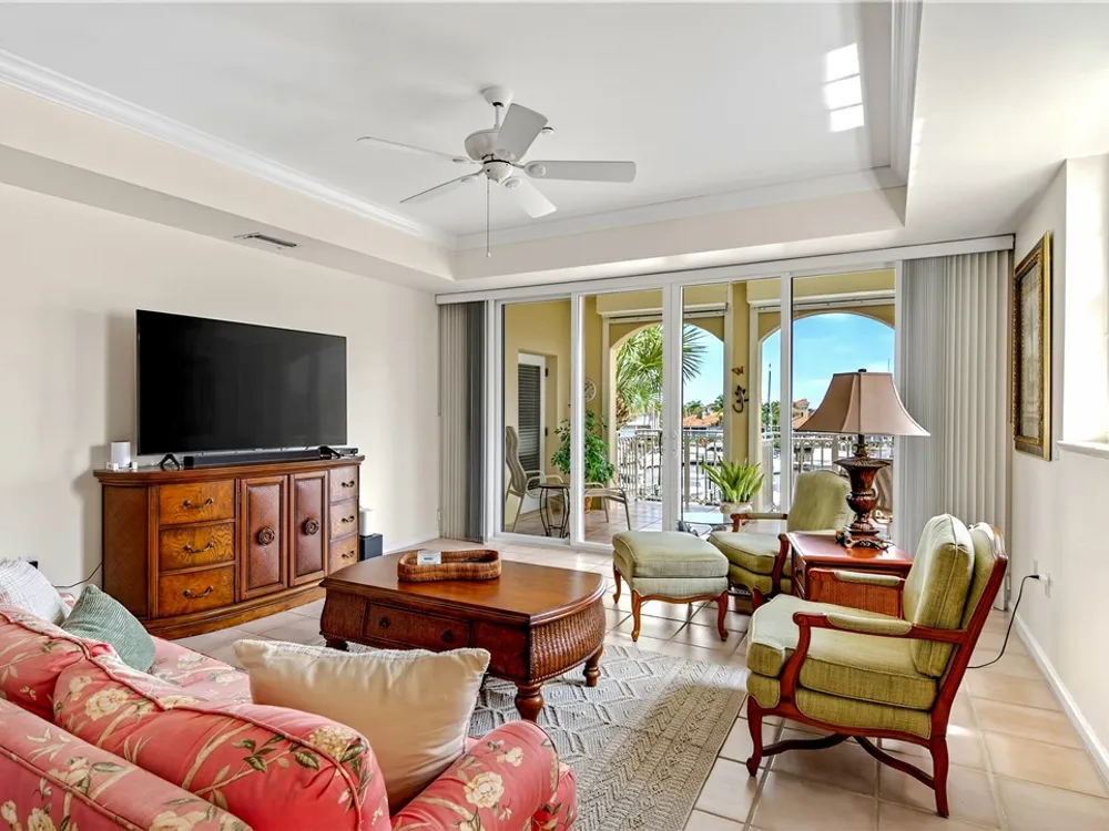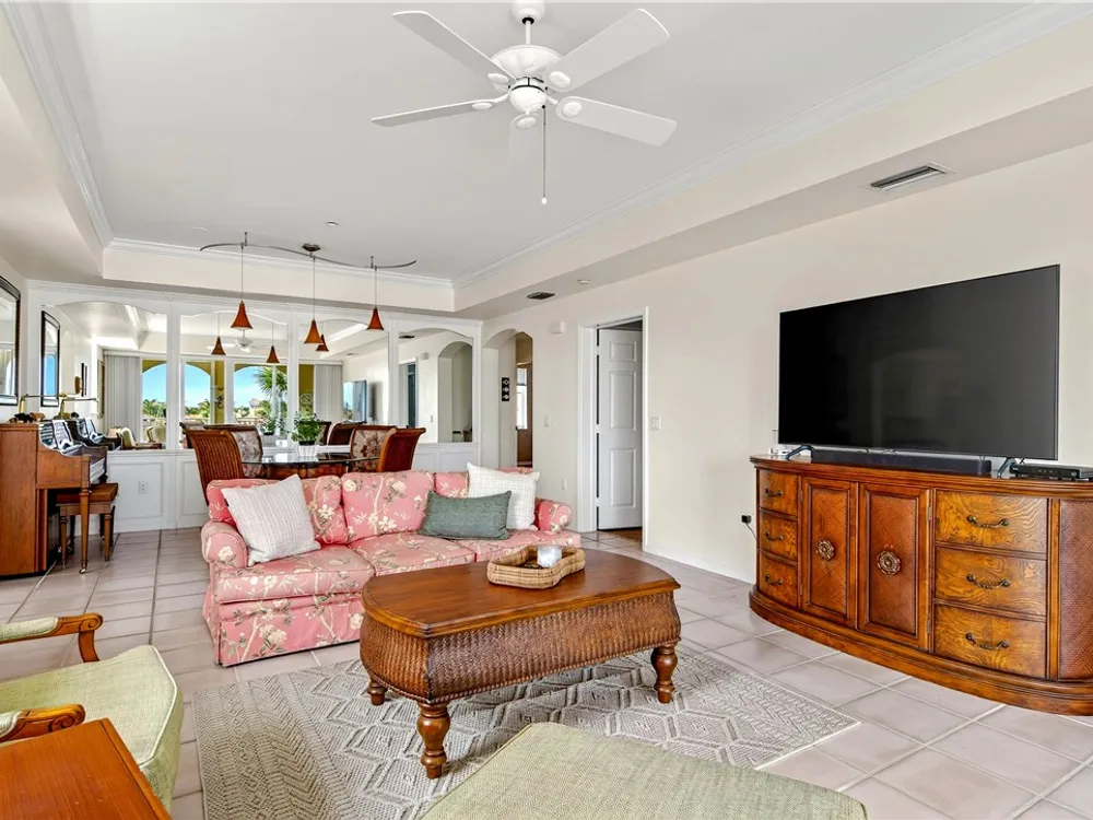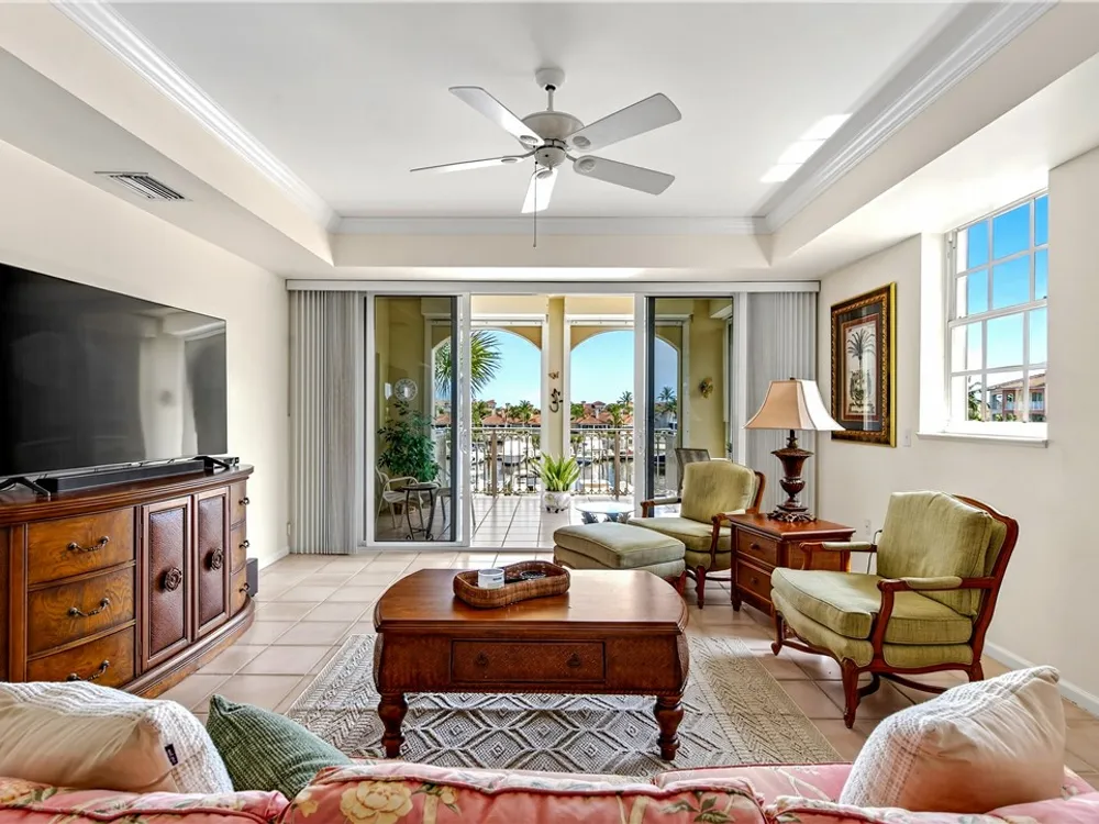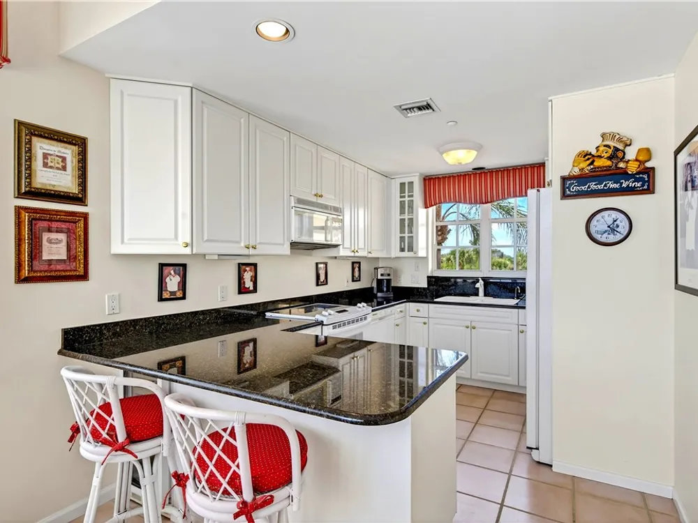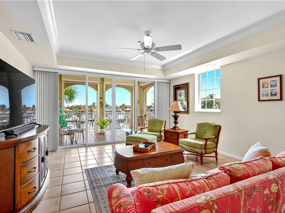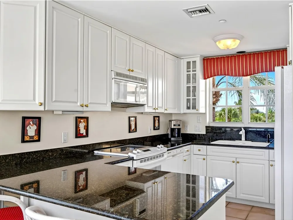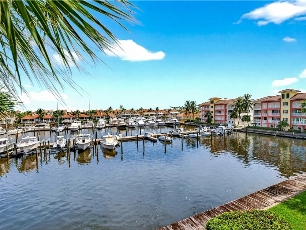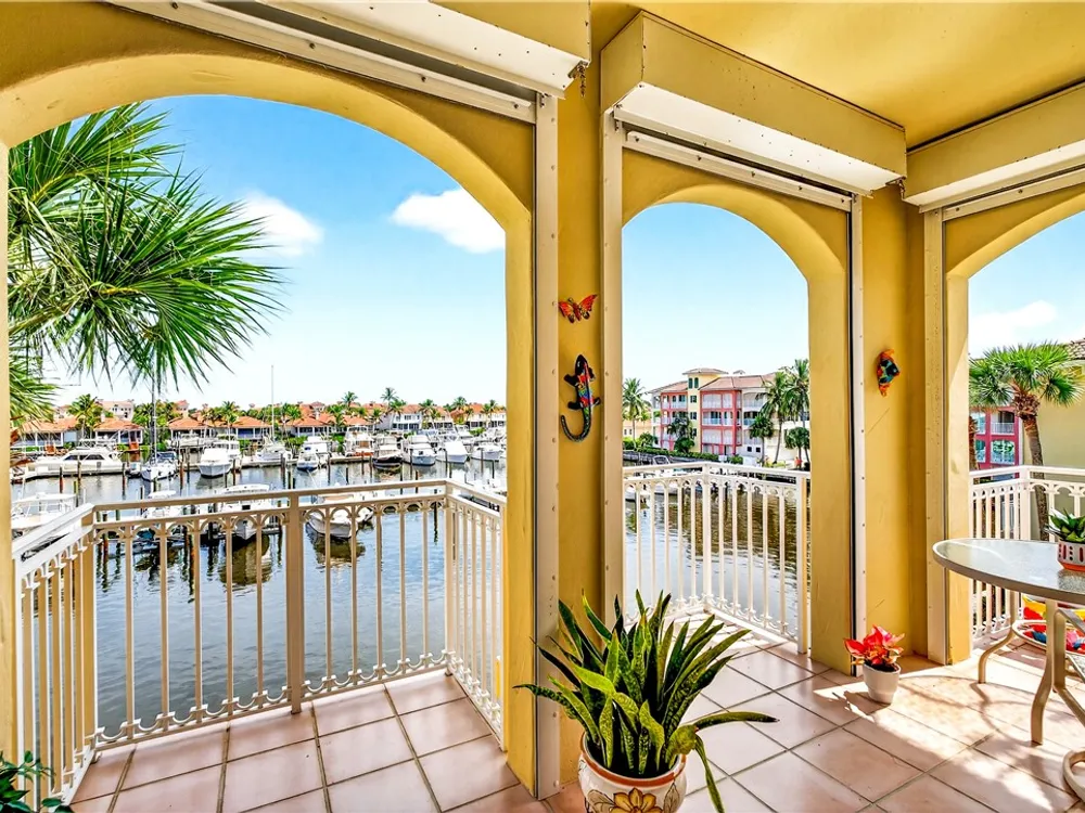 Rarely available three-bedroom penthouse with stunning views of the Marina to the east and golf to the west. Upgrades include tankless hot water system, with whole house water purification, impact glass, shutters and granite kitchen countertops. The condo was re-piped in 2023 and exterior painted in 2024. Steps to elevator and community pool. Discounted Grand Harbor Club membership available.