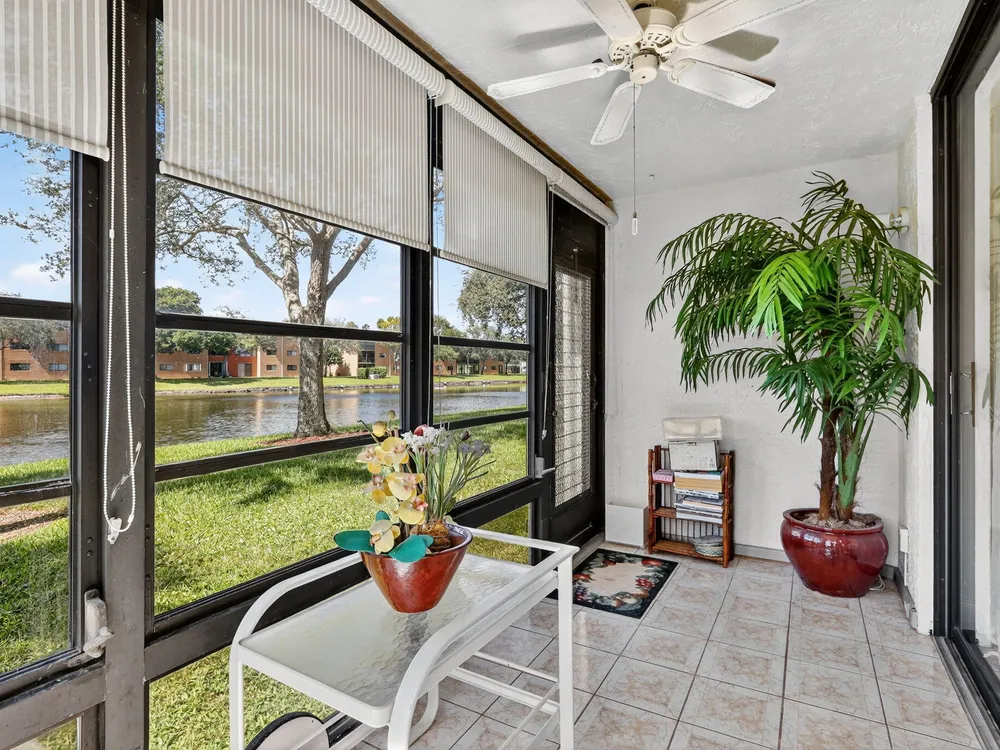 Enjoy this beautifully updated 1st floor corner unit with a wrap-around water view in the vibrant community of Lakes of Delray. The location is ideal. 2 bedrooms, 2 baths. Luxurious wood flooring throughout the living area. A spacious kitchen with a cozy and convenient breakfast area and new blinds. The master bedroom has brand new wood-look floors. New ceiling fan and blinds also in the master. The primary bath was just completely renovated with dual sinks, new porcelain tile floors, quartz counters and contemporary cabinetry. The enclosed patio overlooks the tranquil lake and grassy expanse. The Lakes of Delray is an active community with a wide array of activities, clubs and entertainment.