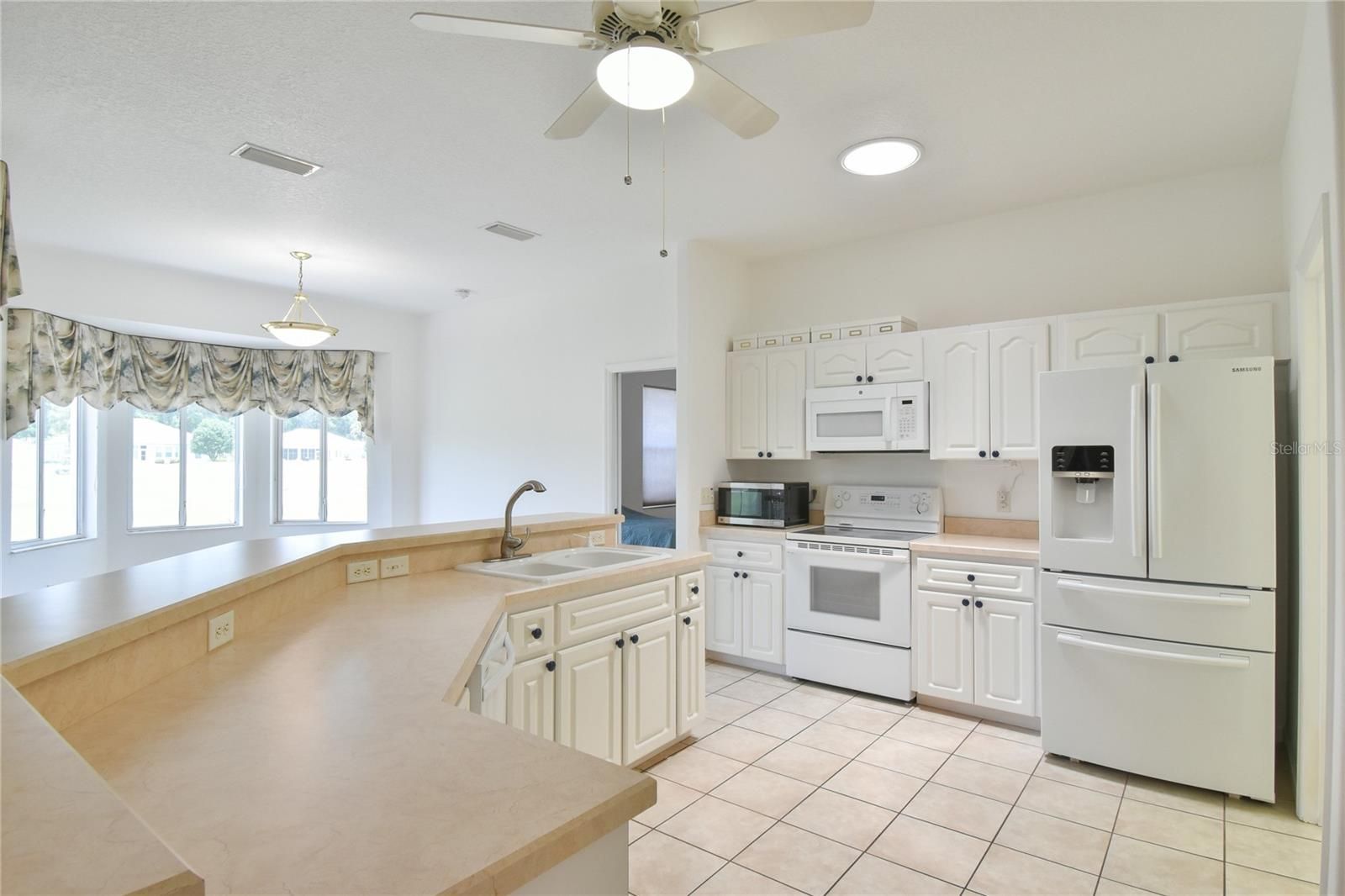 JUST REDUCED $40,000 FOR QUICK SALE!!! OUTSTANDING GOLF COURSE VIEW from this most desired floor plan in Ocala Palms. This house has an open floor plan with a large living room which as room for a large, screened television and a view of the large kitchen with built-in range, time-saving dishwasher, refrigerator and clear top range with a microwave. The dining room overlooks the kitchen for easy conversations. The laundry room is located off the kitchen for easy access and has additional shelves for storage. The Master bedroom has room for a king-size bed and ample furniture. This house offers a walk-in closet and a built in closet. The Master bathroom has a double sink vanity, walk-in shower, soaking tub and tile flooring. The guest bedroom has a view of the golf course and has a built-in closet. The guest bathroom has a full tub and shower and a vanity with plenty of storage. The Florida room has a great view of the golf course! This house is priced-to-sell! Ocala Palms is a gated active 55+ community located on North Highway 27 in Ocala, Florida. This community offers an 18-hole Golf Course for golf enthusiasts and Country Club-Style living for active adults. Golfers can also practice on the driving range and putting green so they can step up their golf game skills. It boasts a 19,000 square-foot clubhouse. Here is a sample of activities and amenities offered: Clubhouse/Amenity center, fitness center, Outdoor Olympic pool, hot tub, heated indoor pool, card room, arts & crafts studio, ballroom, library, billiards, bocce ball, shuffleboard courts walking & biking trails, volleyball court, tennis/pickleball courts, horseshoe pit, and croquet lawns. Ocala Palm is a very family friendly community and is located close to shopping centers, supermarkets, drug stores, restaurants, banks, doctors’ offices, hospitals, postal office department stores, etc. For family entertainment, Ocala features year-round public festivals events, canoeing, kayaking, paddle boating, horseback riding, fishing, etc. Close to tourist attractions like World Disney Parks, Universal Studios, Sea World, Bush Garden, World Equestrian Center, numerous beaches, etc. All measurements are approximate. Buyer(s) to re-measure.