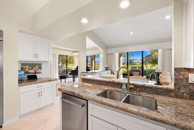 Located behind the exclusive Palmer Private gates at PGA West, this beautifully refreshed Legends 40 Plan enjoys a peaceful setting on a quiet interior street with picturesque views of the #1 Fairway of the Palmer Private Course and close to the Private Club House. A private courtyard entry welcomes you into this spacious lot, while the airy foyer showcases a naturally lit atrium that instantly sets a warm and inviting tone for the home.Designed for both comfort and entertaining, the spacious living room features a sleek new gas fireplace insert with a glass screen, perfect for cozy evenings, while the adjacent dining room flows seamlessly into the newly reimagined kitchen. A cook's dream, the kitchen now boasts new cabinetry, new granite breakfast bar, premium stainless appliances including a 42'' refrigerator, a gas cooktop, and ample prep space--all opening to the family room for optimal connectivity and social gathering.The large primary suite has been transformed into a spa-like sanctuary with a completely updated bathroom featuring new tile flooring and a new shower, refreshed cabinetry, and an upgraded custom closet system. Two additional guest bedrooms also offer en-suite privacy, each thoughtfully upgraded with new tile, vanities, counters, and fixtures. Additional enhancements include fresh interior paint throughout, new carpet in all three bedrooms, new curtains, a striking new entry chandelier, five replaced sliding doors with new screens, and updated laundry and powder bathrooms. Outdoors, the atrium has been reimagined with newly installed pavers and a tranquil fountain--perfect for morning coffee or evening wine. Ample patio space provides multiple areas to dine al fresco or lounge while taking in beautiful golf course views, and you're just steps away from the sparkling community pool and spa.PGA West offers 3 private and 3 public golf courses, tennis, pickleball, 3 clubhouses, restaurants,& 24-hour guard-gated security.HOA dues conveniently cover building structure,exterior paint, roof,full landscaping & irrigation,internet, cable, trash, and more--making ownership effortless. Silver golf cart included