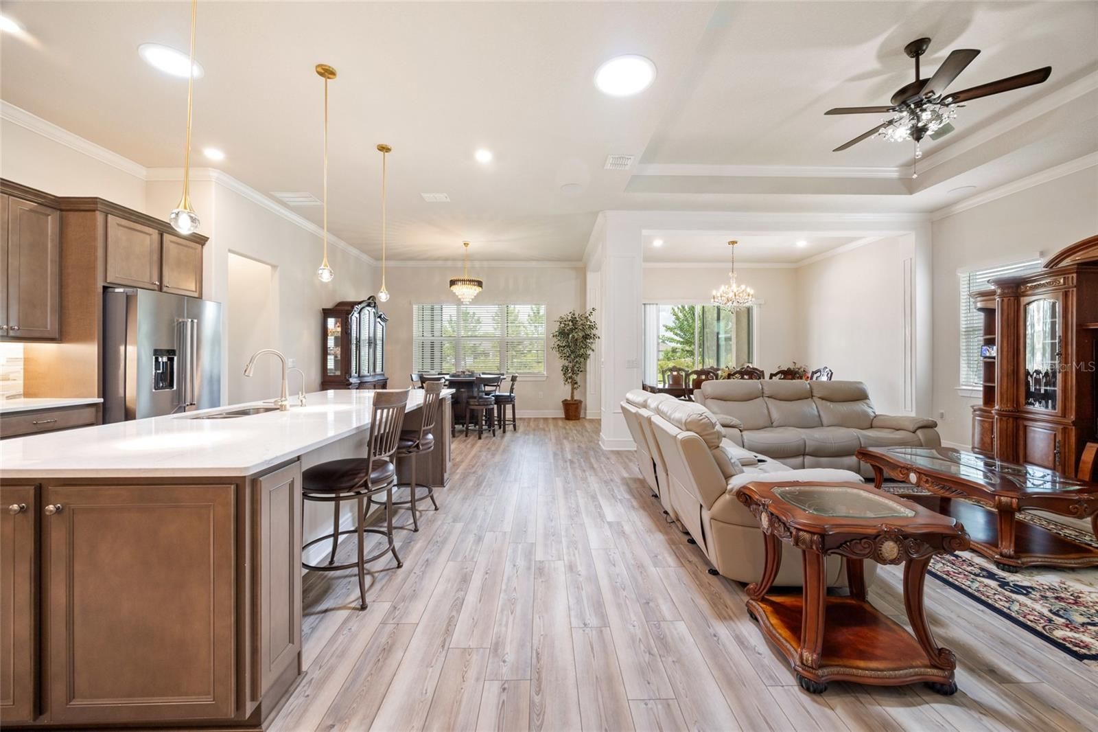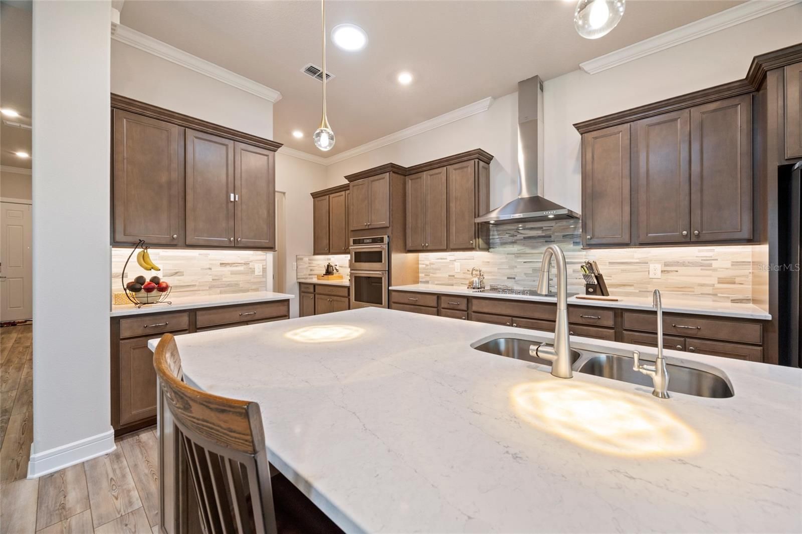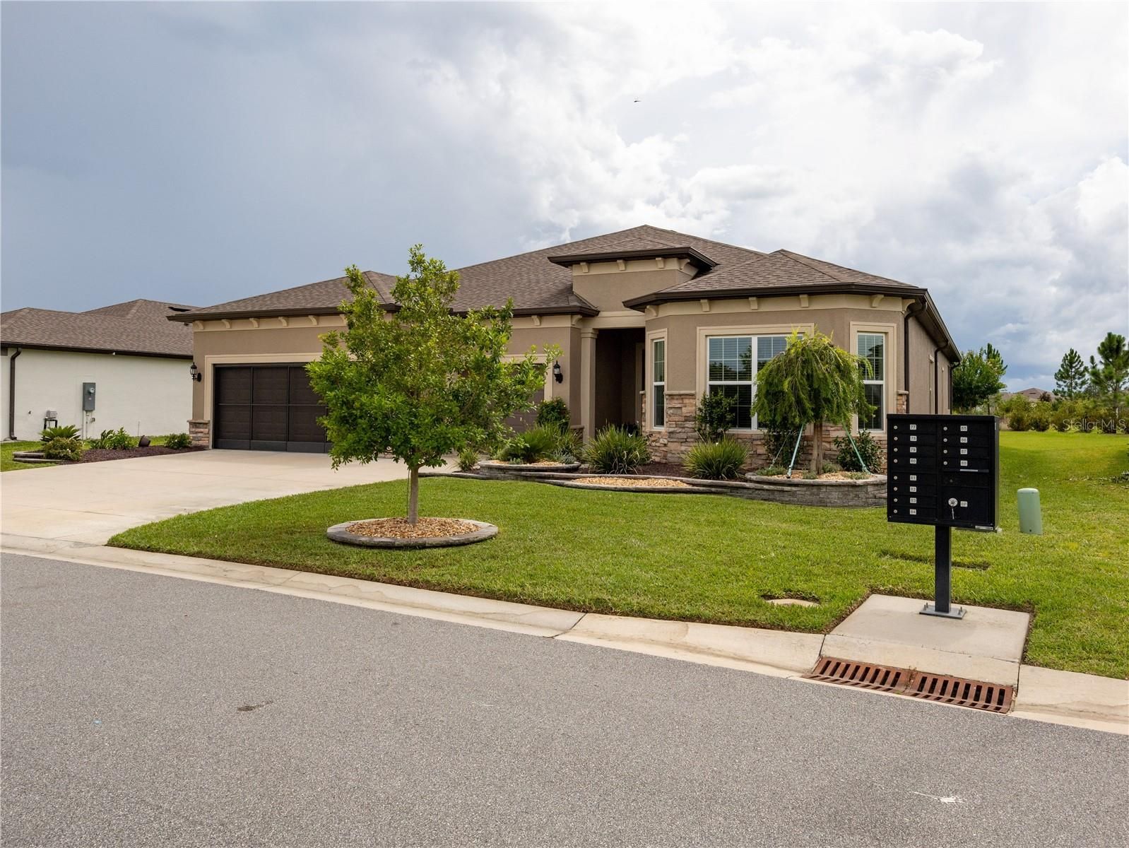 SAVE UP TO $10,000 BUYING RESALE! This one is already built — no waiting to build new! Step into luxury with this stunning extended smart home Renown model located in the highly sought-after Del Webb Stone Creek community. This spacious residence features three bedrooms, three and a half bathrooms, a versatile flex room, and a 3-car extended garage, offering the perfect blend of style and functionality. The luxurious kitchen is a chef’s dream, showcasing quartz countertops, an upgraded backsplash, under-cabinet lighting, and abundant storage with 42-inch soft-close cabinets, pull-out drawers, and deep drawers for cookware. It also includes top-of-the-line KitchenAid stainless steel appliances and a reverse osmosis system for pure drinking water. Elegant crown molding graces all living areas, the den, and the primary bedroom, while luxury vinyl plank flooring runs throughout the main living areas and flex room. The open-concept layout is enhanced by 8' interior Cheyenne doors, curved drywall corners, tall baseboards, ceiling fans, and a built-in surround sound system, creating the perfect space for entertaining or everyday comfort. Each bedroom includes its own private bathroom, offering comfort and privacy for guests. The primary suite impresses with a tray ceiling, a zero-entry tiled shower featuring a bench and wall niche, and two spacious walk-in closets. Additional upgrades include premium hardware and faucets, a water softener system, LED downlight package, whole-home surge protector, pre-plumb for an outdoor kitchen, pre-wire for pool or spa, and four solar light tubes that provide natural illumination throughout the home. Enjoy your morning coffee or evening cocktail on the spacious screened lanai overlooking the tranquil backyard. The garage provides an extra four feet of space for storage or hobbies, pull-down attic access, and a durable epoxy floor that blends function with style. Immerse yourself in the exceptional amenities and vibrant lifestyle that Del Webb Stone Creek has to offer. This home is move-in ready and waiting for you to make it your own!