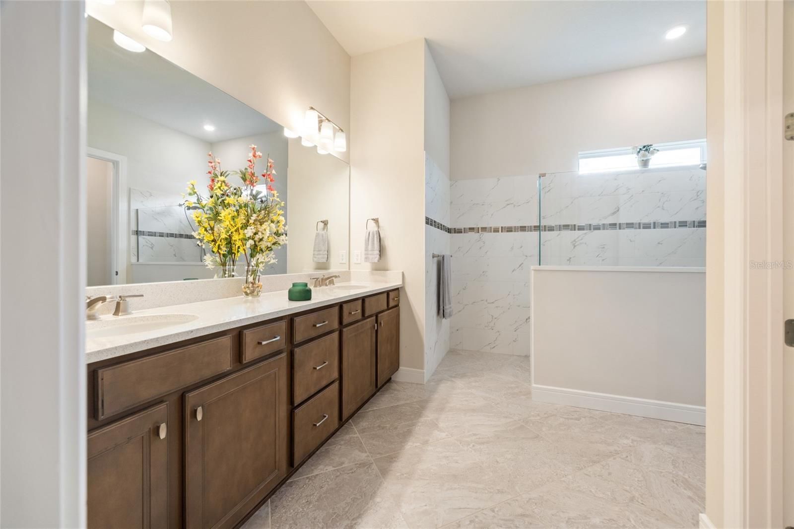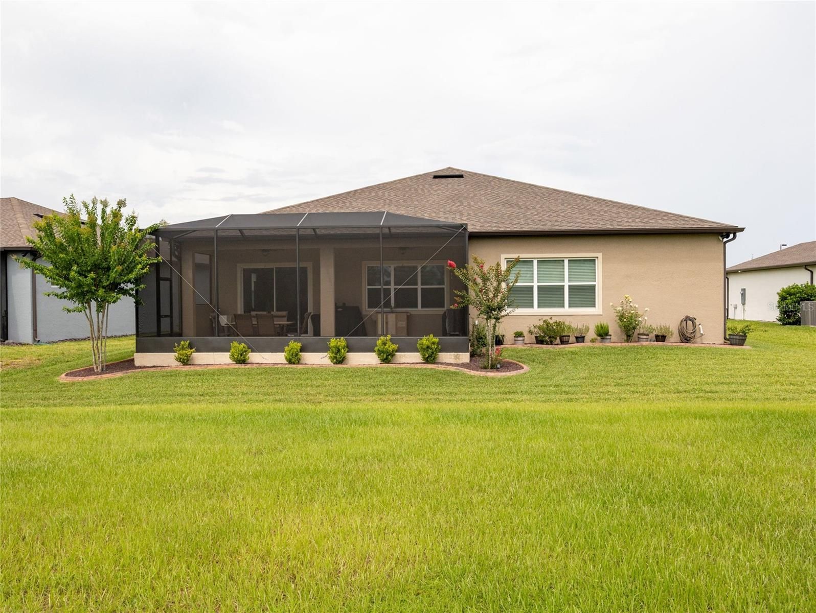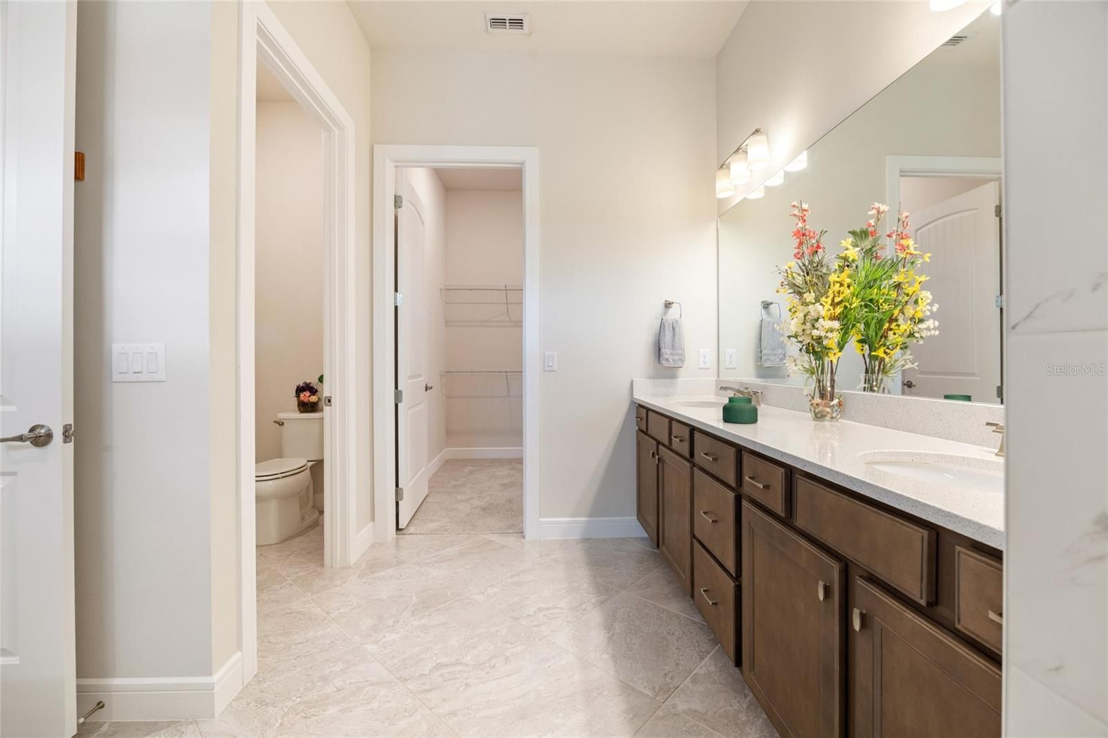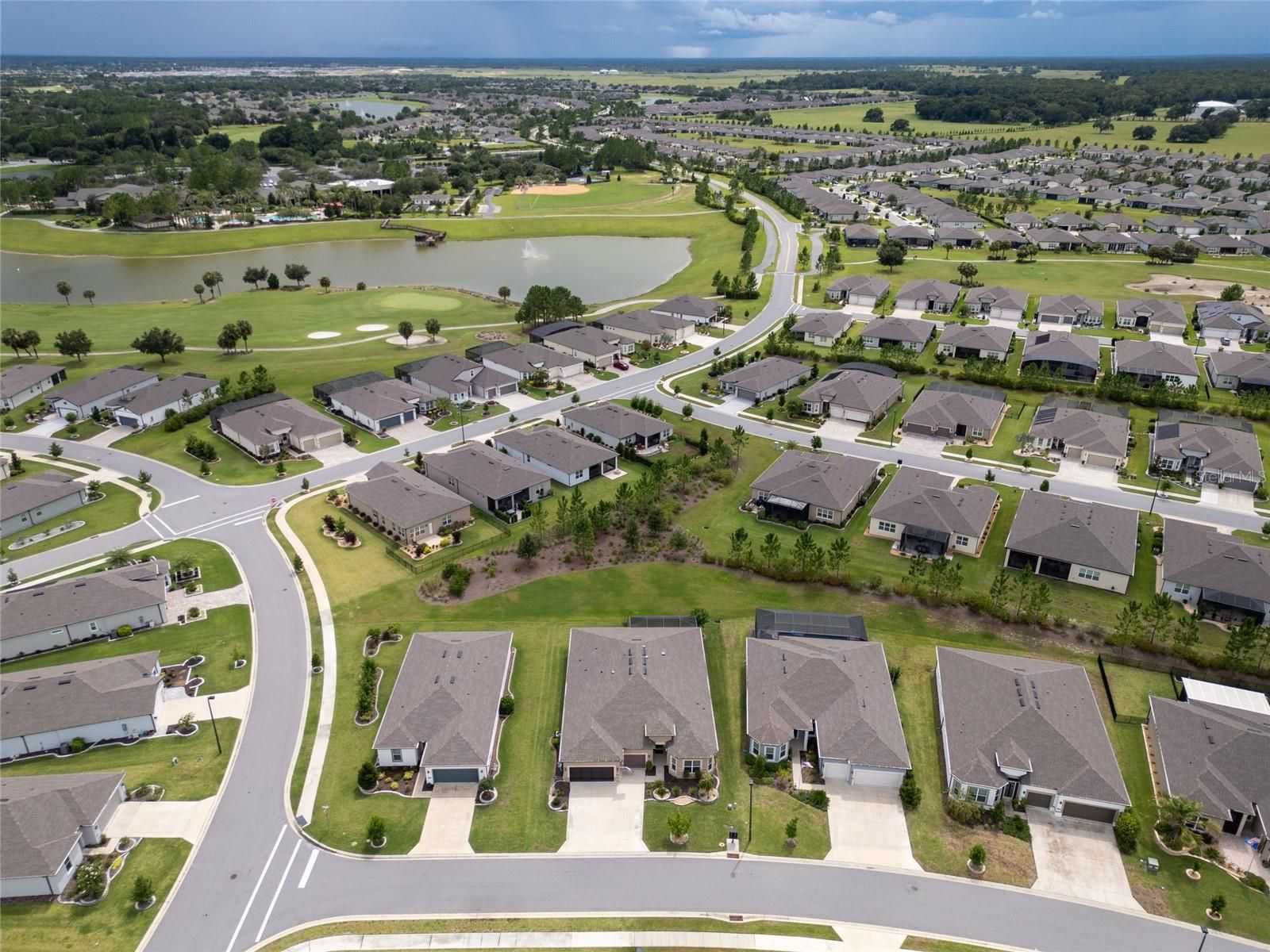SAVE UP TO $10,000 BUYING RESALE! This one is already built — no waiting to build new! Step into luxury with this stunning extended smart home Renown model located in the highly sought-after Del Webb Stone Creek community. This spacious residence features three bedrooms, three and a half bathrooms, a versatile flex room, and a 3-car extended garage, offering the perfect blend of style and functionality. The luxurious kitchen is a chef’s dream, showcasing quartz countertops, an upgraded backsplash, under-cabinet lighting, and abundant storage with 42-inch soft-close cabinets, pull-out drawers, and deep drawers for cookware. It also includes top-of-the-line KitchenAid stainless steel appliances and a reverse osmosis system for pure drinking water. Elegant crown molding graces all living areas, the den, and the primary bedroom, while luxury vinyl plank flooring runs throughout the main living areas and flex room. The open-concept layout is enhanced by 8' interior Cheyenne doors, curved drywall corners, tall baseboards, ceiling fans, and a built-in surround sound system, creating the perfect space for entertaining or everyday comfort. Each bedroom includes its own private bathroom, offering comfort and privacy for guests. The primary suite impresses with a tray ceiling, a zero-entry tiled shower featuring a bench and wall niche, and two spacious walk-in closets. Additional upgrades include premium hardware and faucets, a water softener system, LED downlight package, whole-home surge protector, pre-plumb for an outdoor kitchen, pre-wire for pool or spa, and four solar light tubes that provide natural illumination throughout the home. Enjoy your morning coffee or evening cocktail on the spacious screened lanai overlooking the tranquil backyard. The garage provides an extra four feet of space for storage or hobbies, pull-down attic access, and a durable epoxy floor that blends function with style. Immerse yourself in the exceptional amenities and vibrant lifestyle that Del Webb Stone Creek has to offer. This home is move-in ready and waiting for you to make it your own!