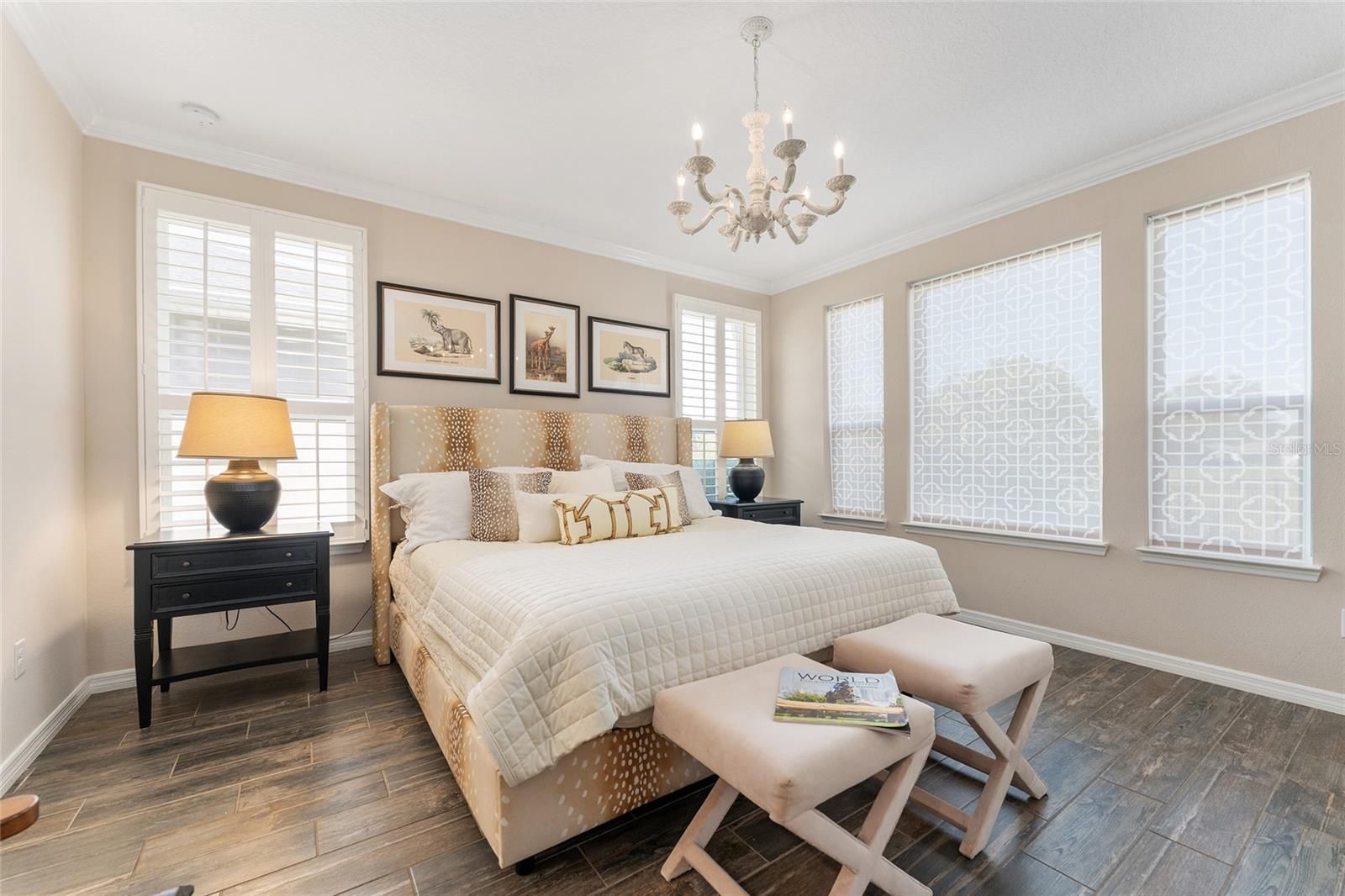 - Built-in Features, Ceiling Fan(s), Crown Molding, Eat-in Kitchen, High Ceilings, Kitchen/Family Room Combo, Open Floorplan, Main Level Primary, Solid Surface Counters, Solid-Wood Cabinets, Split Bedrooms, Stone Counters, Thermostat, Walk-In Closet(s), Window Treatments