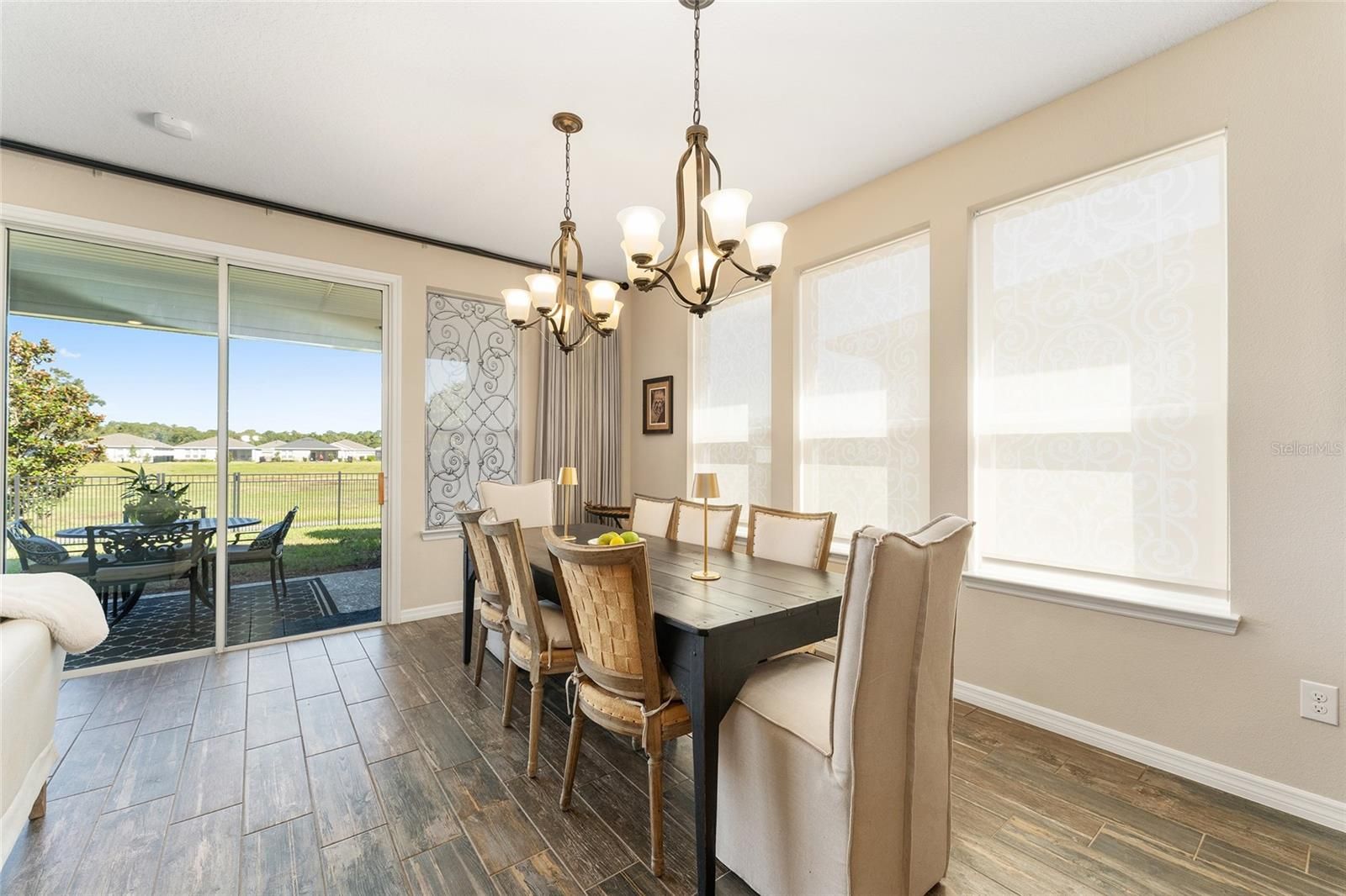 Resort-style living in Ocala Preserve with open backyard views. This spacious 3-bedroom, 3-bath home offers 2,348 sq ft of interior living space and a fully fenced backyard with open northern views for a private, peaceful setting. Located 10 minutes to the World Equestrian Center, and with easy access to community walking trails, golf-cart paths, two clubhouses, multiple pools and recreation amenities including pickleball, tennis, gym and workout paths. The open floor plan flows for entertaining, and features a large kitchen with ample cabinets, pantry, and gas stove in the island; great room with spacious entertaining area, dining area, and a separate reading nook; and a generous master bedroom suite with walk-in shower, walk-in closet with access to the laundry room, a private office, second spacious bedroom and full bath. The second floor offers a sitting room/office, third bedroom and full bath—ideal for guests. Upgrades include custom window treatments including Dehlia designer shades, plantation shutters and custom drapes; full-wall wood treatments; crown molding, upgraded light fixtures, ceiling fans, and tile flooring throughout the first floor. Enjoy privacy, upgrades, and resort-style amenities in one exceptional home.