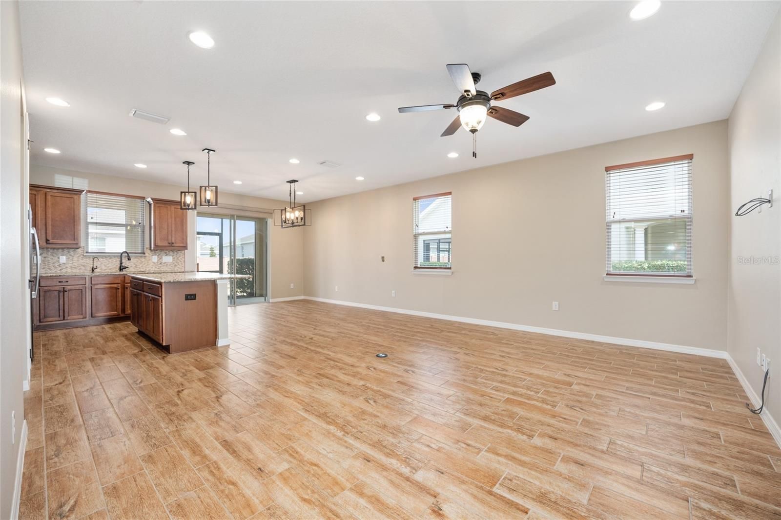 - Ceiling Fan(s), Eat-in Kitchen, Kitchen/Family Room Combo, Living/Dining Room, Solid Surface Counters, Split Bedrooms, Stone Counters, Thermostat, Walk-In Closet(s)