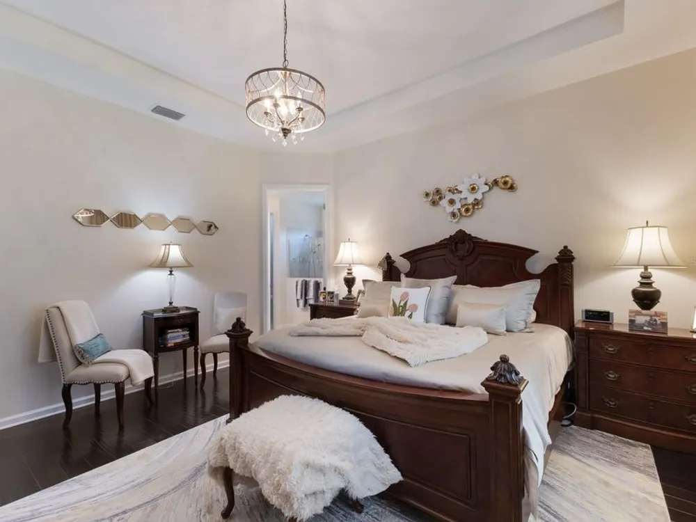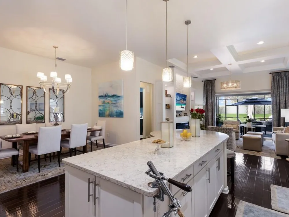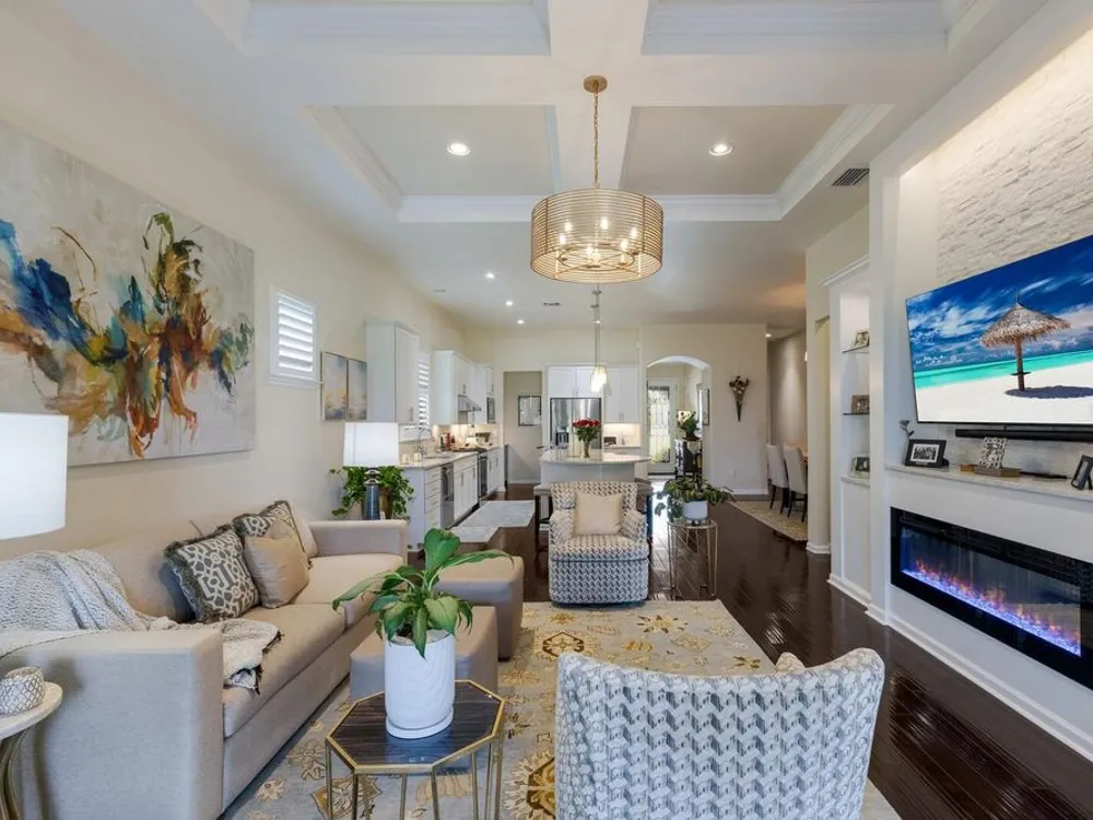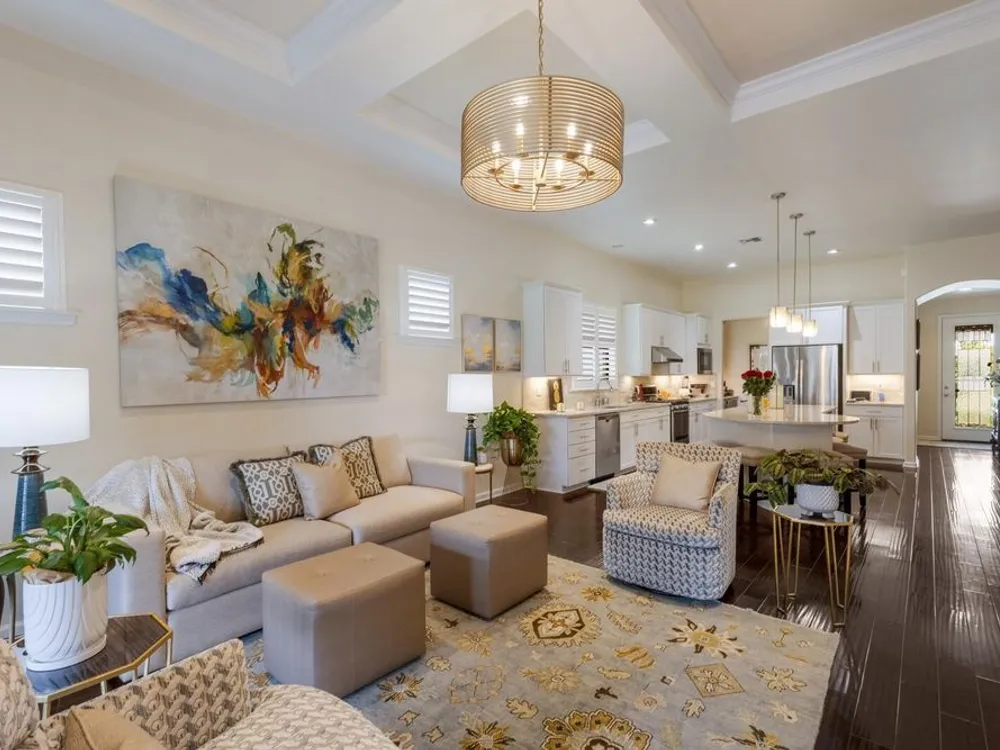 - Coffered Ceiling(s), Eat-in Kitchen, High Ceilings, Kitchen/Family Room Combo, Open Floorplan, Main Level Primary, Solid-Wood Cabinets, Split Bedrooms, Stone Counters, Thermostat, Tray Ceiling(s), Walk-In Closet(s)