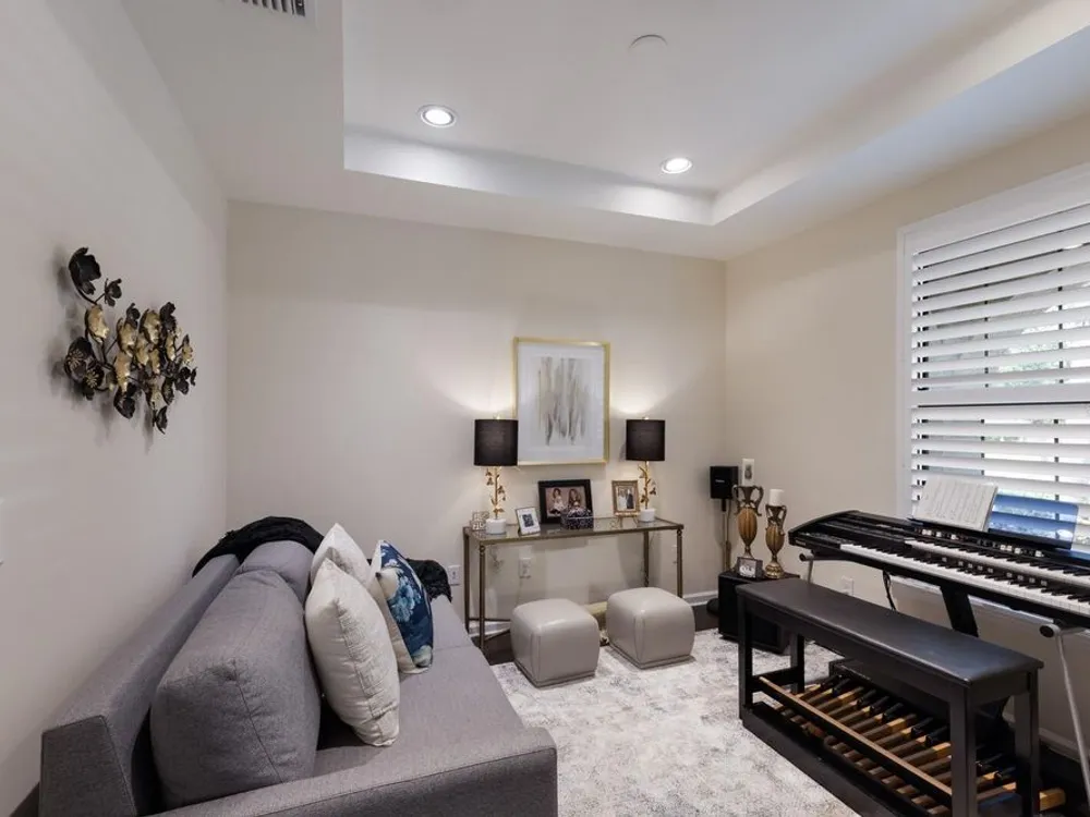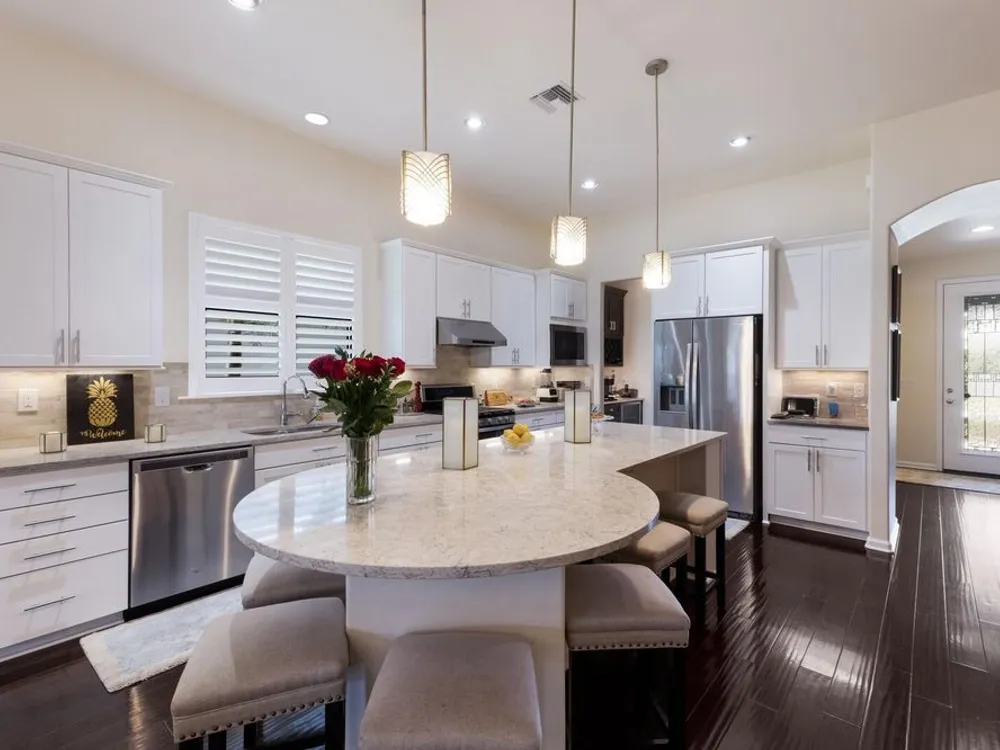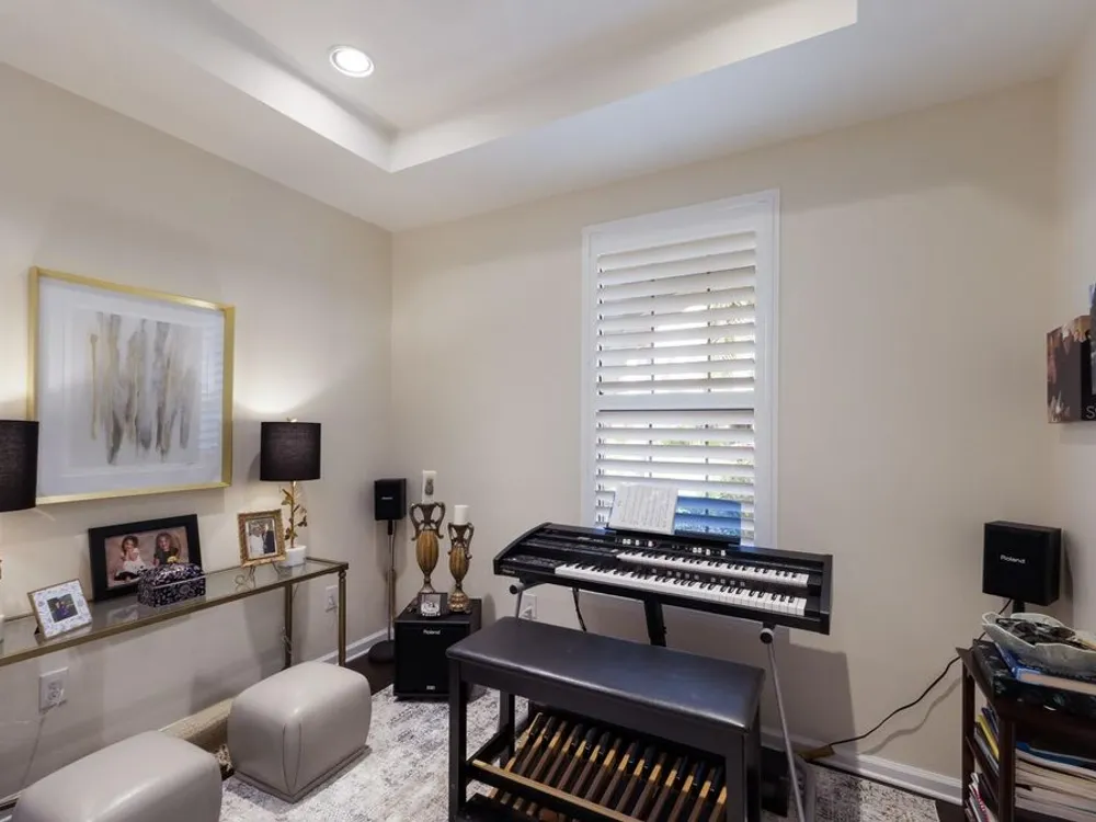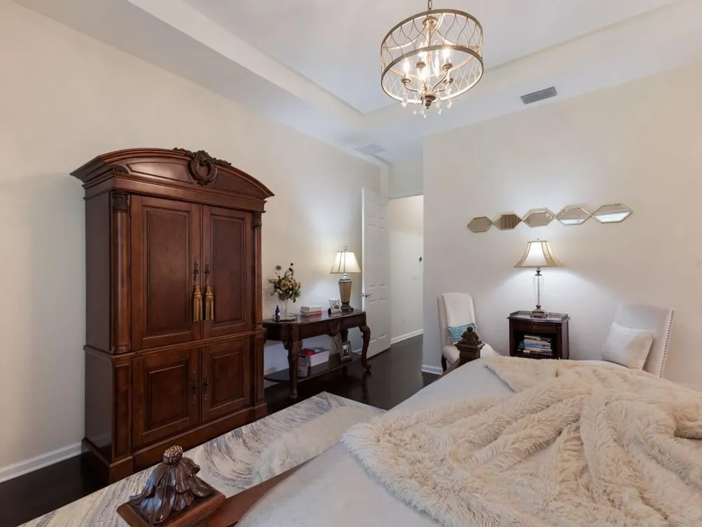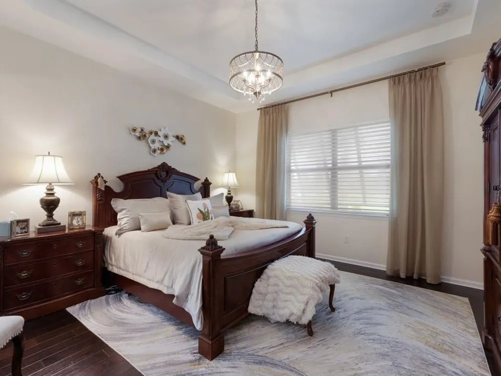 - Coffered Ceiling(s), Eat-in Kitchen, High Ceilings, Kitchen/Family Room Combo, Open Floorplan, Main Level Primary, Solid-Wood Cabinets, Split Bedrooms, Stone Counters, Thermostat, Tray Ceiling(s), Walk-In Closet(s)