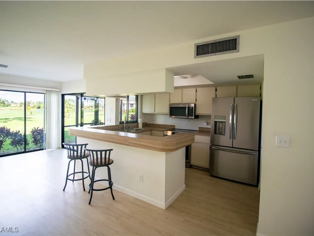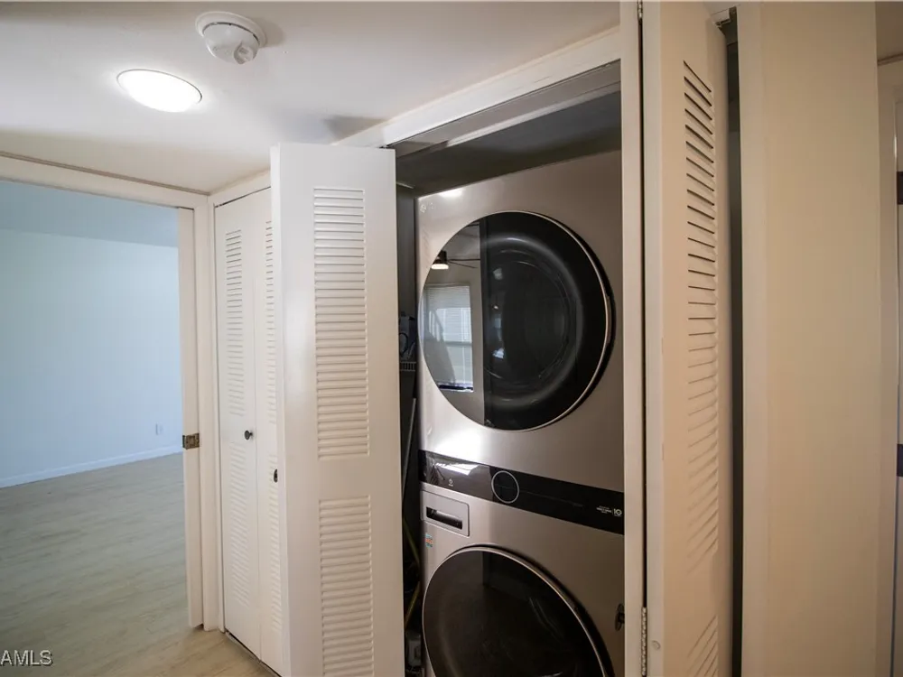 Welcome to this stunning condo located in Hideaway Country Club. This property offers 1187 sqft of living space and features 3 bedrooms and 2 bathrooms. The modern design and high-quality finishes make this home a true gem. The open-concept layout creates a spacious and inviting atmosphere, perfect for entertaining guests or simply relaxing at home. Top of the line luxury vinyl plank flooring has been installed through the entire home. The kitchen is equipped with stainless steel appliances and ample cabinet/pantry space. The brand new appliances include a french door refrigerator, dishwasher, induction cooktop range, microwave, stacked washer and dryer each with a 3 year warranty. The bedrooms are well-appointed with large windows that allow plenty of natural light to filter in. Step outside to the screened lanai and discover a peaceful retreat where you can enjoy the Florida sunshine. The expansive golf course view adds a beautiful backdrop to this home. The murphy bed in the third bedroom creates the perfect flex space to be a home office while also serving as a guest room when needed. The home includes an assigned covered parking space. Just steps away from the beautiful clubhouse and restaurant this home makes it easy for the owner to enjoy all of the amenities the community offers including the 18 hole golf course.