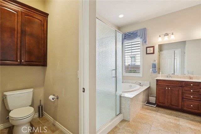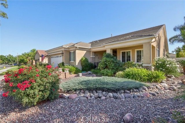Welcome to Resort-Style Living in the 55+ Community of Solera Diamond Valley by Del Webb! This beautifully upgraded 55+ residence combines thoughtful design with comfort and convenience, offering a one-of-a-kind opportunity in Hemet’s premier active adult community. From the moment you arrive, you’ll notice the care and attention poured into every detail. Step inside to find elegant crown molding, plantation shutters, and custom cabinetry throughout the living room, office, craft room, laundry, and master bath. The tiled living room floor with carpet overlay gives you the flexibility of enjoying both tile and carpet. The kitchen is a true chef’s delight, featuring under-cabinet lighting, and a water filtration system. The air-conditioned garage offers exceptional functionality with a built-in workbench, storage racks, and generous space for a second refrigerator and freezer. Outside, you’ll love the xeriscape front yard with river rock, rain gutters, and a welcoming front gate and patio. The backyard is a private retreat, complete with a little fish hole, flagstone paving, bullnose edging, and drip irrigation for effortless maintenance. A dog door adds convenience for pet lovers, while the outdoor storage shed provides extra space for tools and hobbies. Comfort and peace of mind are built in with steel security screen doors, an all-house fan, and a comprehensive exterior surveillance system featuring eight cameras with night vision, motion detection, infrared augmentation, and a large monitor with two-week memory storage. In the master bathroom, you’ll appreciate the step-in shower and thoughtfully placed grab bars for ease and safety. Custom under-cabinet lighting in both the kitchen and office adds style and function. This is not just a home—it’s a lifestyle. Solera Diamond Valley offers resort-style amenities, including a clubhouse, pools, fitness center, walking trails, and a vibrant calendar of community events. Come see why this home stands out from the rest—schedule your private tour today!