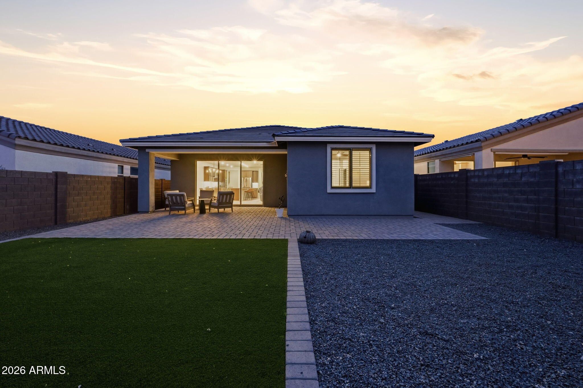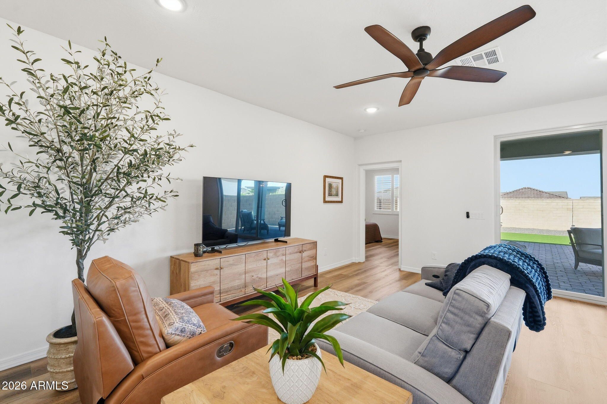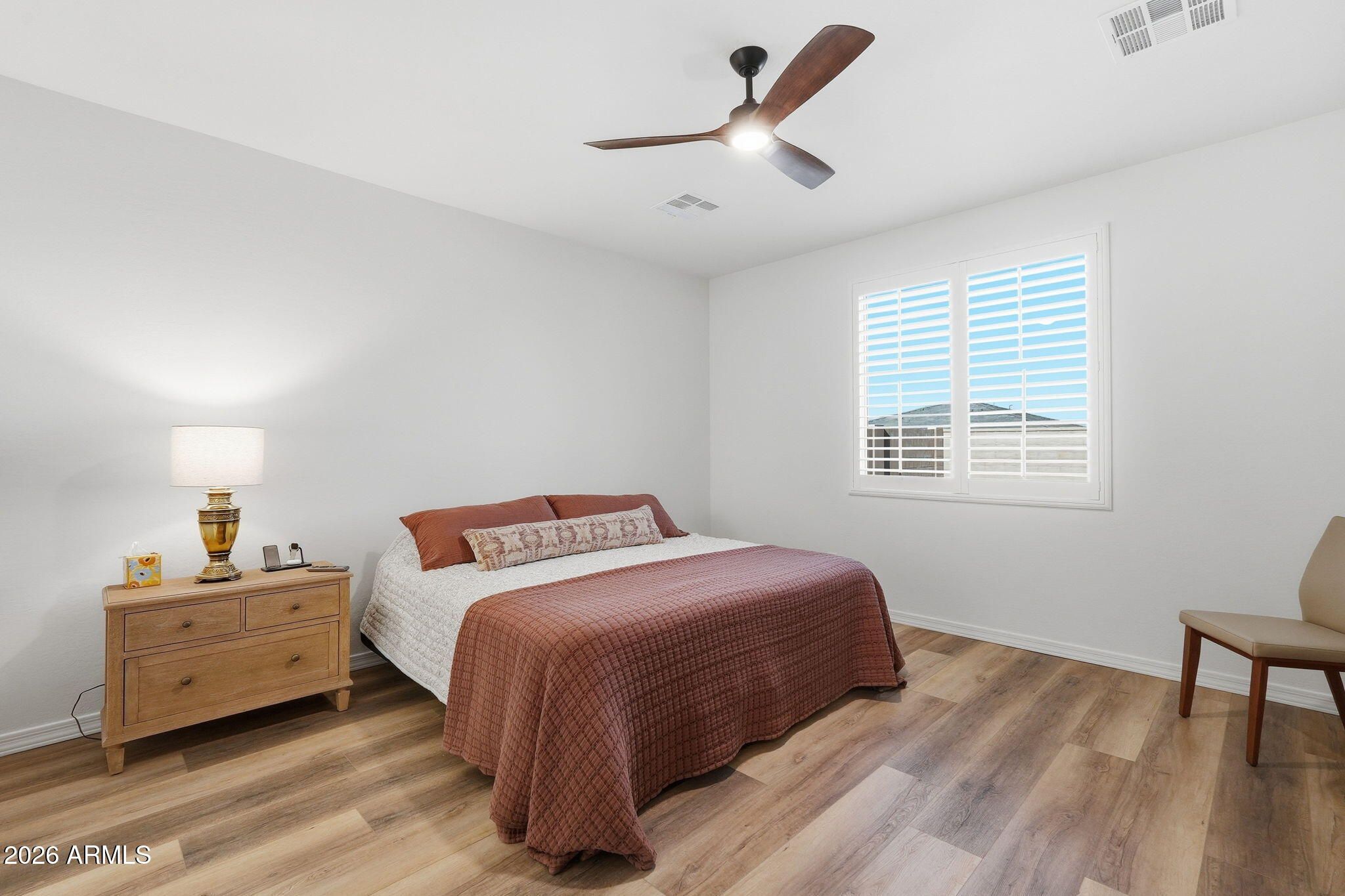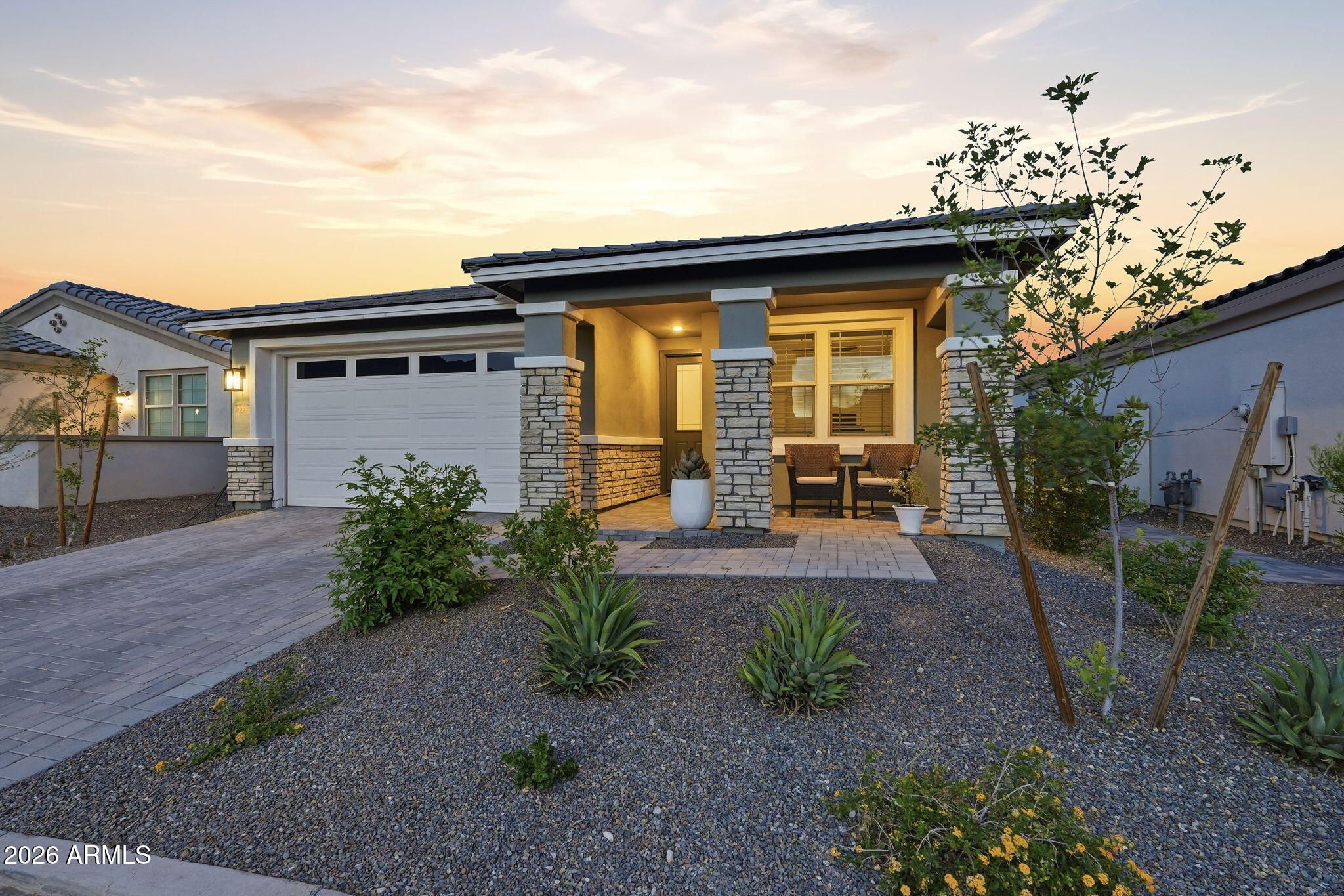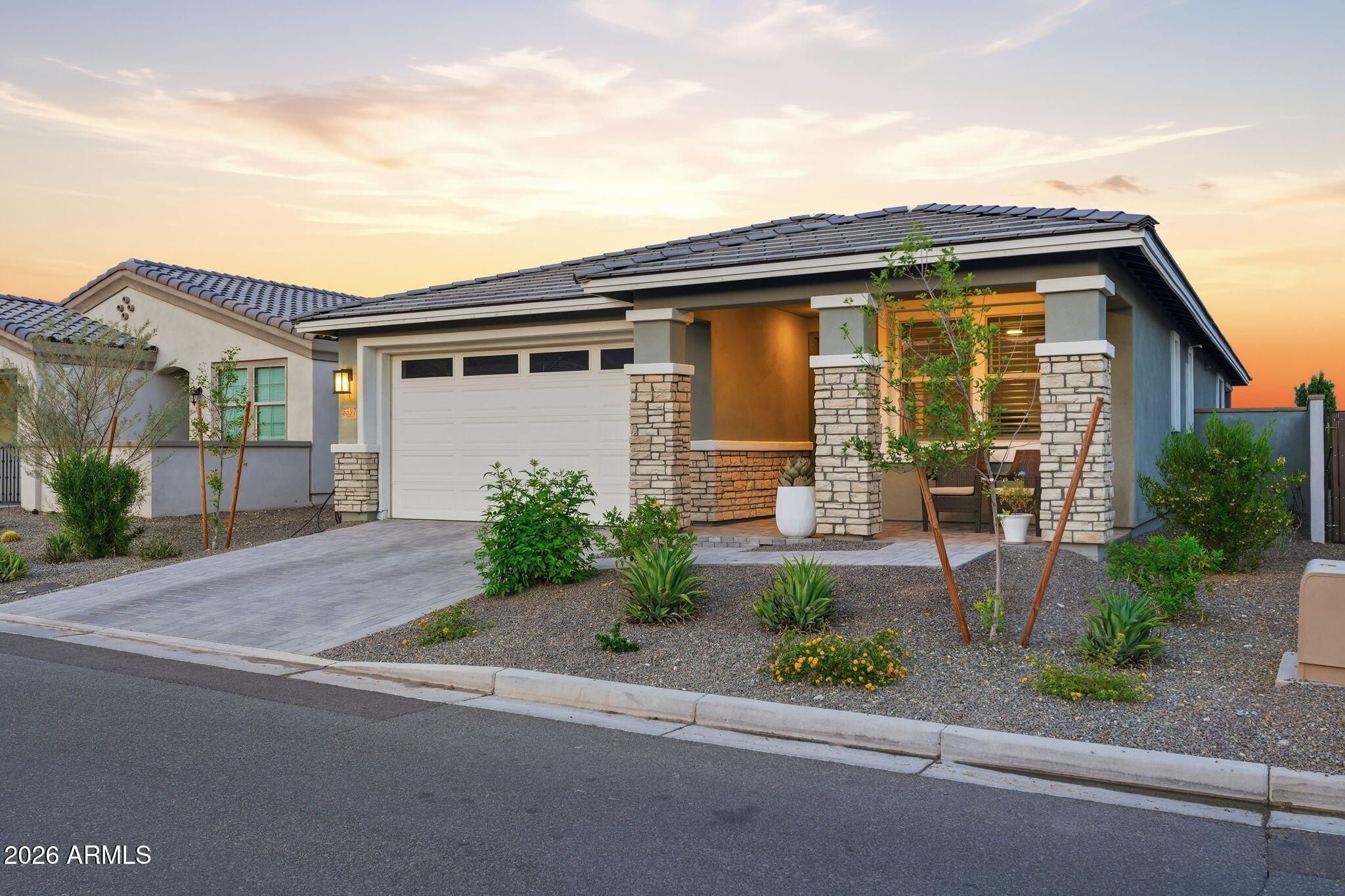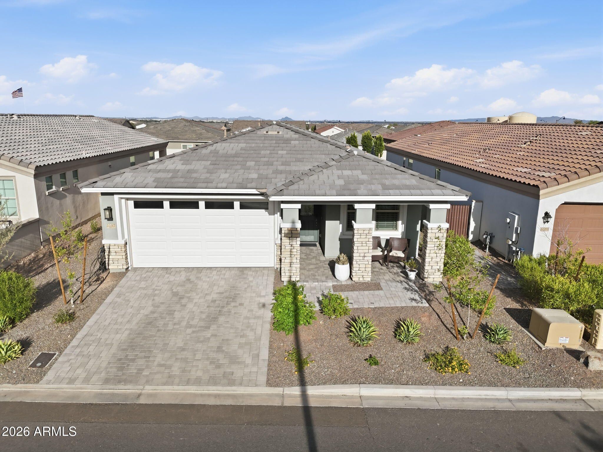 Welcome to this stunning upgraded Sawgrass floorplan by William Ryan Homes, nestled in the highly sought-after 55+ Victory at Verrado community! White Tank Mountain views! This 2-bedroom plus den residence features an open great room layout accented by elegant plantation shutters. The gourmet kitchen is a chef's dream, boasting shaker cabinetry, a gas cooktop, wall ovens, a butler's pantry & a large island. The private master retreat offers a dual-sink vanity & an oversized tiled shower with bench seating. Guests will appreciate the spacious 2nd bedroom with a walk-in closet & en-suite bath. Outside, sliding doors lead to a covered patio & a landscaped backyard with no rear neighbors!!! Complete with a large laundry room and a 2-car garage, this home is the ultimate desert sanctuary