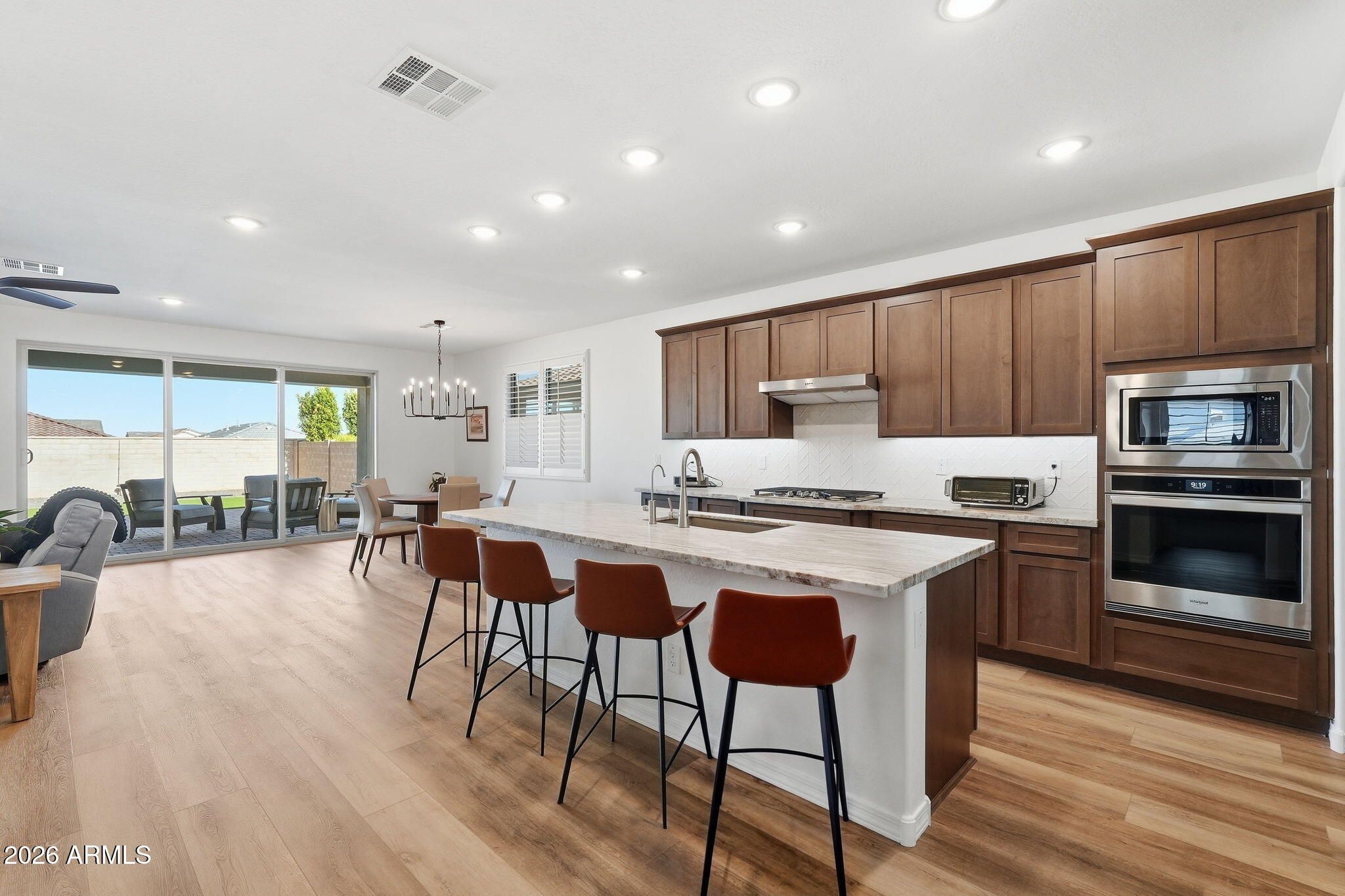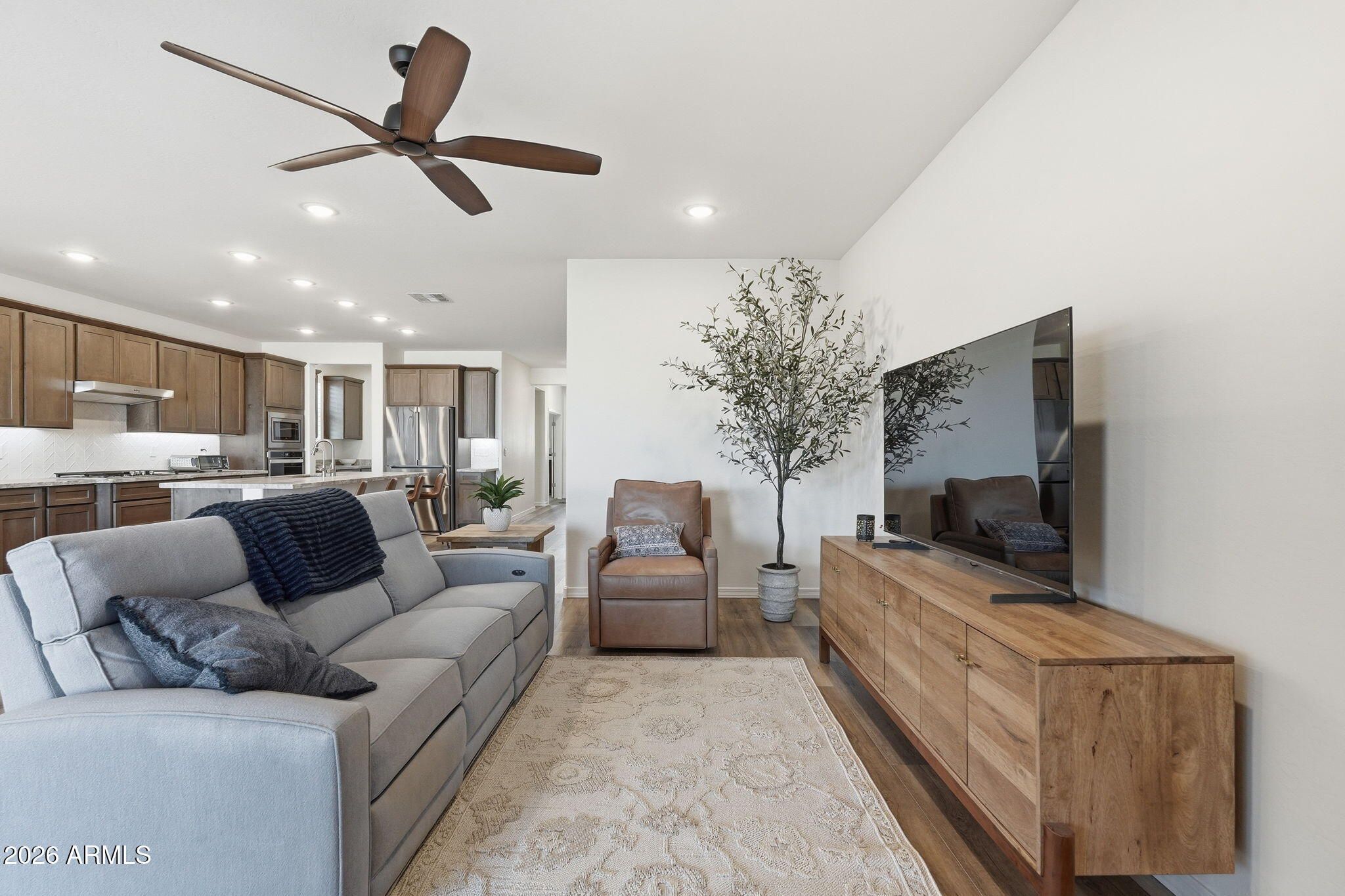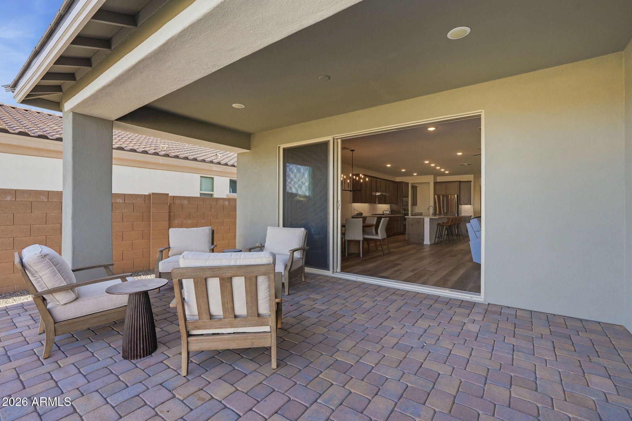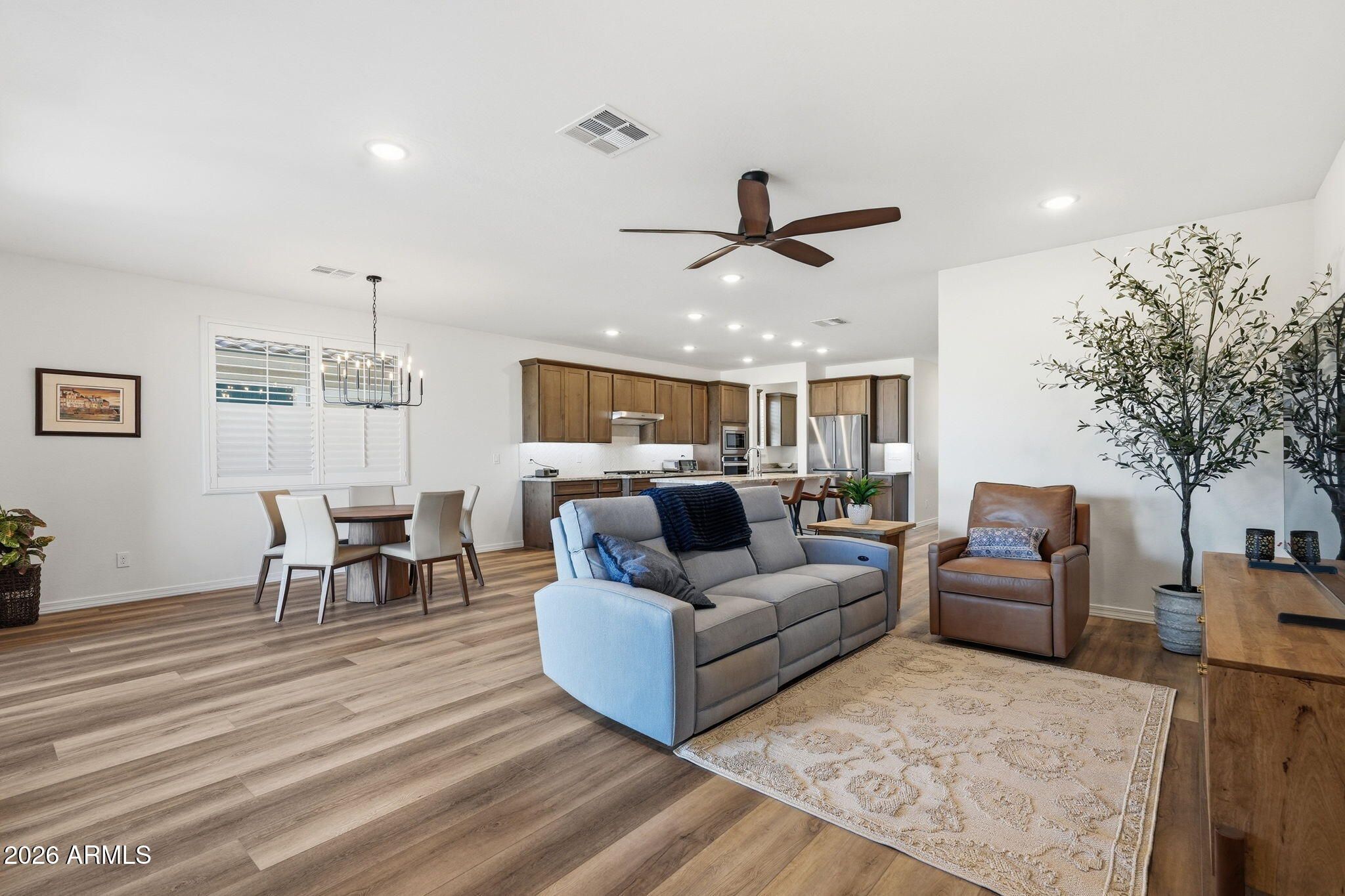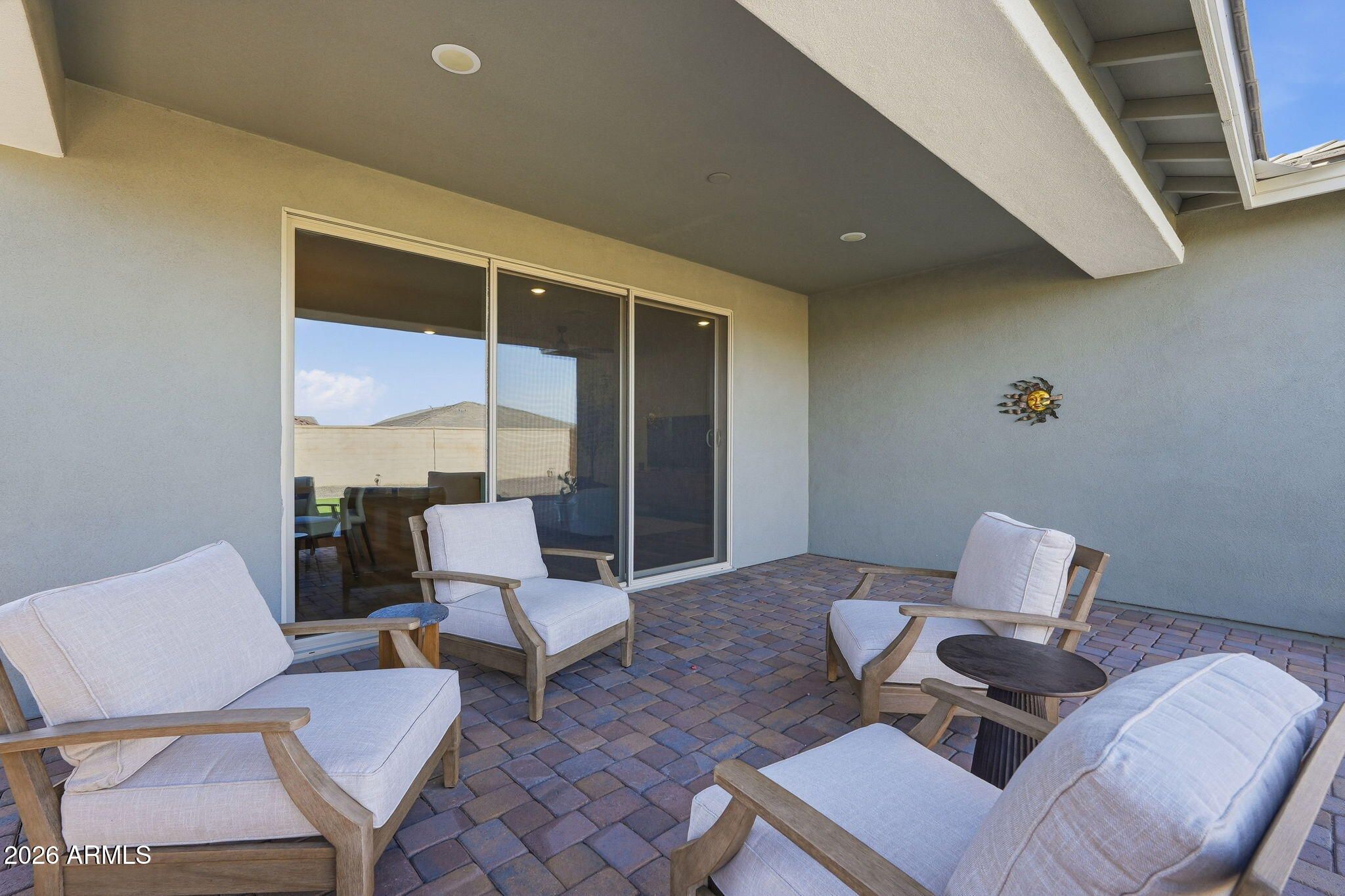 Welcome to this stunning upgraded Sawgrass floorplan by William Ryan Homes, nestled in the highly sought-after 55+ Victory at Verrado community! White Tank Mountain views! This 2-bedroom plus den residence features an open great room layout accented by elegant plantation shutters. The gourmet kitchen is a chef's dream, boasting shaker cabinetry, a gas cooktop, wall ovens, a butler's pantry & a large island. The private master retreat offers a dual-sink vanity & an oversized tiled shower with bench seating. Guests will appreciate the spacious 2nd bedroom with a walk-in closet & en-suite bath. Outside, sliding doors lead to a covered patio & a landscaped backyard with no rear neighbors!!! Complete with a large laundry room and a 2-car garage, this home is the ultimate desert sanctuary