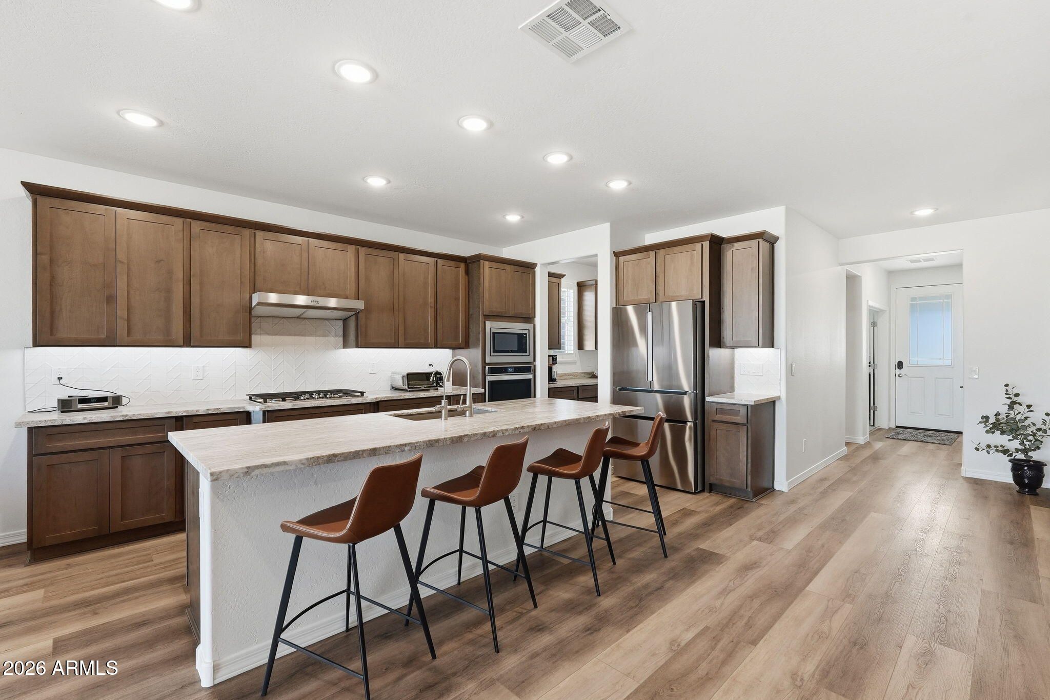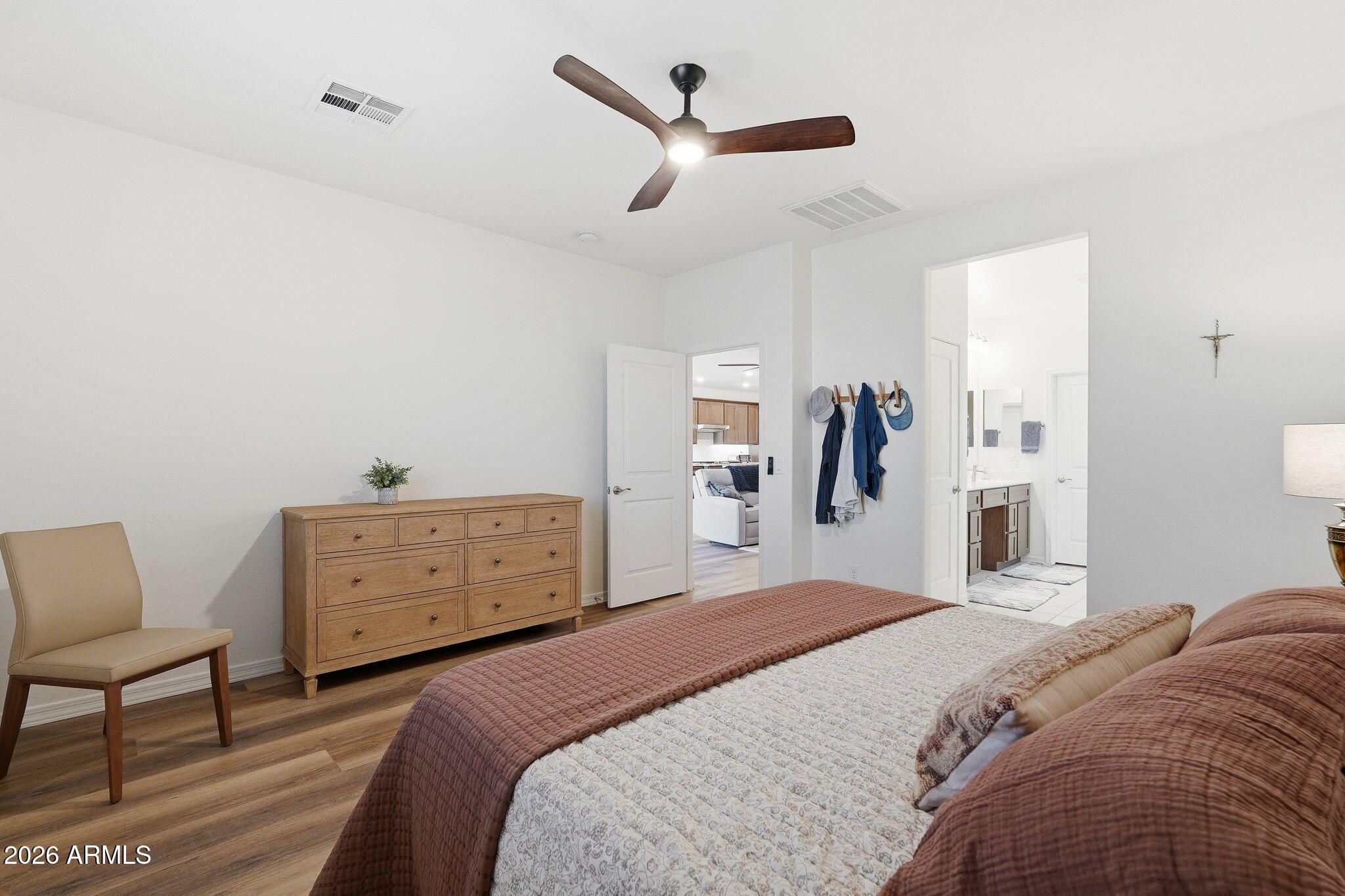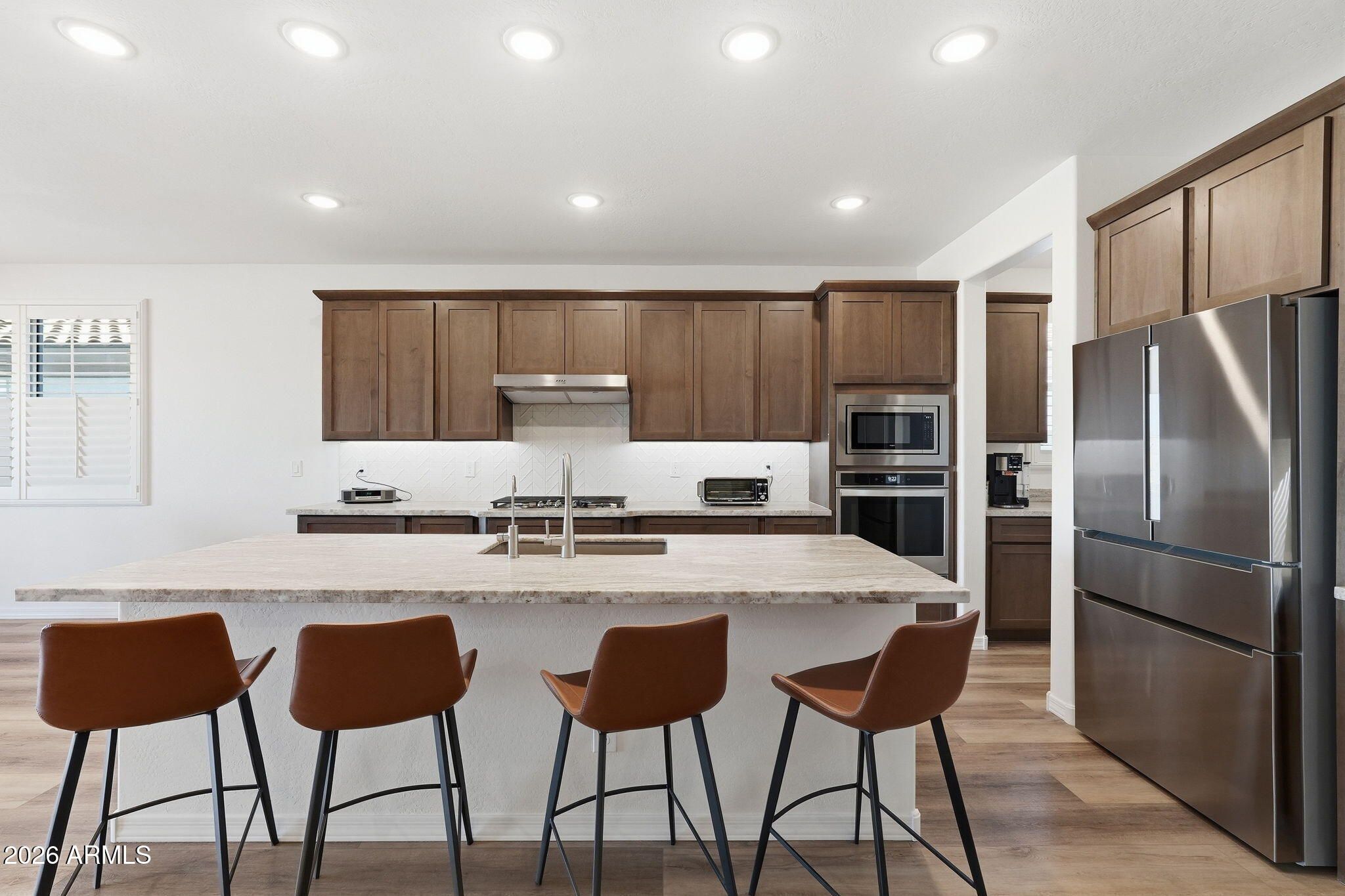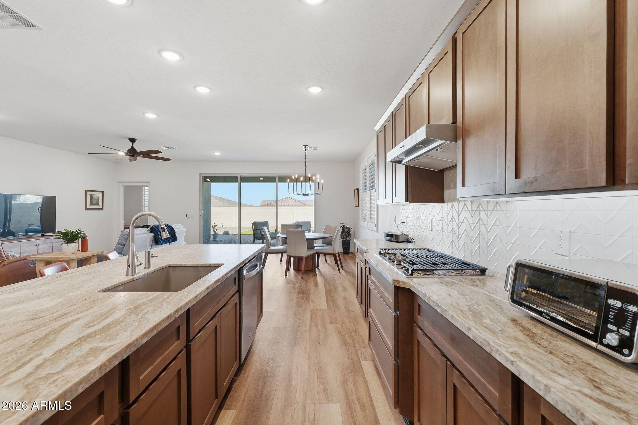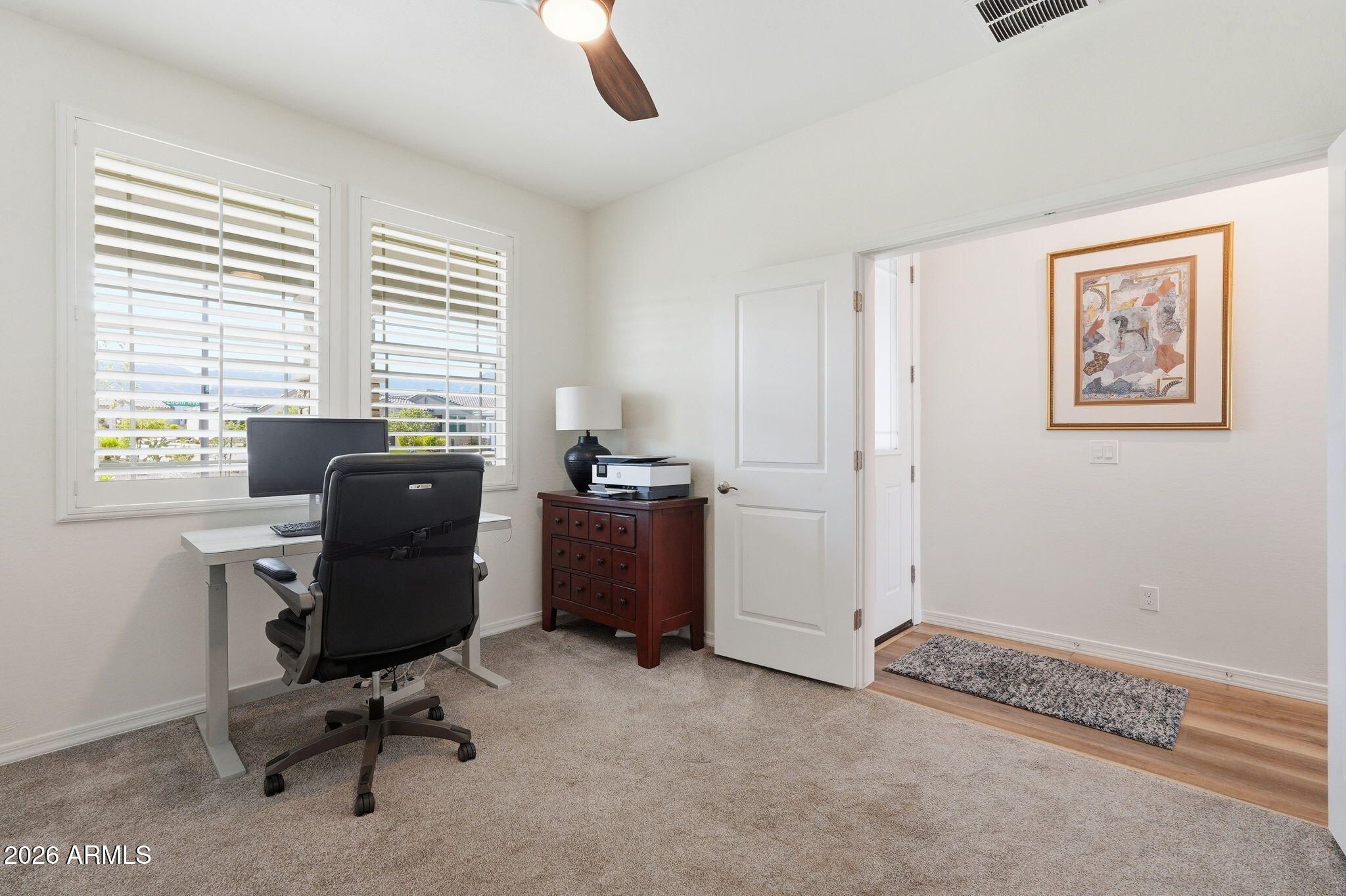 Welcome to this stunning upgraded Sawgrass floorplan by William Ryan Homes, nestled in the highly sought-after 55+ Victory at Verrado community! White Tank Mountain views! This 2-bedroom plus den residence features an open great room layout accented by elegant plantation shutters. The gourmet kitchen is a chef's dream, boasting shaker cabinetry, a gas cooktop, wall ovens, a butler's pantry & a large island. The private master retreat offers a dual-sink vanity & an oversized tiled shower with bench seating. Guests will appreciate the spacious 2nd bedroom with a walk-in closet & en-suite bath. Outside, sliding doors lead to a covered patio & a landscaped backyard with no rear neighbors!!! Complete with a large laundry room and a 2-car garage, this home is the ultimate desert sanctuary