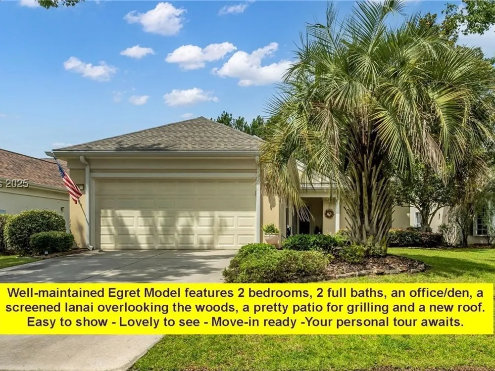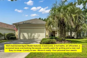This well-maintained Egret model home is located on a quiet street. A new roof was installed in 2024. The property features 2 bedrooms, 2 full bathrooms, an office/den, and a screened lanai. Enjoy your favorite beverage from the beautiful screened-in lanai overlooking the woods. There is also a pretty patio area outside where you can grill. Perfect for your own enjoyment or for entertaining family and/or friends. This lovely home is ready for immediate occupancy. Just move in any enjoy the good life in Sun City all year round.