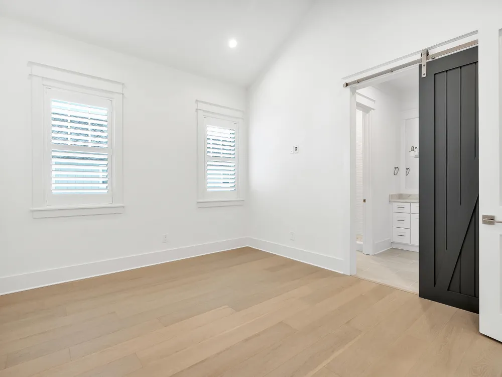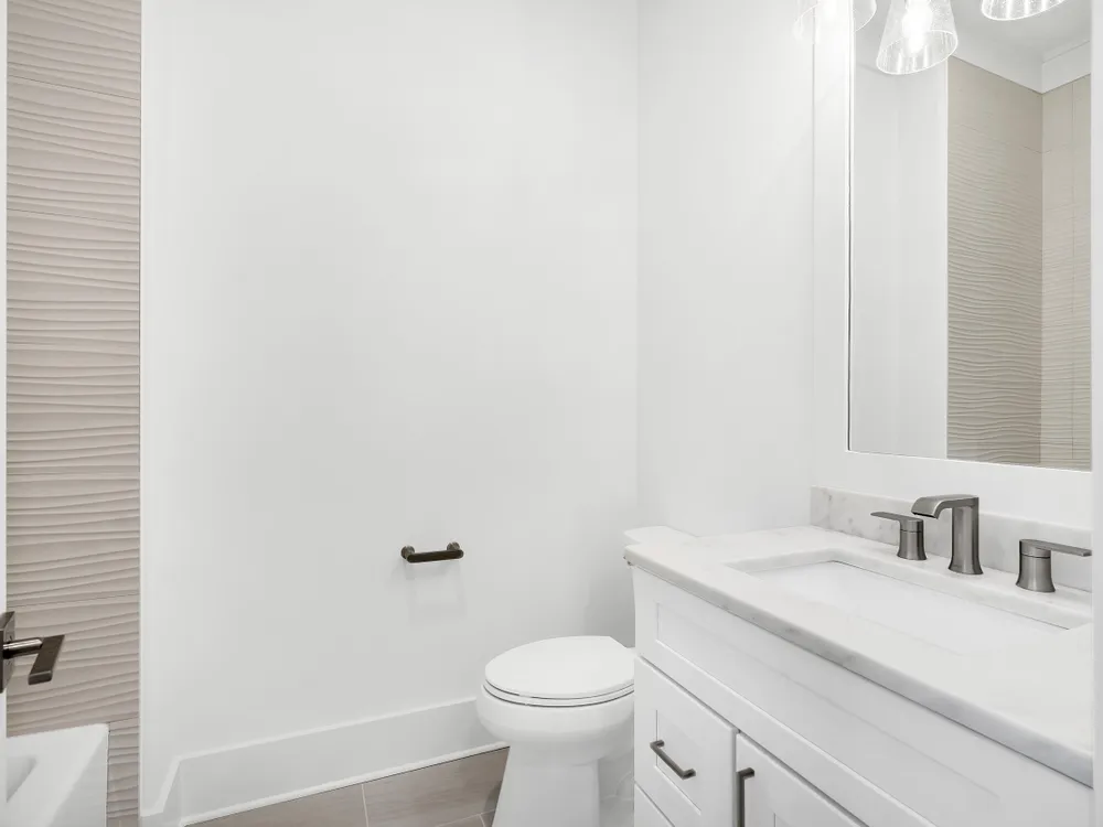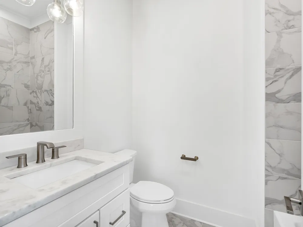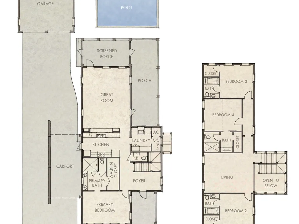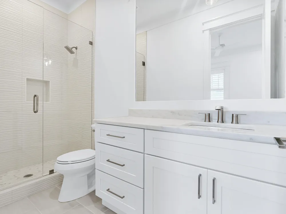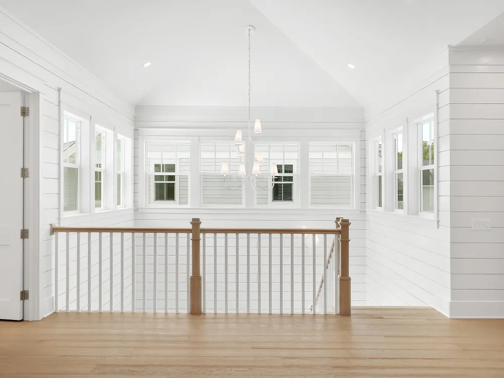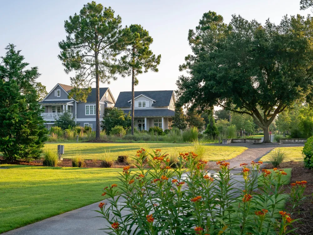 This exceptional Topsail Plan by Cole Construction offers luxury, comfort, and function in the highly sought-after Greenway phase. Move-in ready and in like-new condition, the main home features 4 bedrooms, 4.5 baths, and a separate 1 bed/1 bath carriage house with full kitchen - ideal for guests or extended family. Step into a grand entryway with soaring statement ceilings that set the tone for the elegant interiors. The open-concept main level boasts 12' ceilings, engineered wood flooring, shiplap throughout the common areas, quartz countertops, and a GE Monogram appliance package in the chef's kitchen. The first-floor primary suite includes a luxurious ensuite with a spacious walk-in tiled shower.