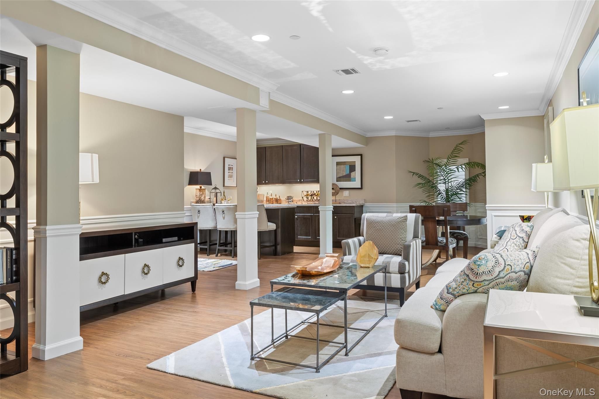 Have you been waiting for a ground-floor unit at The Seasons of Seaford? This is your opportunity to own the original MODEL UNIT, complete with every upgrade and luxury feature. This absolutely stunning home stands out from the rest. In addition to the standard two-bedroom, two-bath layout, it features high ceilings with elegant crown moldings, recessed lighting, an open-concept kitchen with a marble backsplash, and gleaming hardwood floors. The beautifully finished basement doubles your living space, offering an additional half bath, detailed wainscoting, and an entertainer’s dream bar with built-in cabinetry and granite countertops. Every available upgrade is included. All of this is ideally situated in a prime location, featuring a private patio overlooking the pool. The Seasons of Seaford, a 62+ community, offers resort-style living at its finest.