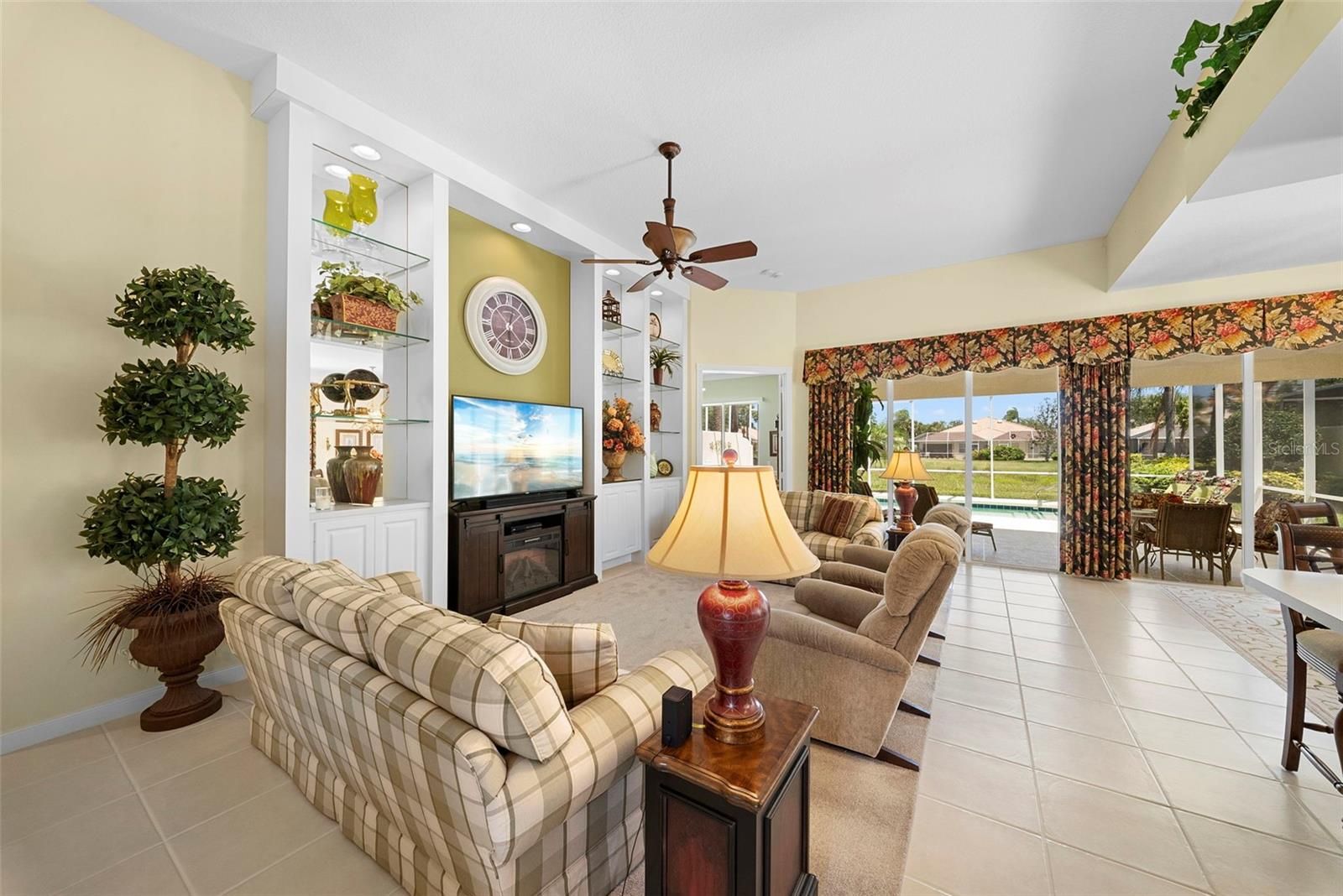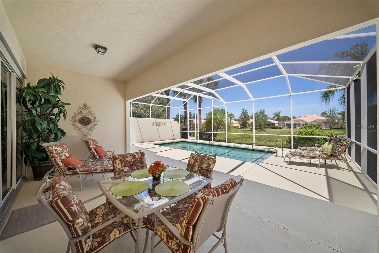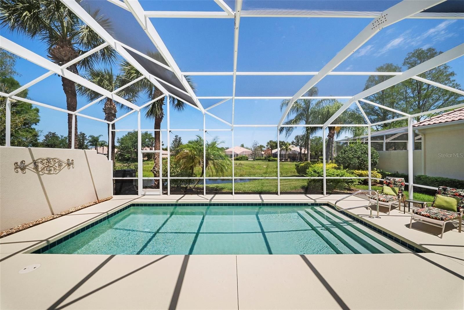 Welcome to your slice of Florida paradise in the highly desirable community of VillageWalk. This meticulously maintained Oakmont model home features 3 bedrooms plus a den, offering both comfort and flexibility. Inside, you’ll find tile flooring throughout the main living areas and new carpet in the den and guest bedrooms, along with elegant decorative molding and soaring 10- and 12-foot ceilings that enhance the spacious feel. The living room showcases a custom wall unit with fireplace, creating a warm and inviting focal point. The kitchen is equipped with stainless steel appliances just one year old, making it truly move-in ready. Offered turnkey furnished, this home allows for an effortless transition—just bring your suitcase. A golf cart is also included, perfect for enjoying the community. Step outside to your private retreat featuring a heated pool and expansive lanai, ideal for relaxing or entertaining year-round, with a newer pool heater for added comfort. Additional features include central vacuum and attic storage for convenience. Life in VillageWalk means enjoying a full suite of resort-style amenities, including six Har-Tru tennis courts, pickleball and bocce ball courts, a resort-style pool and separate lap pool, and an on-site restaurant with tiki bar and outdoor dining. The community is beautifully designed with scenic lakes, charming bridges, and lush landscaping, and also offers a fitness and activities calendar, social events, a hair salon, boutique, and the added benefit of an on-site manager and events coordinator, all within a 24-hour guard-gated setting. The HOA fees are reasonable and include landscaping, irrigation, gate security, and access to all amenities. Ideally located in Palmer Ranch, you’re just minutes from shopping at Costco Wholesale and Publix, as well as top-rated dining, arts, medical facilities, world-renowned beaches, and the scenic Legacy Trail. This home offers the perfect combination of comfort, convenience, and vibrant community living.