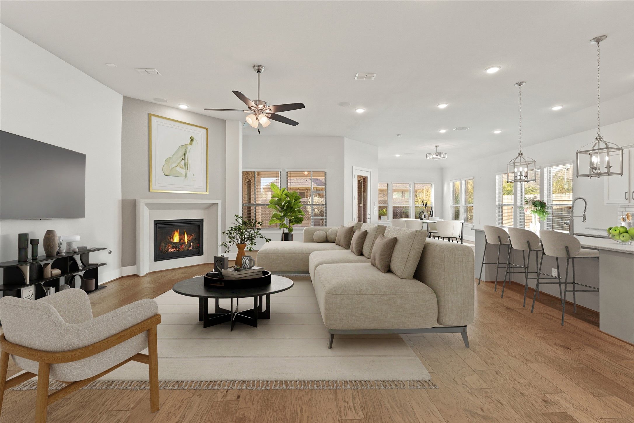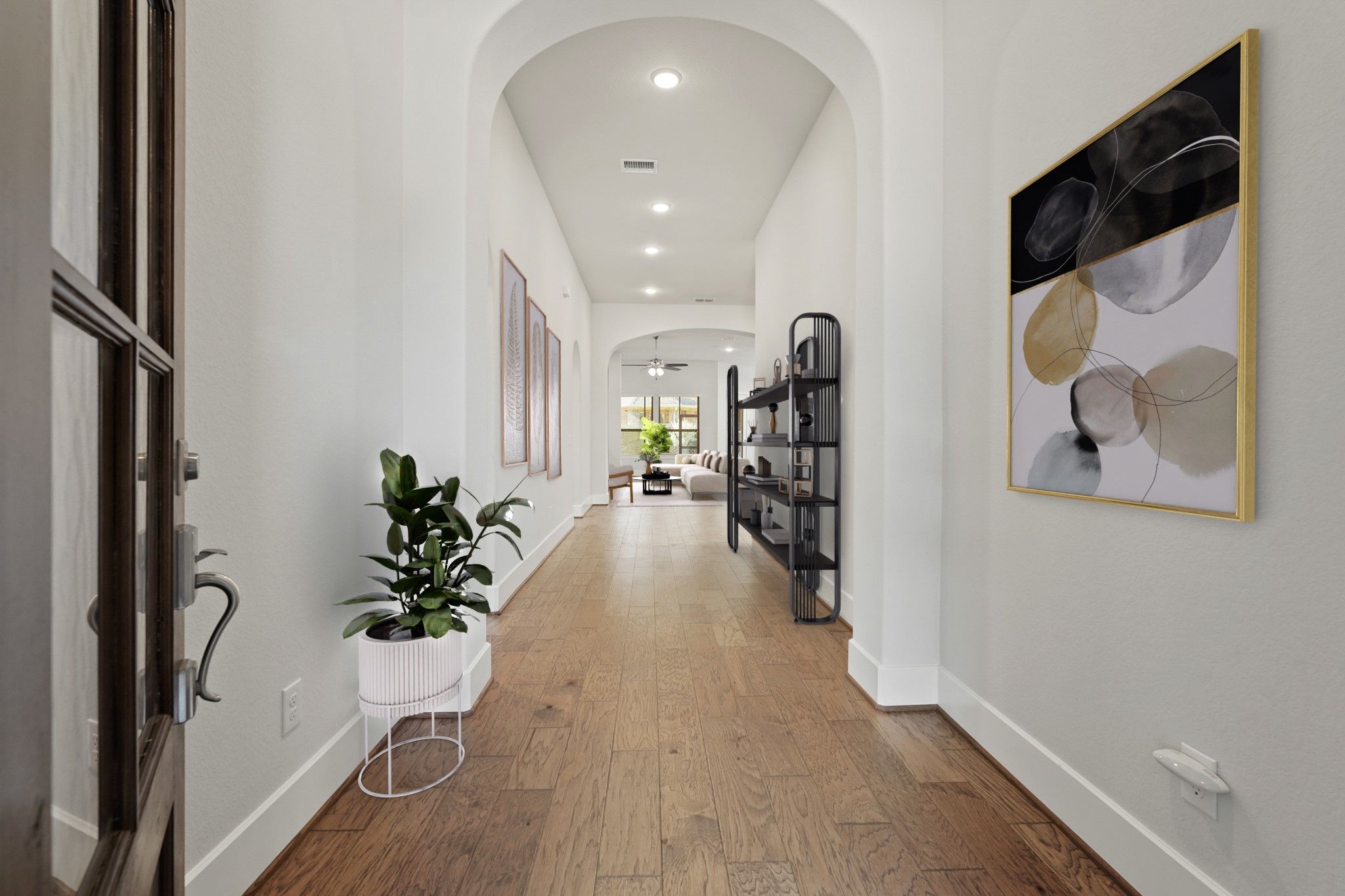 This elegant 1 story Darling Home showcases timeless brick & stone architecture and a beautiful open-concept layout. A grand hallway with arched entry leads to the spacious living area featuring wood floors, abundant natural light, and a sleek modern fireplace. The gourmet kitchen is a chef’s dream with quartz countertops, upgraded Bosch appliances, and a generous island perfect for entertaining. Primary suite has large vanity with double sinks, spacious shower, and a beautiful chandelier in closet. Upgrades include a 24w Generac Generator, water softener & filter (2-stage), replaced A/C with a very high efficiency A/C & furnace, removable solar screens, French drains, screened porch, new paint and much more. Ask to see upgrade list. Enjoy resort-style community amenities with convenient access to shops, dining, and major highways. Impeccably maintained and move-in ready—this is luxury living redefined in Bonterra at Cross Creek Ranch 55+ Community.
