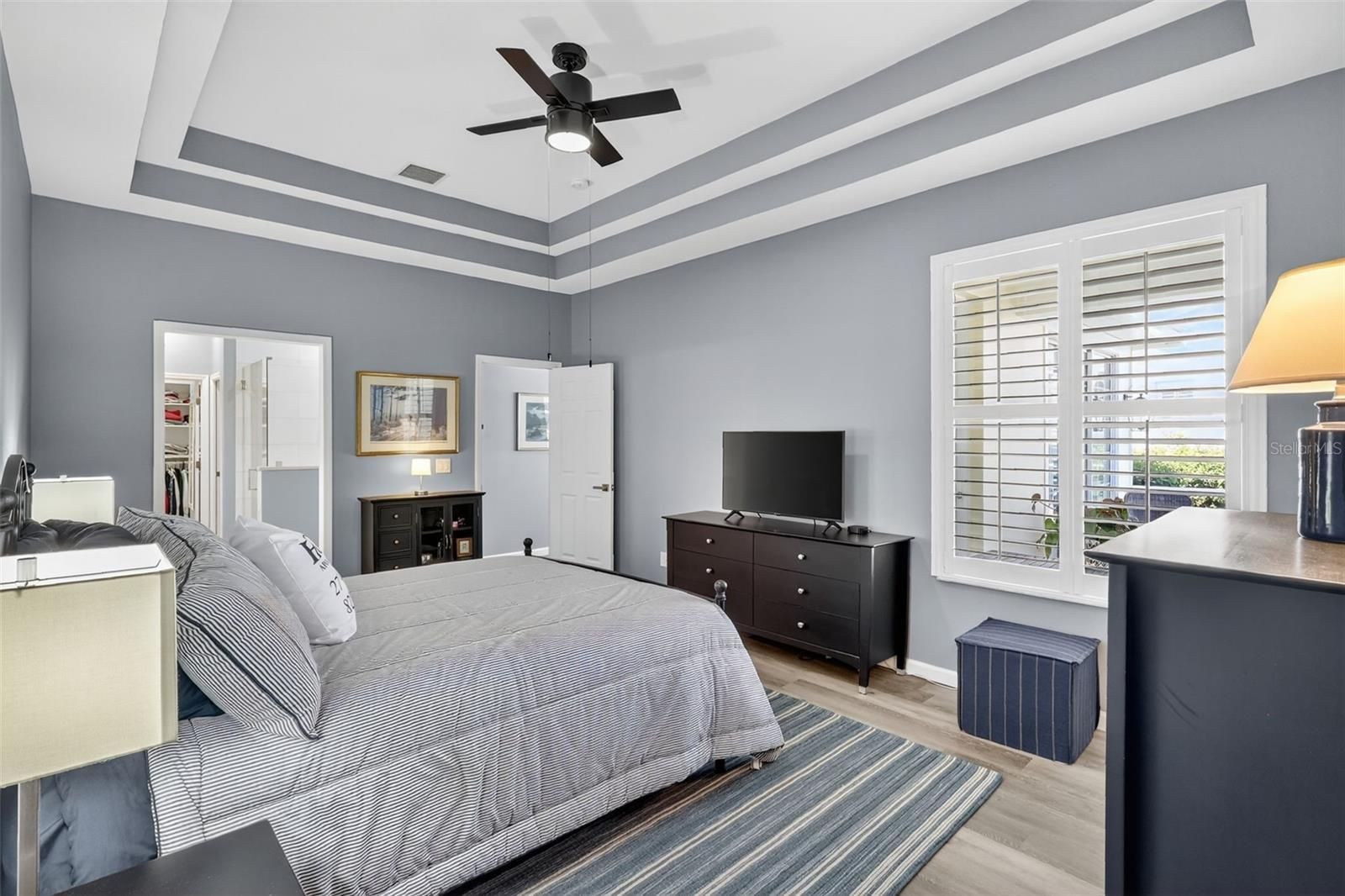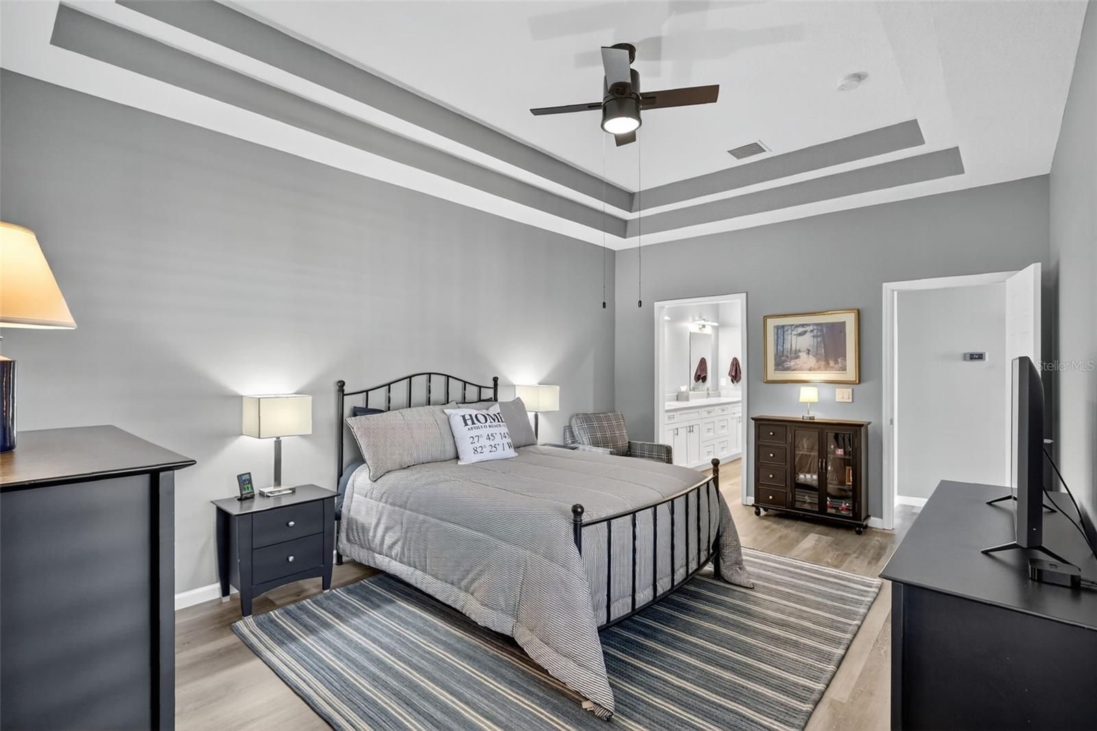 - Ceiling Fan(s), Crown Molding, Eat-in Kitchen, Kitchen/Family Room Combo, Solid-Wood Cabinets, Stone Counters, Thermostat, Tray Ceiling(s)