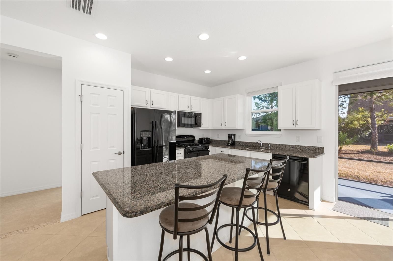 - Ceiling Fan(s), Eat-in Kitchen, High Ceilings, Kitchen/Family Room Combo, Open Floorplan, Main Level Primary, Solid-Wood Cabinets, Split Bedrooms, Stone Counters, Thermostat, Walk-In Closet(s), Window Treatments