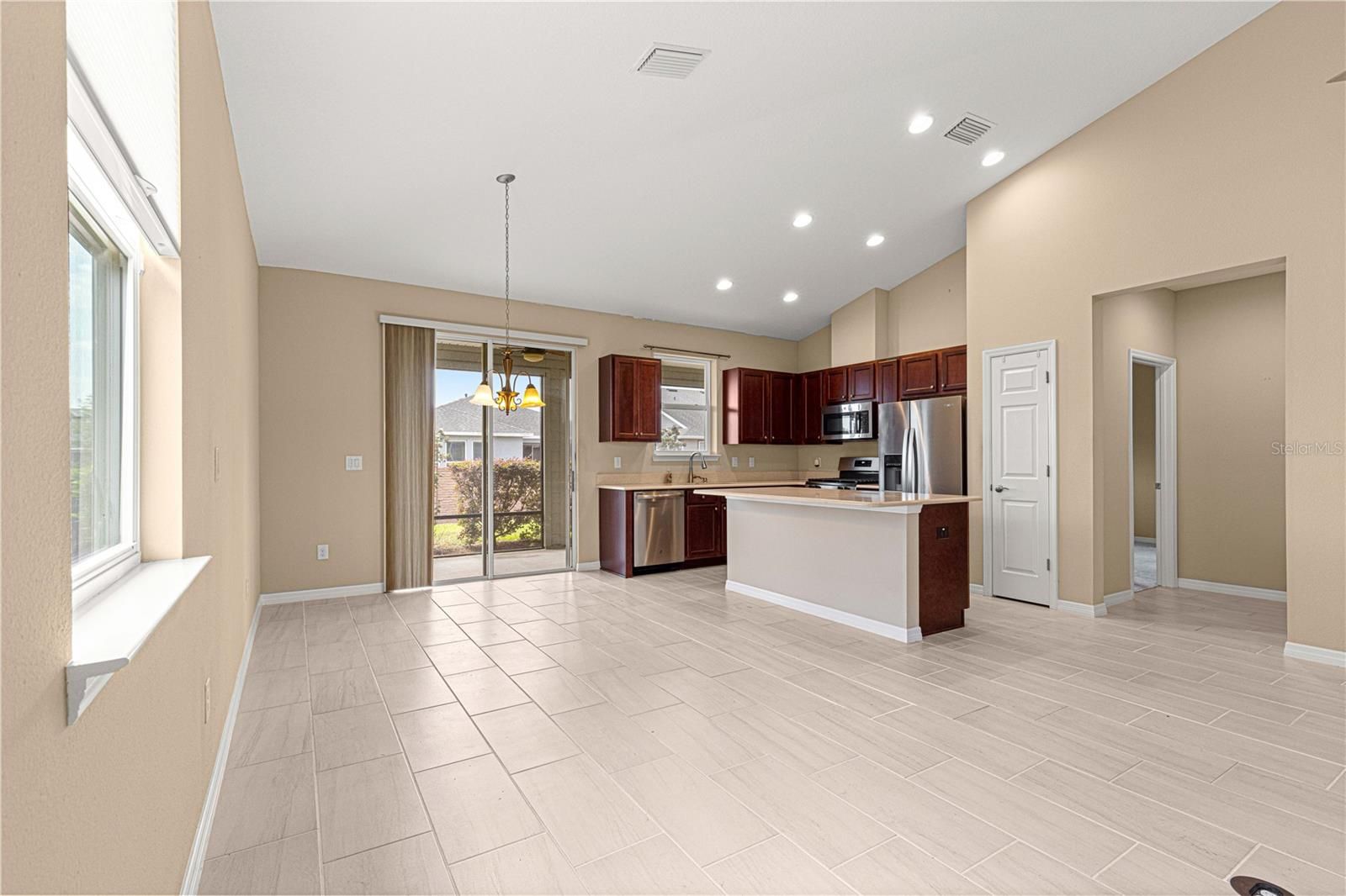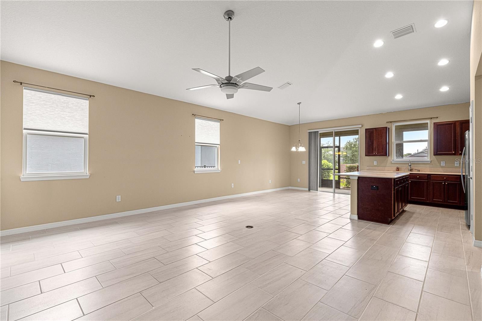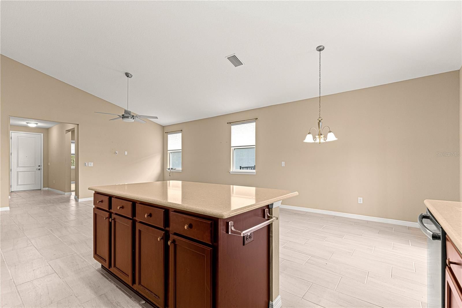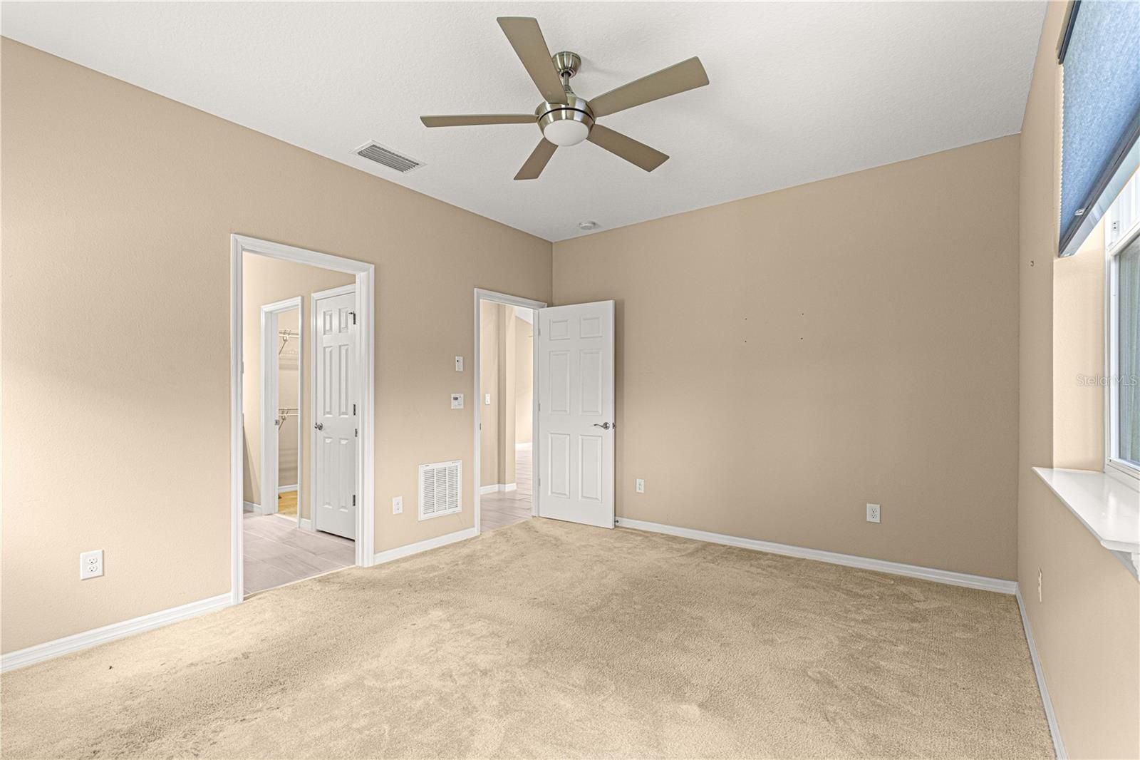 - Ceiling Fan(s), Eat-in Kitchen, High Ceilings, Living/Dining Room, Open Floorplan, Main Level Primary, Split Bedrooms, Stone Counters, Thermostat, Walk-In Closet(s), Window Treatments
