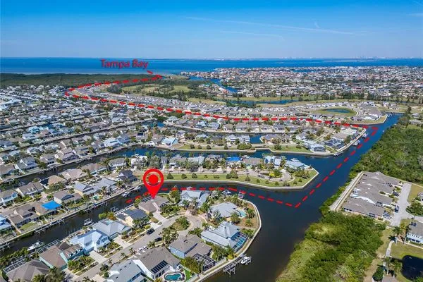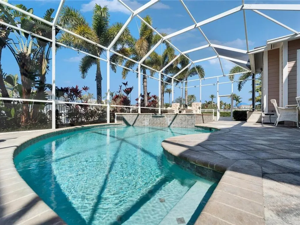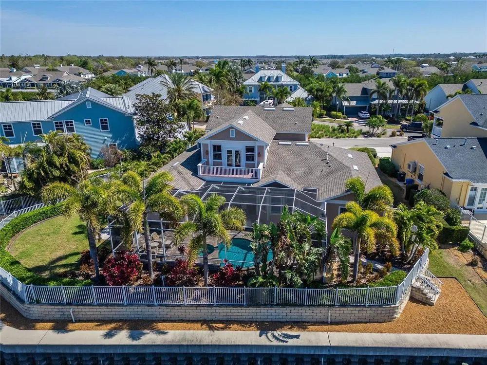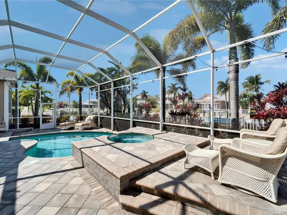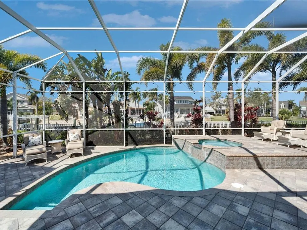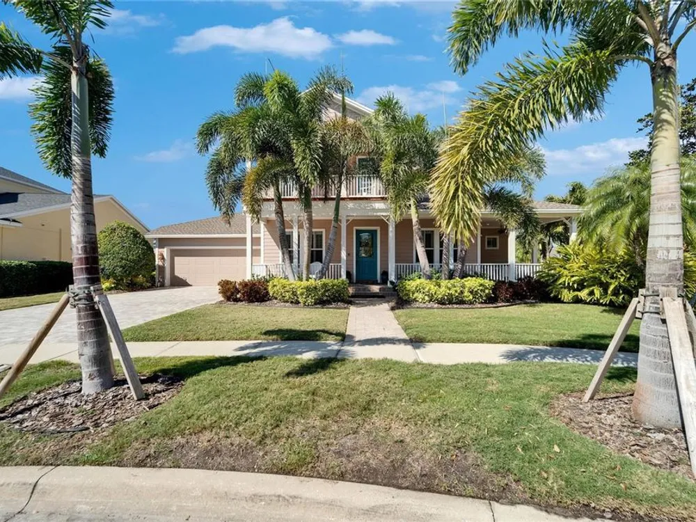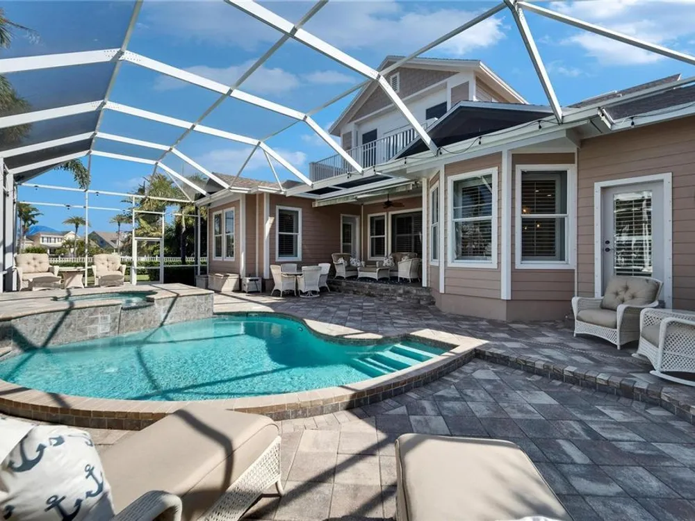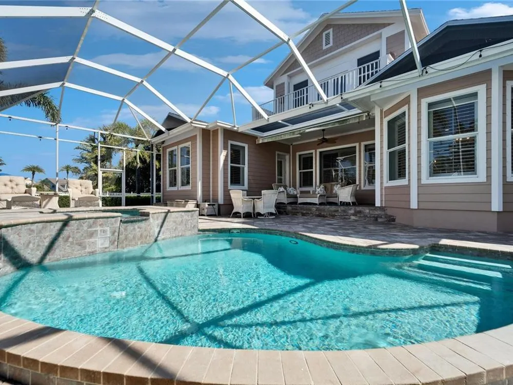 5616 Seagrass Place | Gulfview Floorplan 4 Beds | 4 Baths | Den + Loft | 3,618 Sq Ft | Oversized Lot with 140’ Waterfront | Former Model by Sabal 5616 Seagrass Place is a former model home built by Sabal featuring the sought-after Gulfview floorplan on an oversized pie-shaped lot with over 140 feet of direct waterfront—nearly double the frontage of most homes in the community. Located across from a landscaped community greenbelt, this home offers added privacy and space, including a fully landscaped side yard. The first floor includes the primary suite, a separate guest bedroom and bath, a formal office with built-ins and French doors to a private front porch, a large laundry room, and open living and dining areas. The kitchen was remodeled in 2024 with new appliances, quartz countertops, updated backsplash, under-cabinet lighting, a wrap-around bar, and a café-style dining space surrounded by windows overlooking the pool and water. A butler’s pantry connects the formal dining room and kitchen, along with a large walk-in pantry. The main living room features a gas fireplace and custom built-ins. Upstairs includes two additional bedrooms, one with a private bath and walk-in closet, a shared hallway bath, and a large loft with wet bar, wine fridge, custom trim, and deep plantation shutters. Two covered balconies provide water views—one facing east for sunrise, the other west for Tampa Bay sunsets. The screened-in outdoor living space features a heated saltwater pool and spa. The dock is equipped with water and electricity. The oversized 3-car garage includes a tandem bay for a golf cart or workshop, and the extended driveway has upgraded brick pavers. Recent updates include a full kitchen remodel (2024), upstairs bathrooms remodeled (2024), new roof (2020), new pool heater, recently replaced AC units, full-home plantation shutters, and an electric rear awning. The home has been pre-inspected for buyer peace of mind.