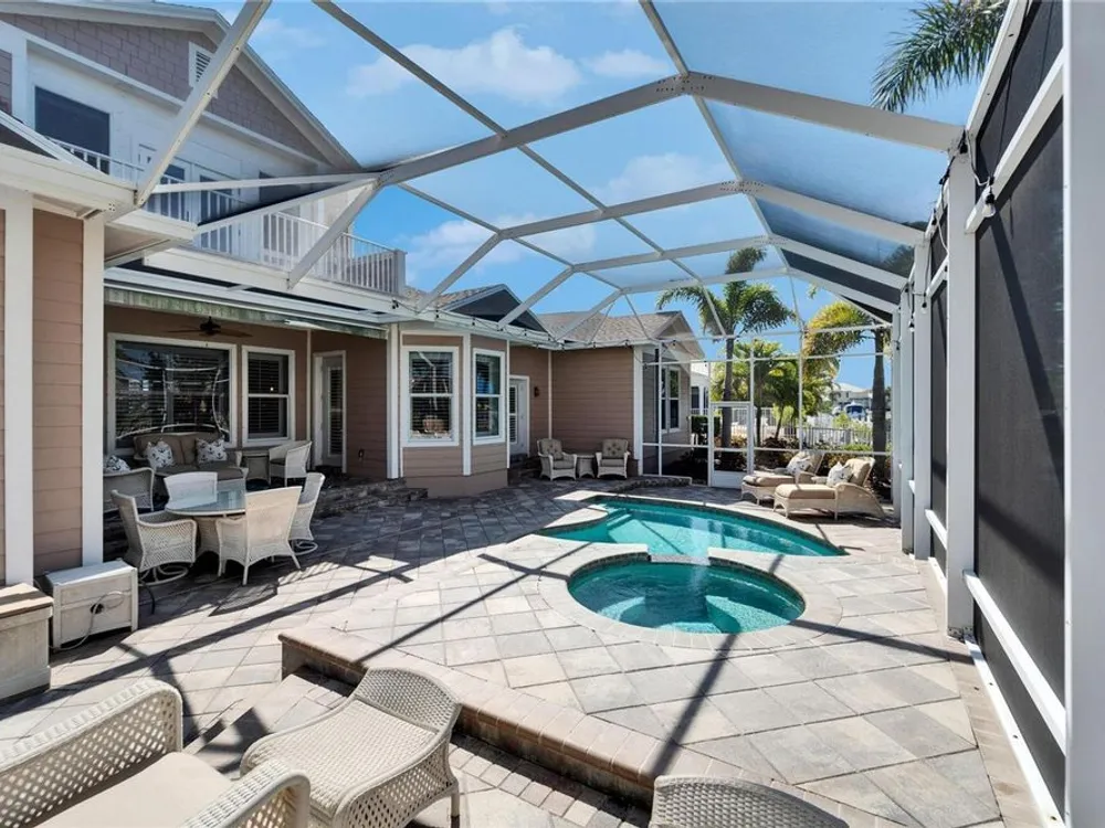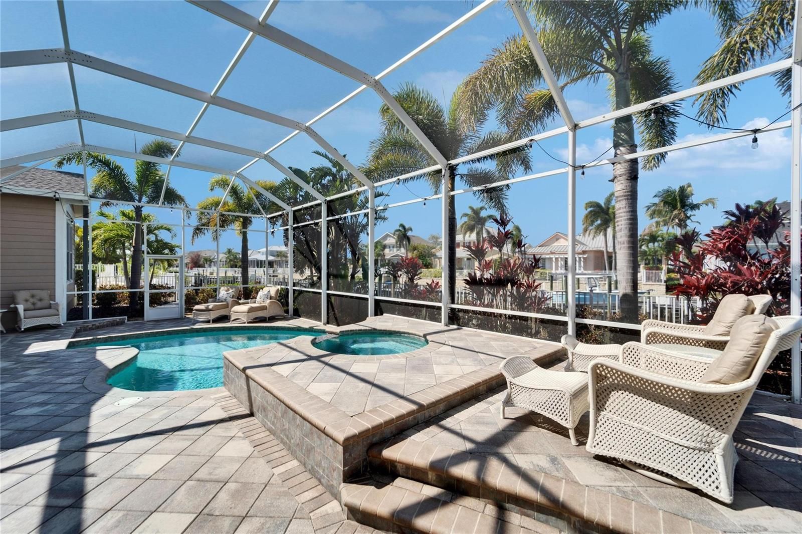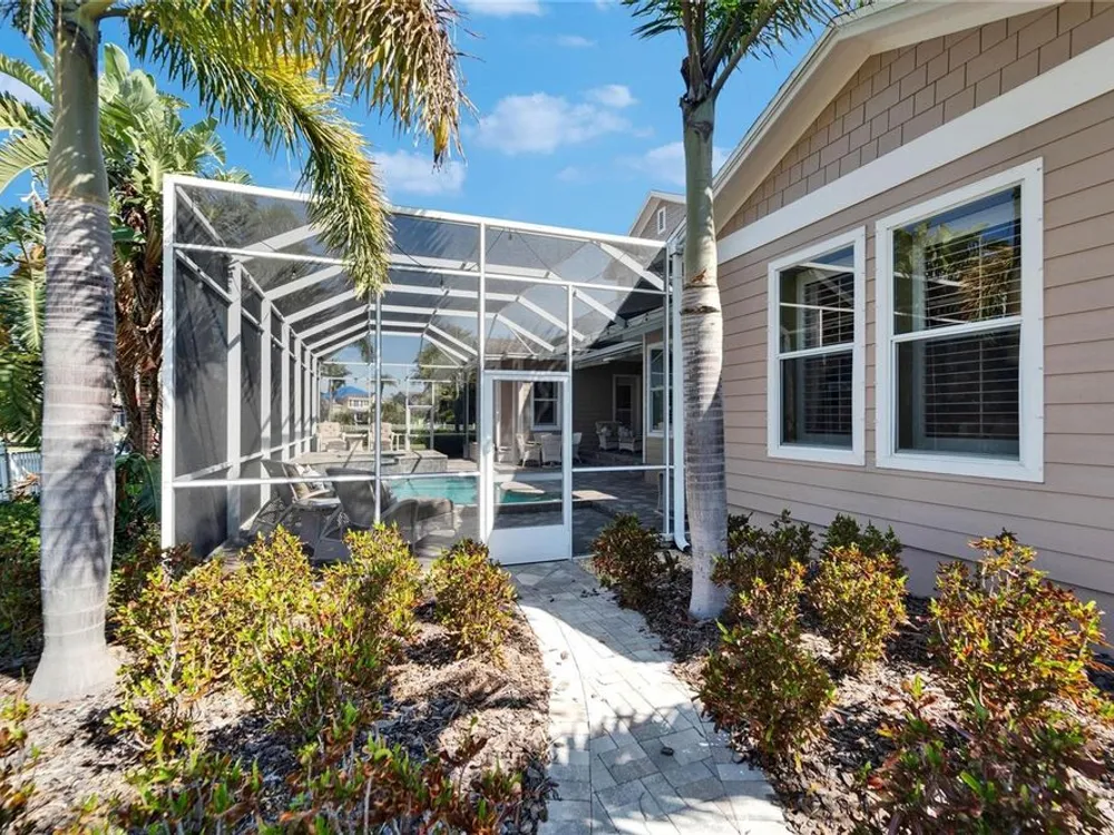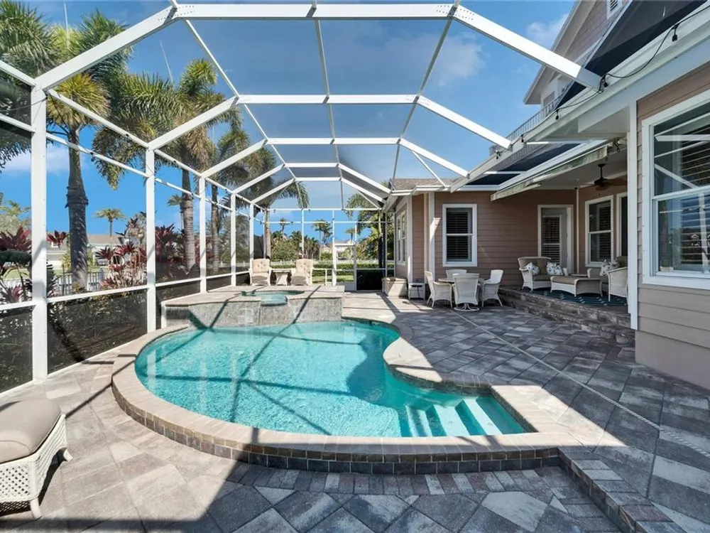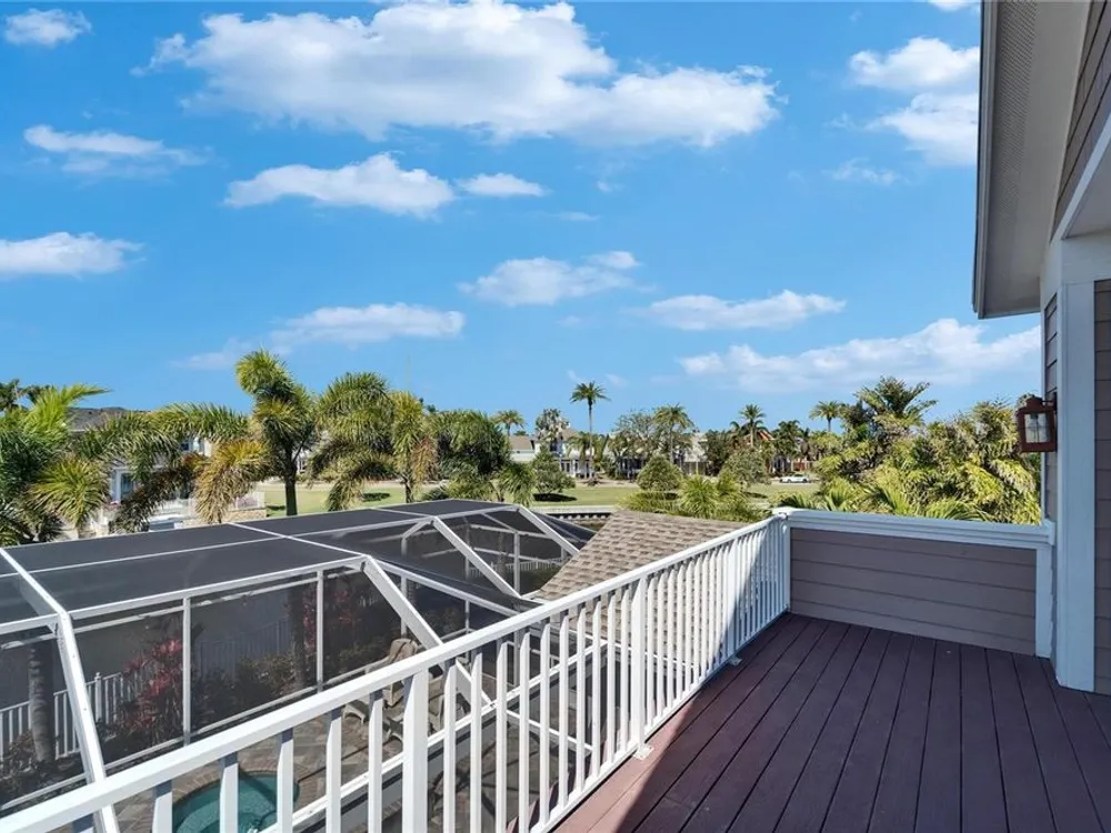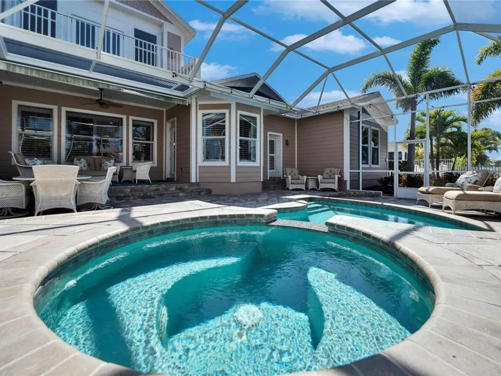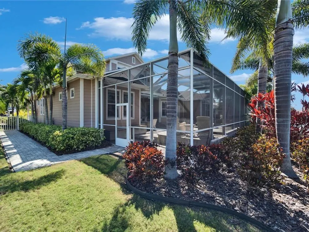 5616 Seagrass Place | Gulfview Floorplan 4 Beds | 4 Baths | Den + Loft | 3,618 Sq Ft | Oversized Lot with 140’ Waterfront | Former Model by Sabal 5616 Seagrass Place is a former model home built by Sabal featuring the sought-after Gulfview floorplan on an oversized pie-shaped lot with over 140 feet of direct waterfront—nearly double the frontage of most homes in the community. Located across from a landscaped community greenbelt, this home offers added privacy and space, including a fully landscaped side yard. The first floor includes the primary suite, a separate guest bedroom and bath, a formal office with built-ins and French doors to a private front porch, a large laundry room, and open living and dining areas. The kitchen was remodeled in 2024 with new appliances, quartz countertops, updated backsplash, under-cabinet lighting, a wrap-around bar, and a café-style dining space surrounded by windows overlooking the pool and water. A butler’s pantry connects the formal dining room and kitchen, along with a large walk-in pantry. The main living room features a gas fireplace and custom built-ins. Upstairs includes two additional bedrooms, one with a private bath and walk-in closet, a shared hallway bath, and a large loft with wet bar, wine fridge, custom trim, and deep plantation shutters. Two covered balconies provide water views—one facing east for sunrise, the other west for Tampa Bay sunsets. The screened-in outdoor living space features a heated saltwater pool and spa. The dock is equipped with water and electricity. The oversized 3-car garage includes a tandem bay for a golf cart or workshop, and the extended driveway has upgraded brick pavers. Recent updates include a full kitchen remodel (2024), upstairs bathrooms remodeled (2024), new roof (2020), new pool heater, recently replaced AC units, full-home plantation shutters, and an electric rear awning. The home has been pre-inspected for buyer peace of mind.